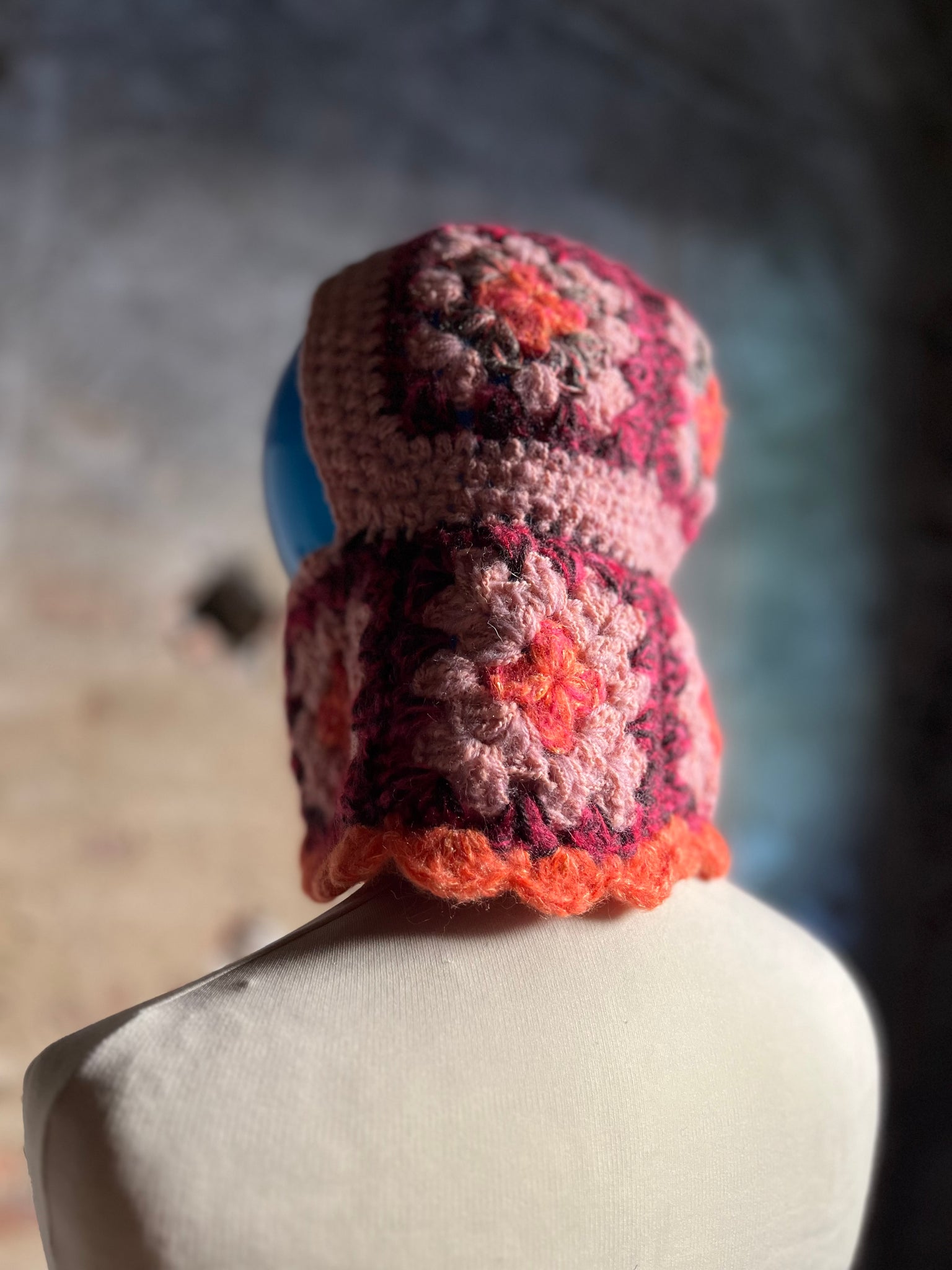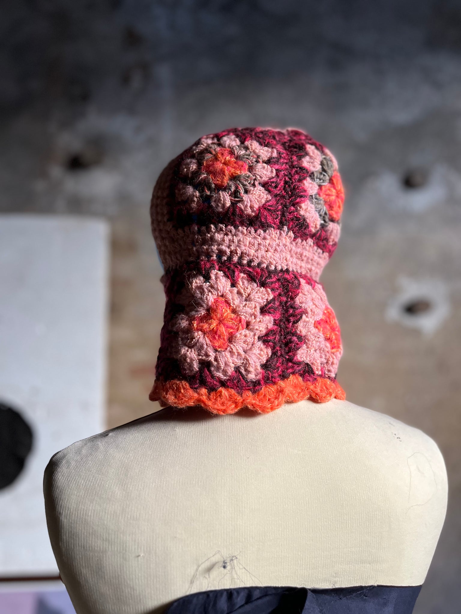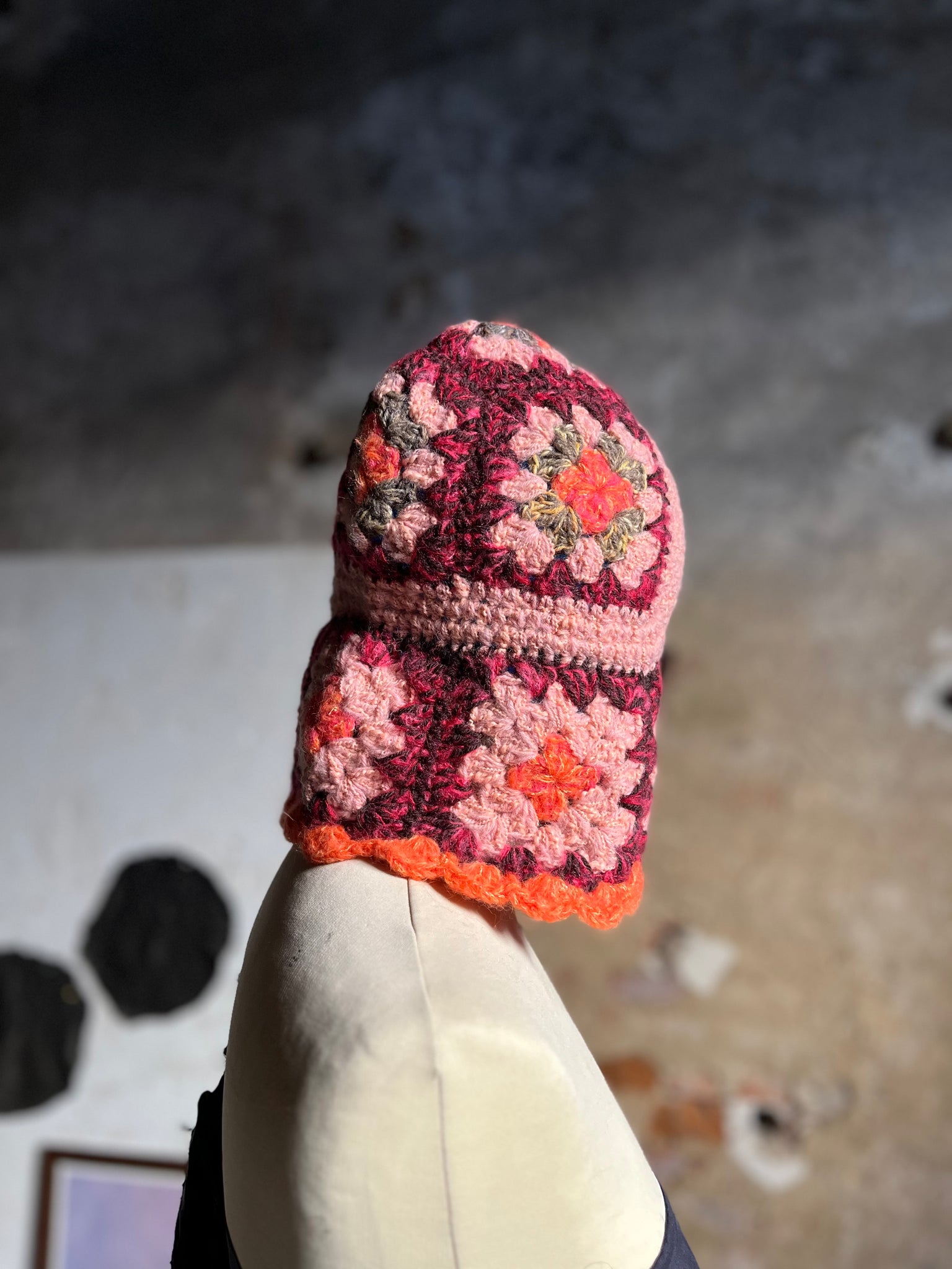 Copricapo a passamontagna in lana sui toni del rosa, bordeaux e arancio.