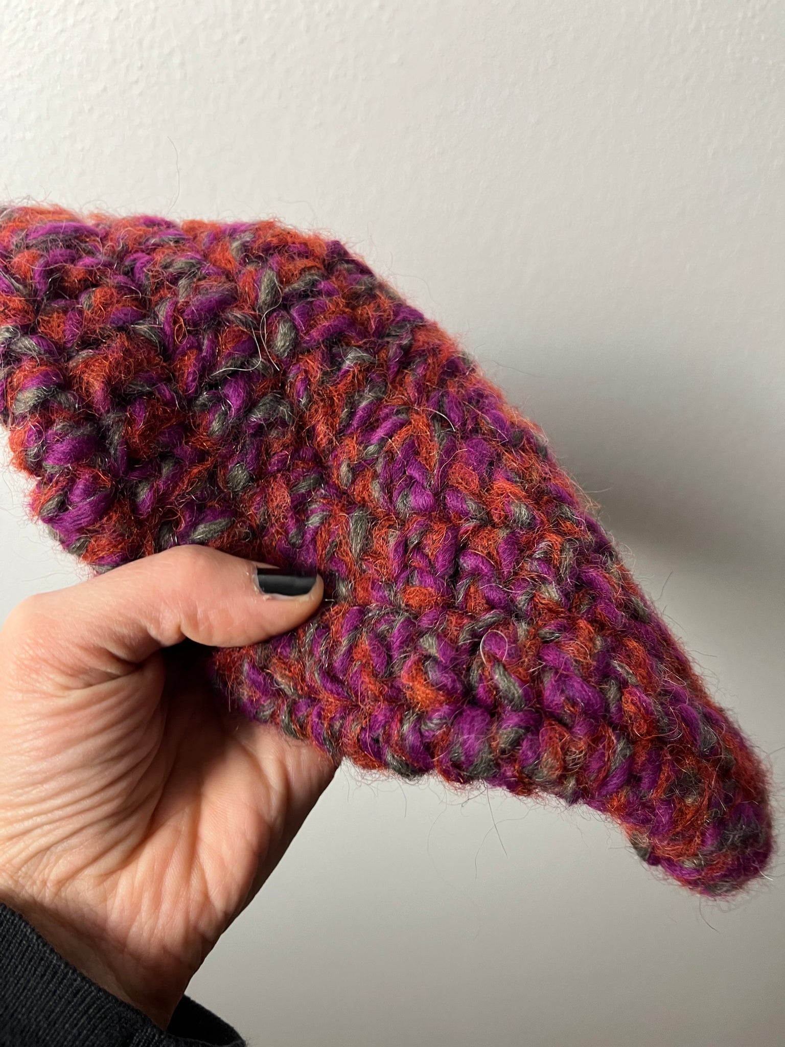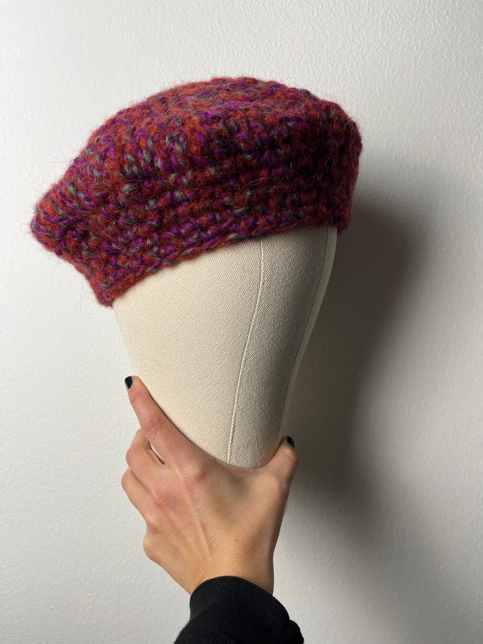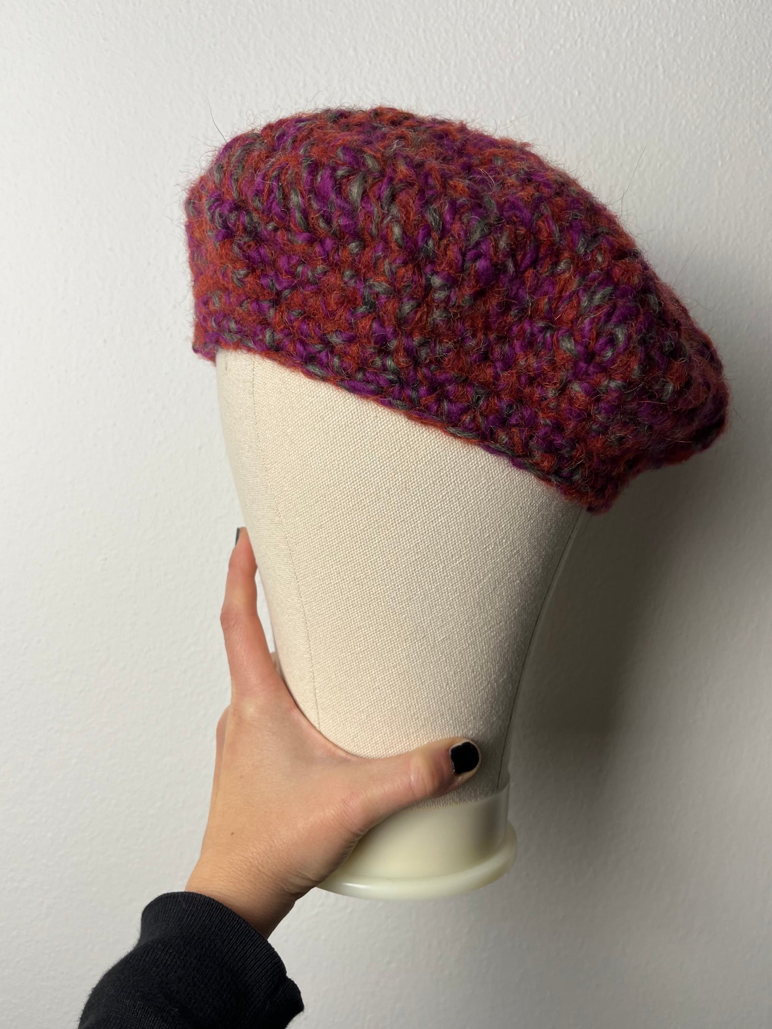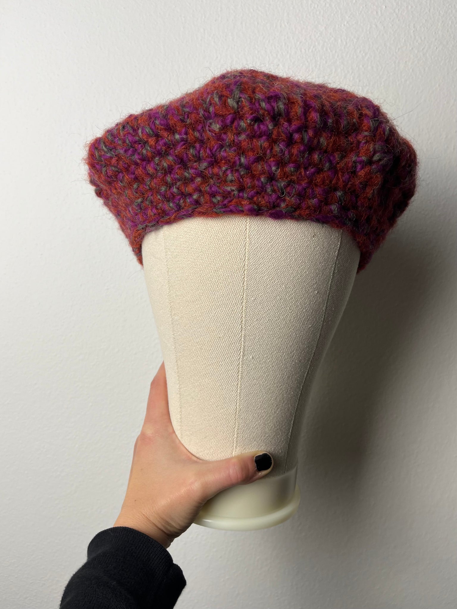 Basco in lana mista sui toni mattone, viola e tortora. Fatto a mano a uncinetto.