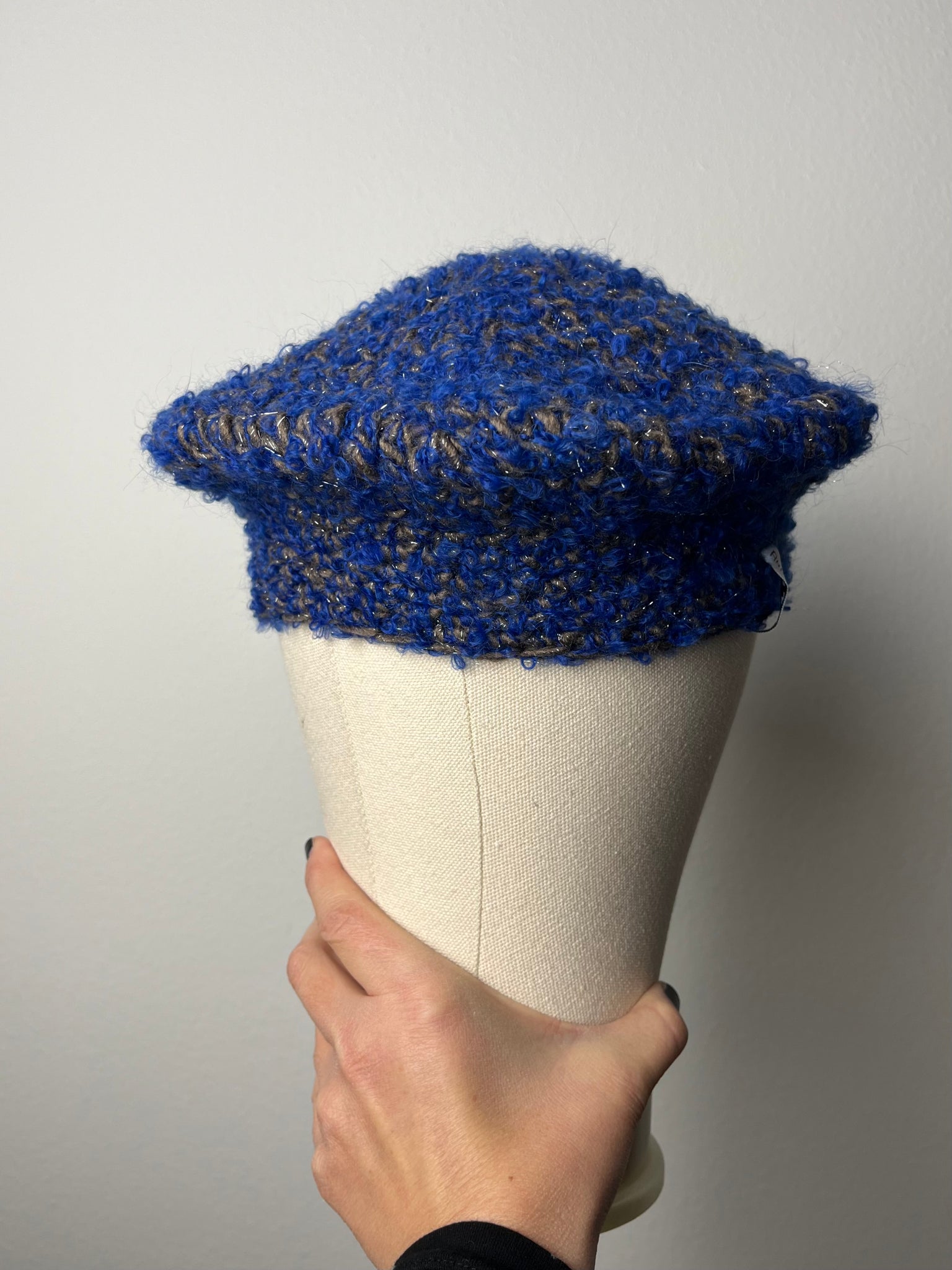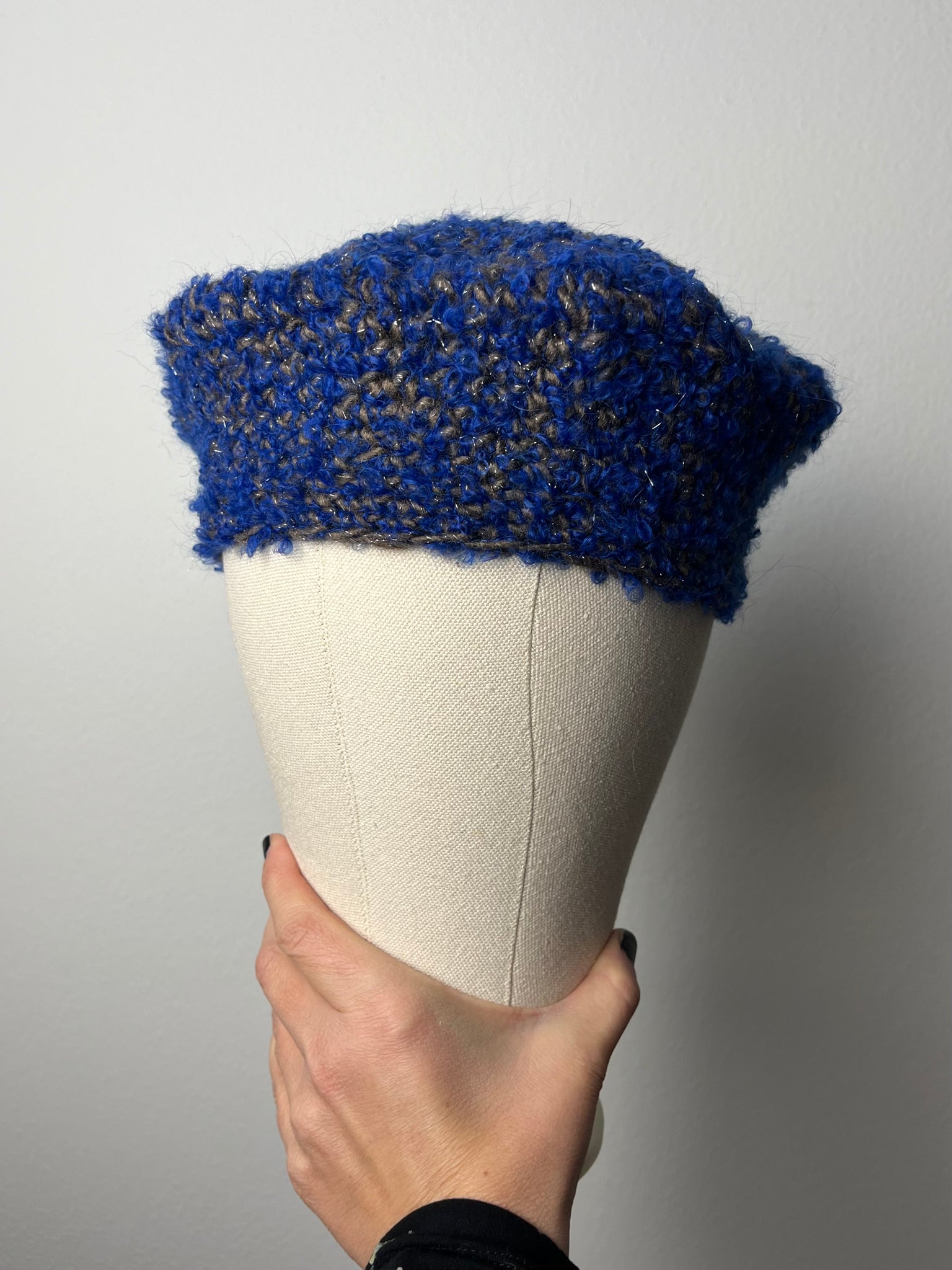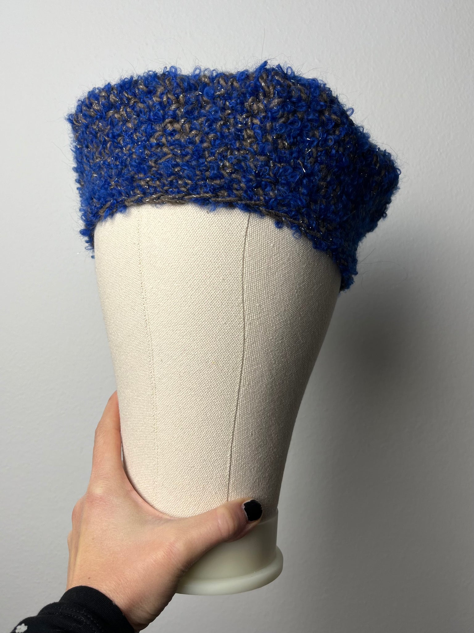 Basco in lana mista blu bouclé e tortora con filo in lurex argento. Fatto a mano a uncinetto.