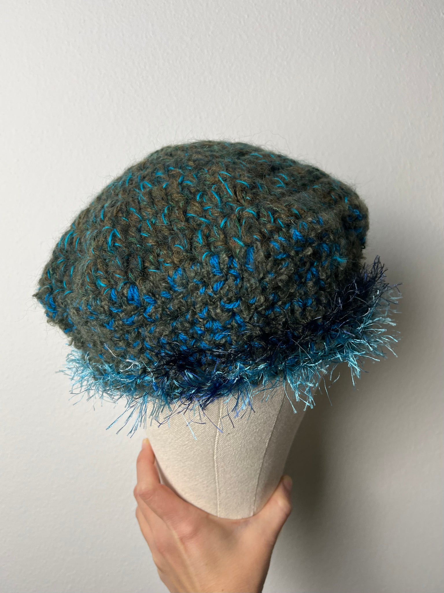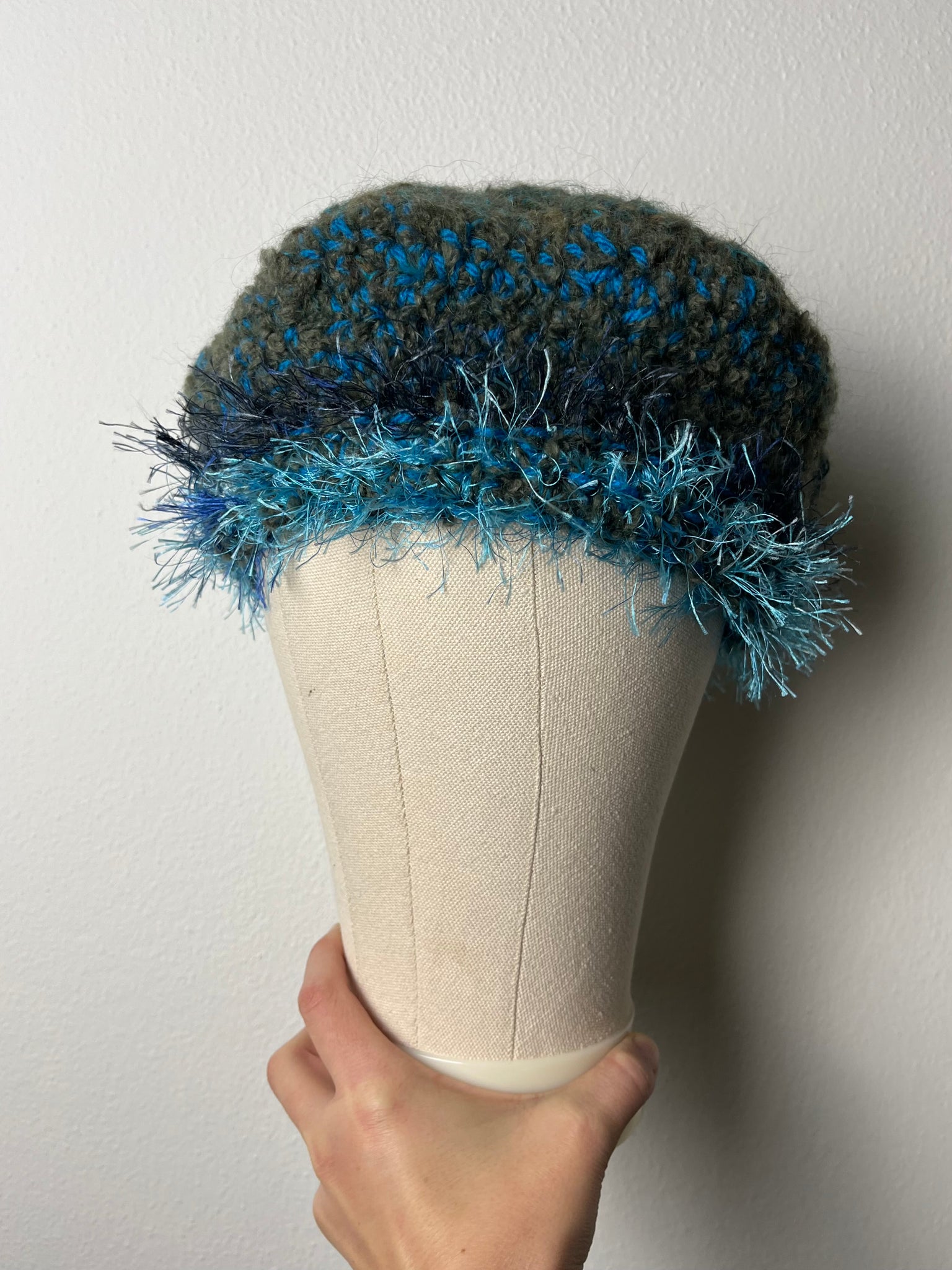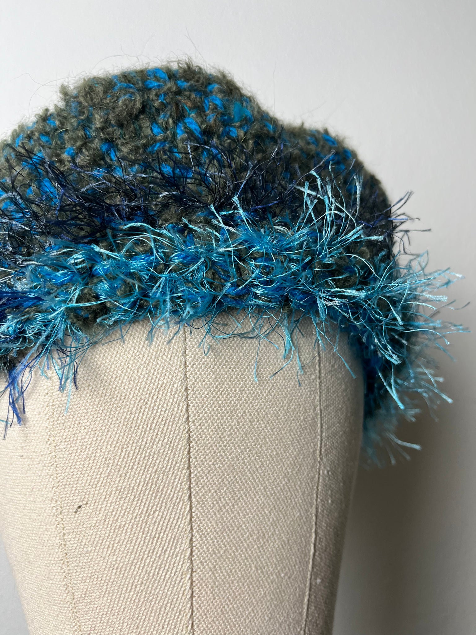 Basco in lana mista sui toni del verde bosco e filo celeste per ottenere l’effetto mélange. Frangetta in viscosa celeste/blu. Fatto a mano a uncinetto.