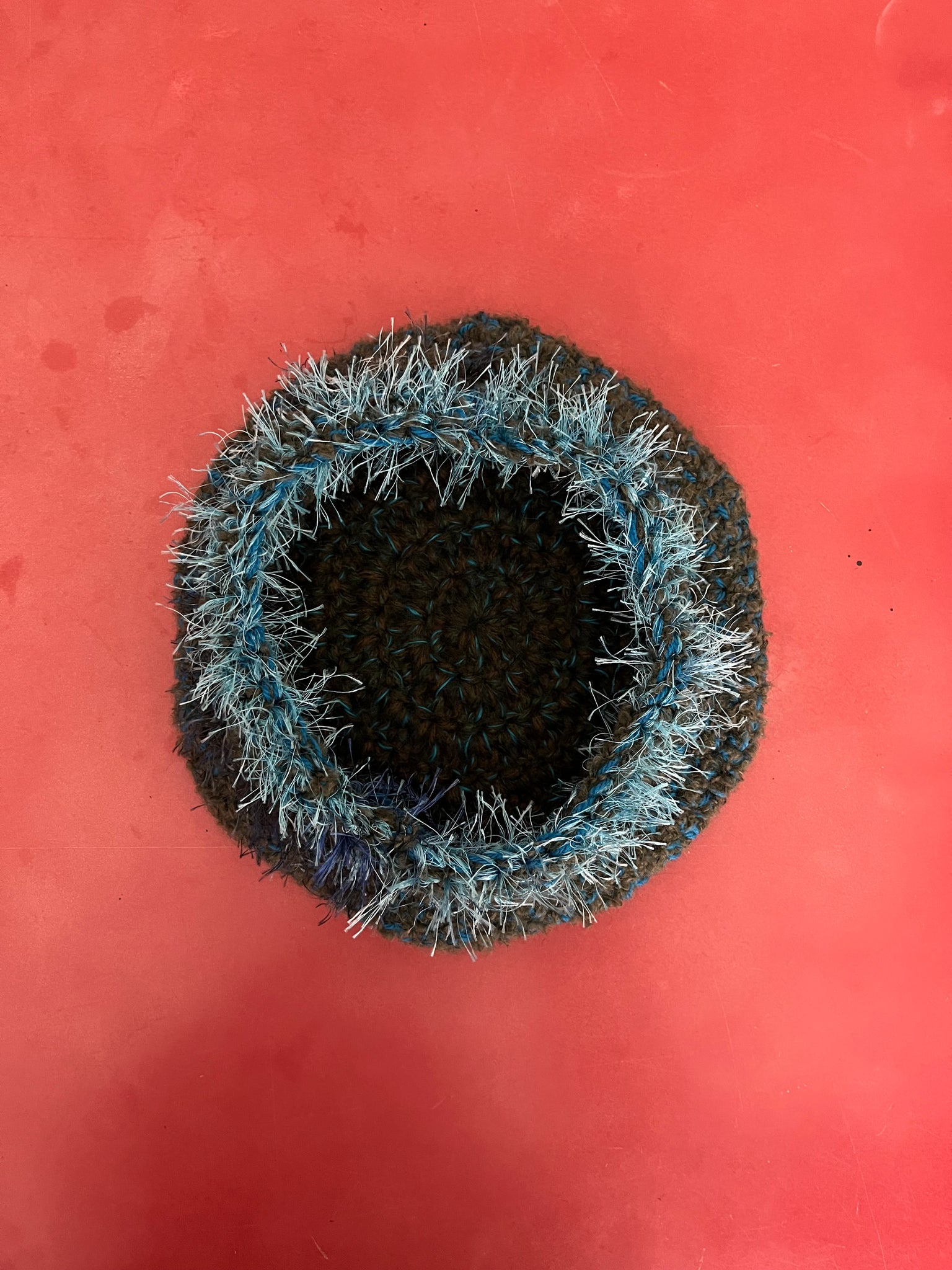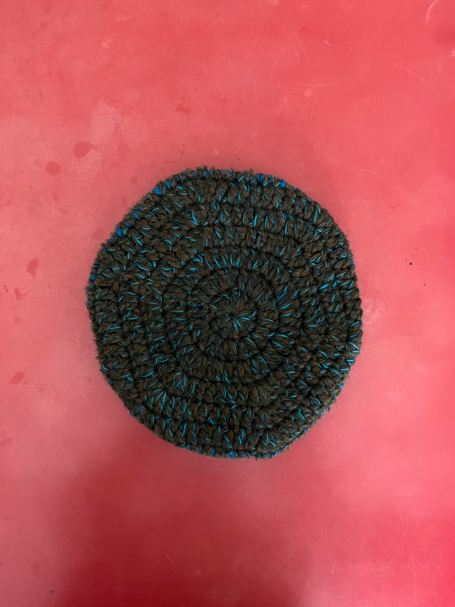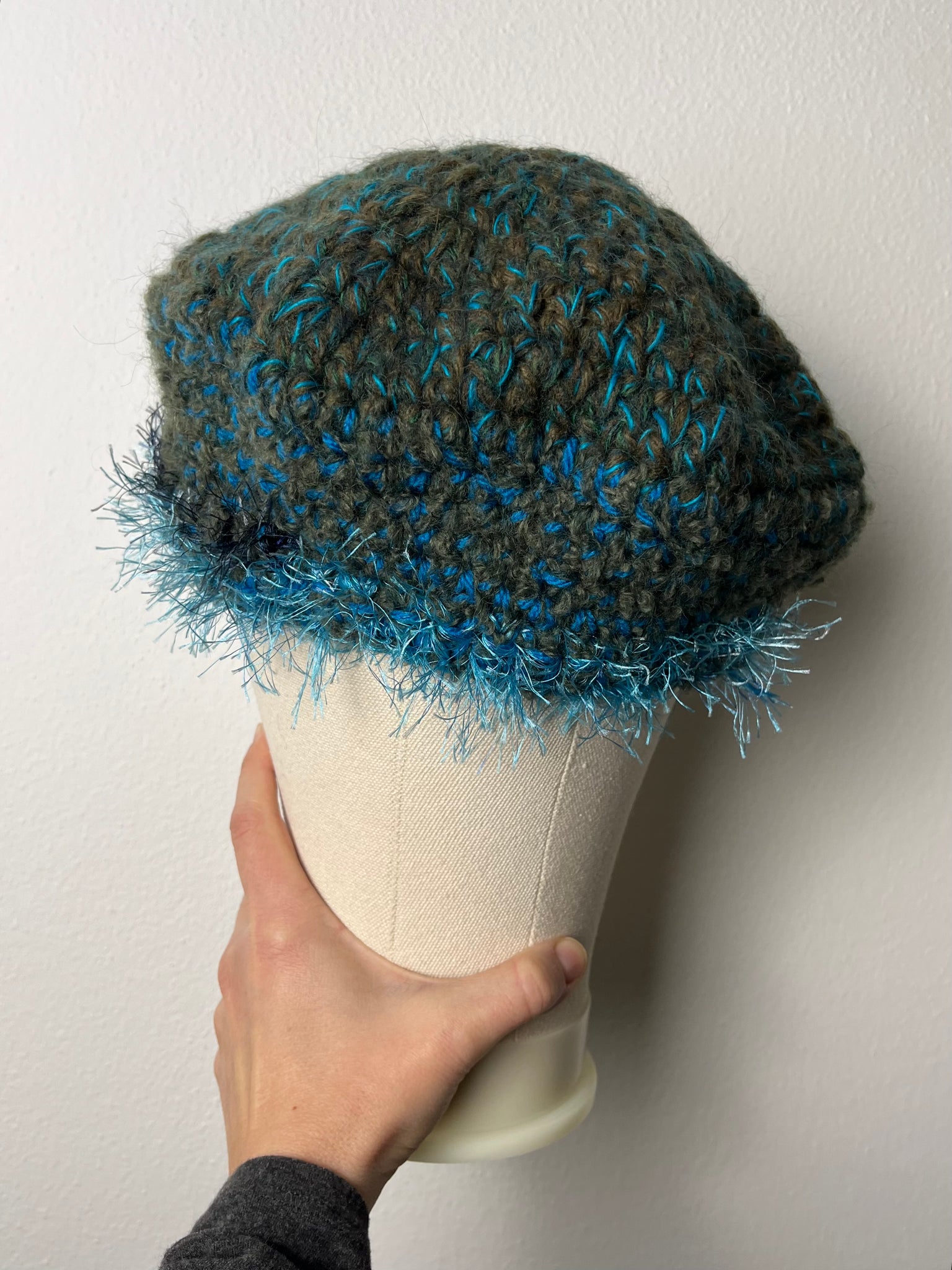 Basco in lana mista sui toni del verde bosco e filo celeste per ottenere l’effetto mélange. Frangetta in viscosa celeste/blu. Fatto a mano a uncinetto.