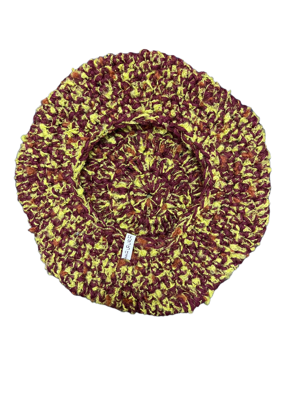 Cappello a basco in lana fatto a mano a uncinetto con un filo bouclé color cedro e uno vinaccia.