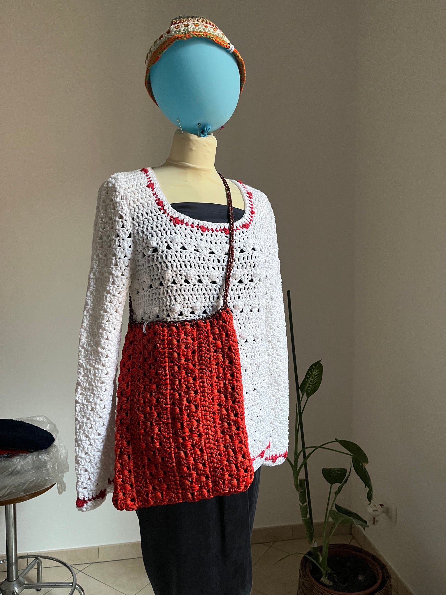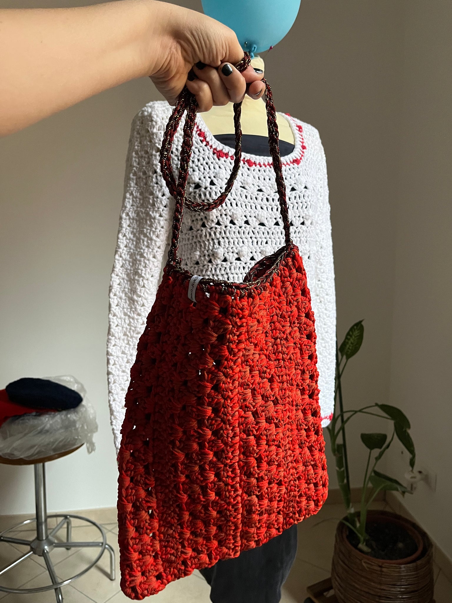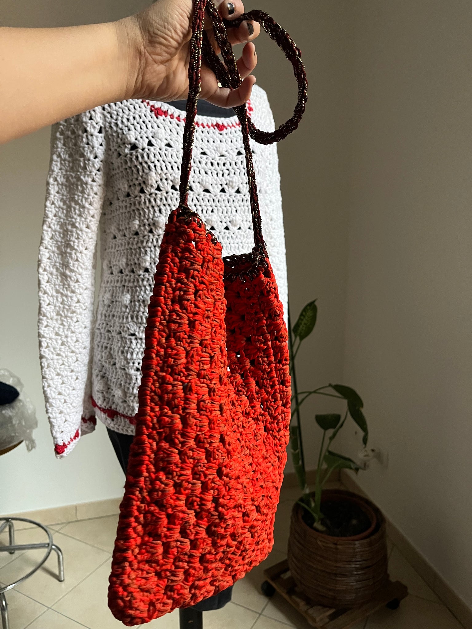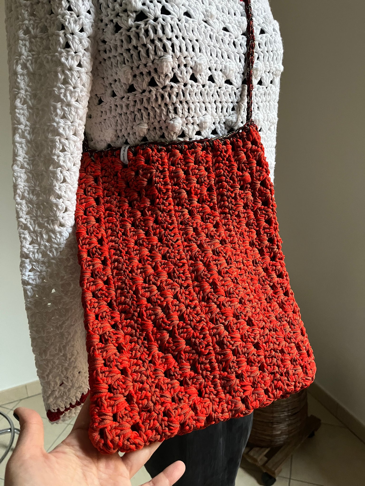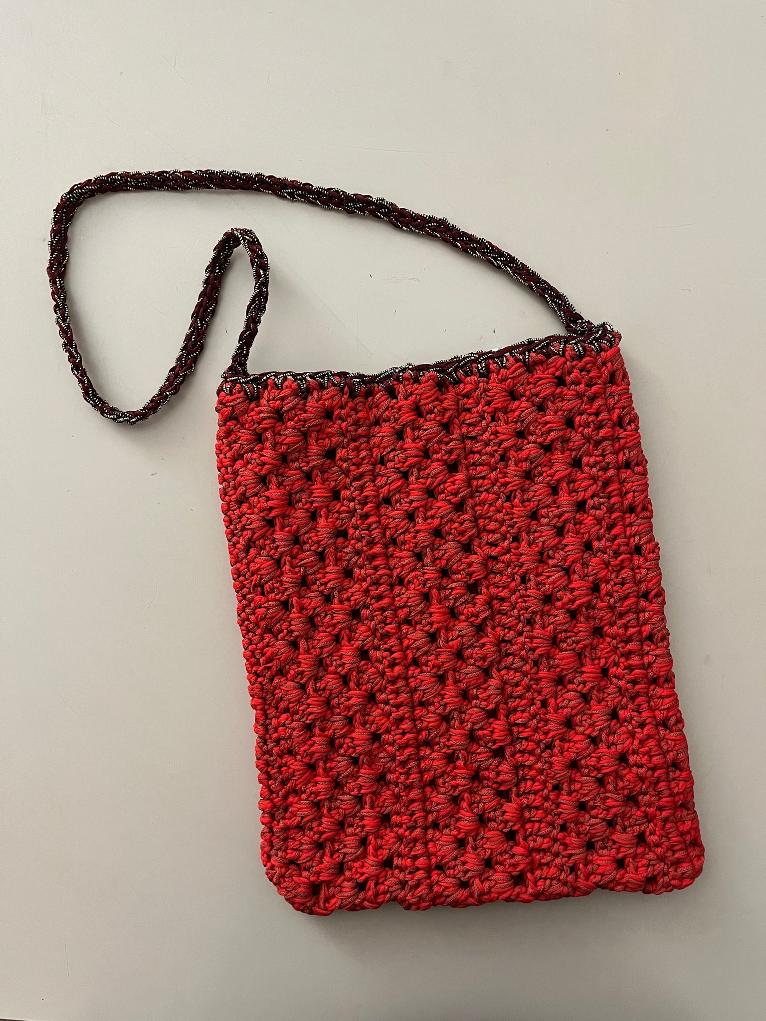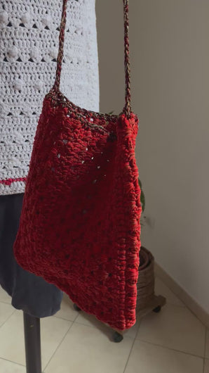 Borsa a tracolla in cotone color corallo mélange con inserto in lurex nella tracolla.