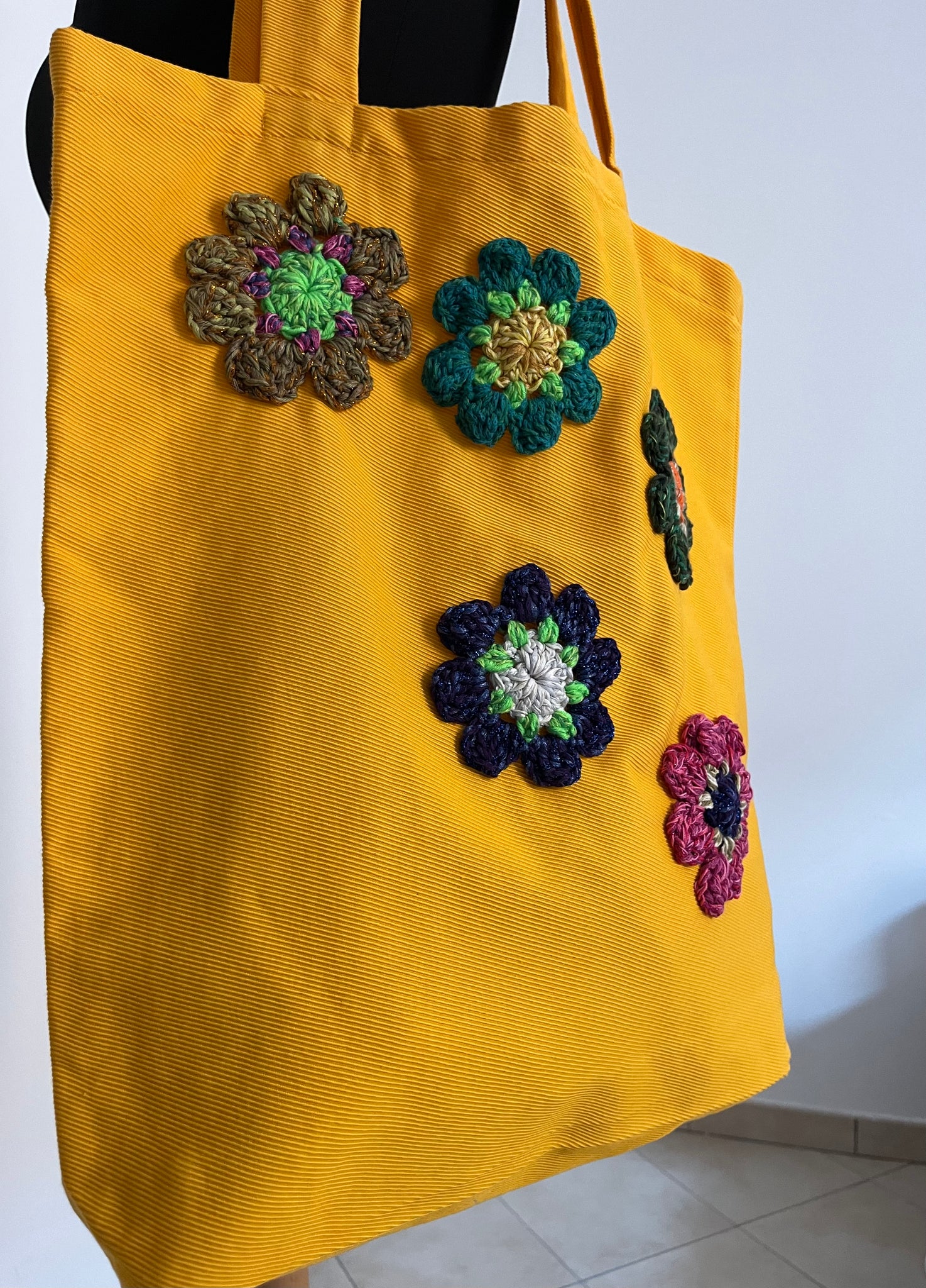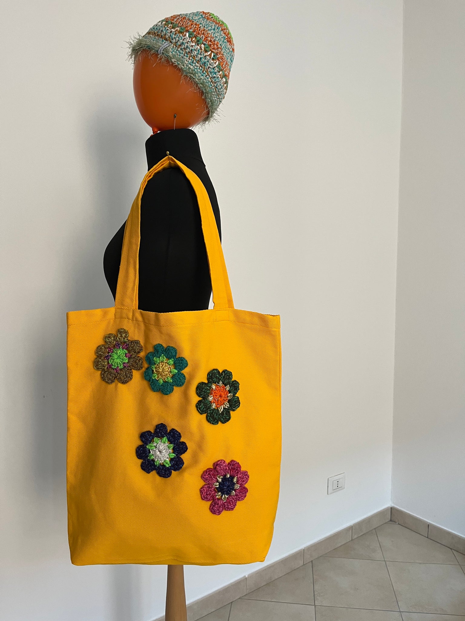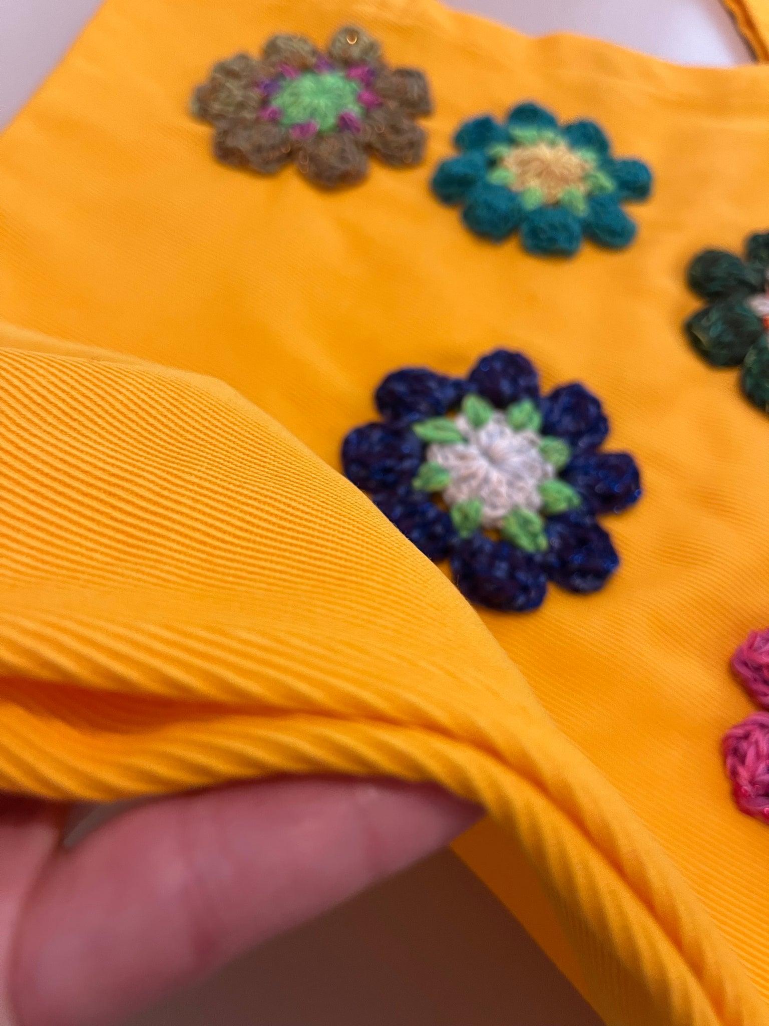Borsa in tessuto vintage di cotone color giallo ocra realizzata artigianalmente con applicazioni floreali fatte a uncinetto.
