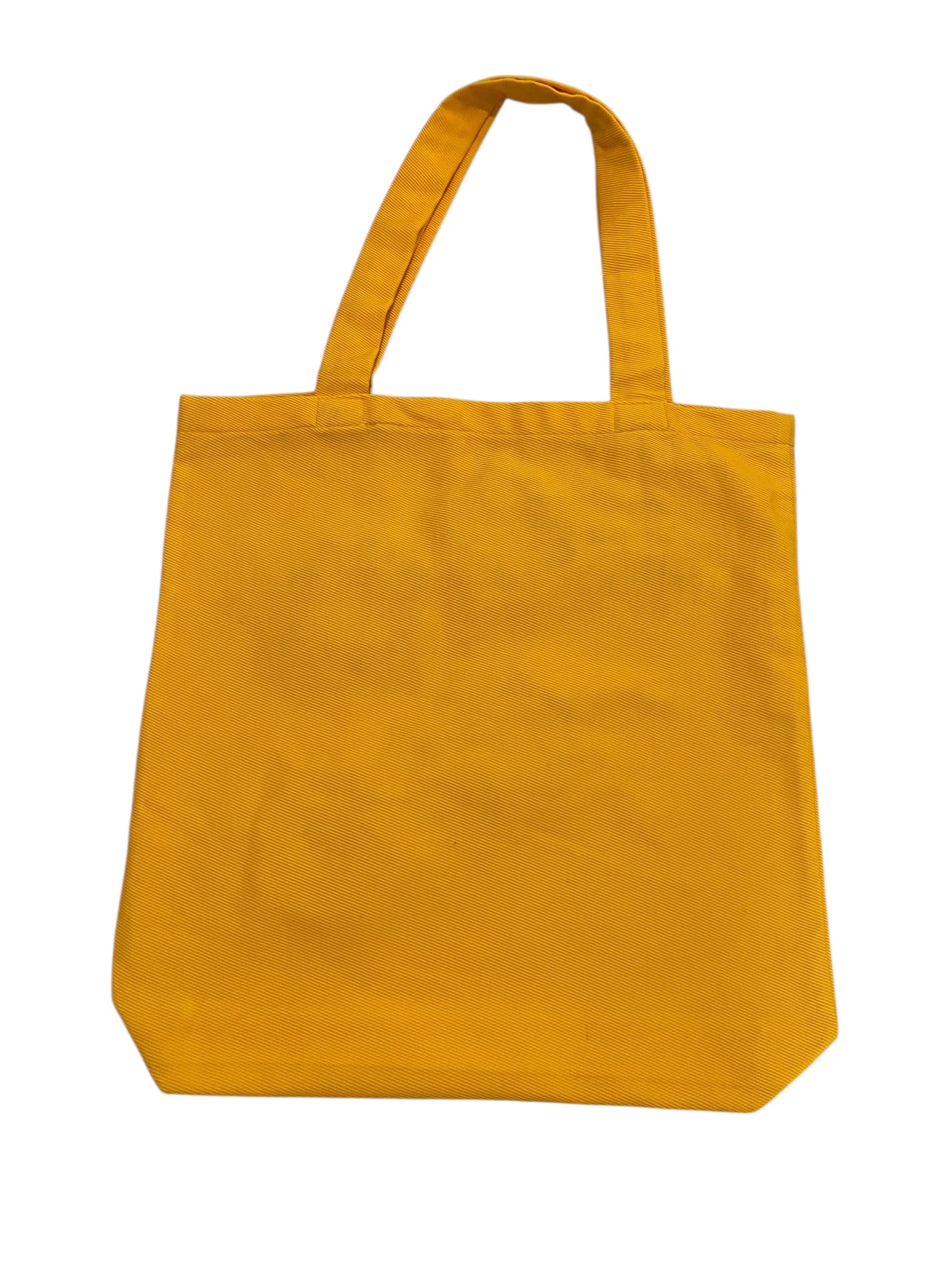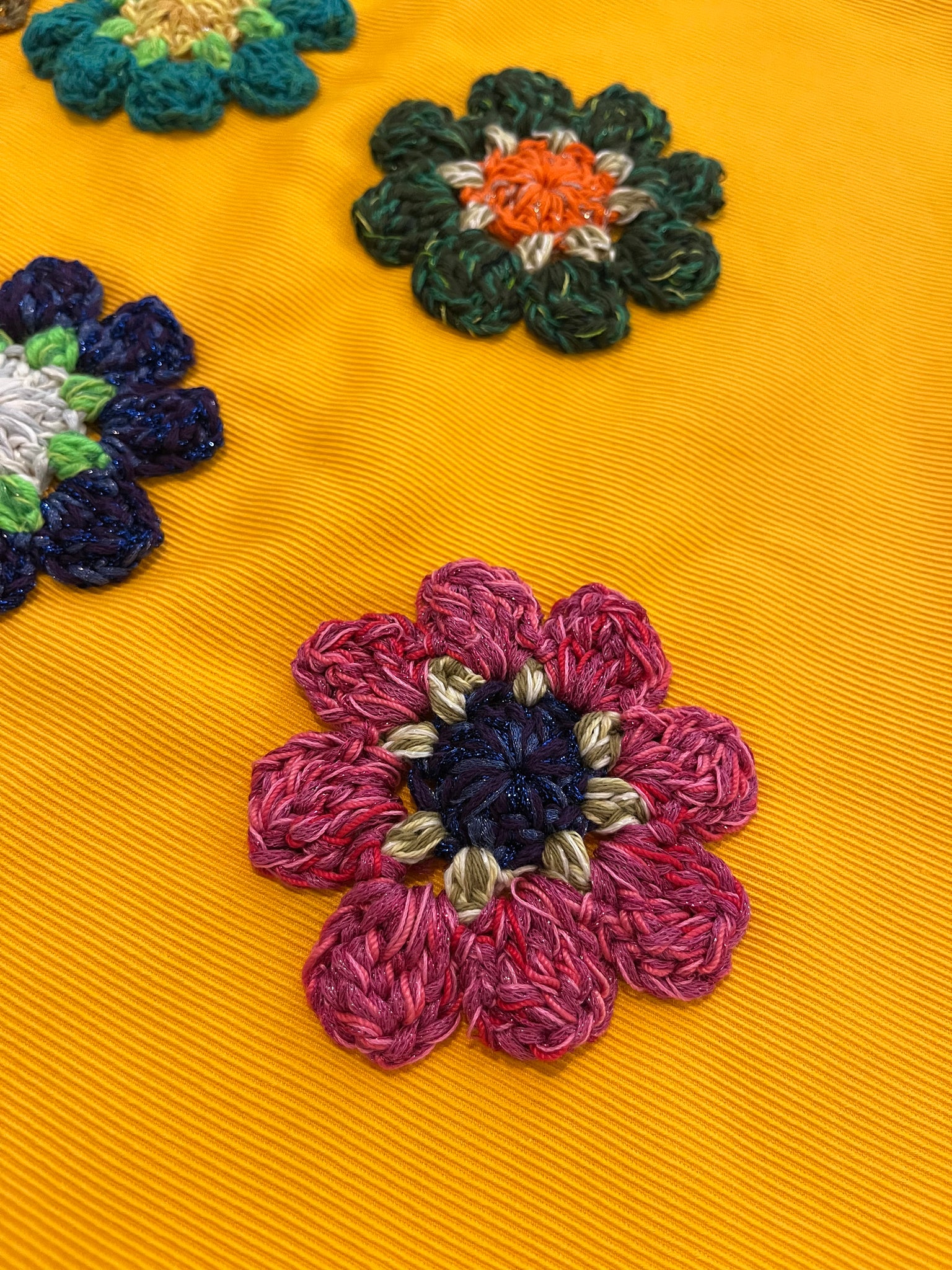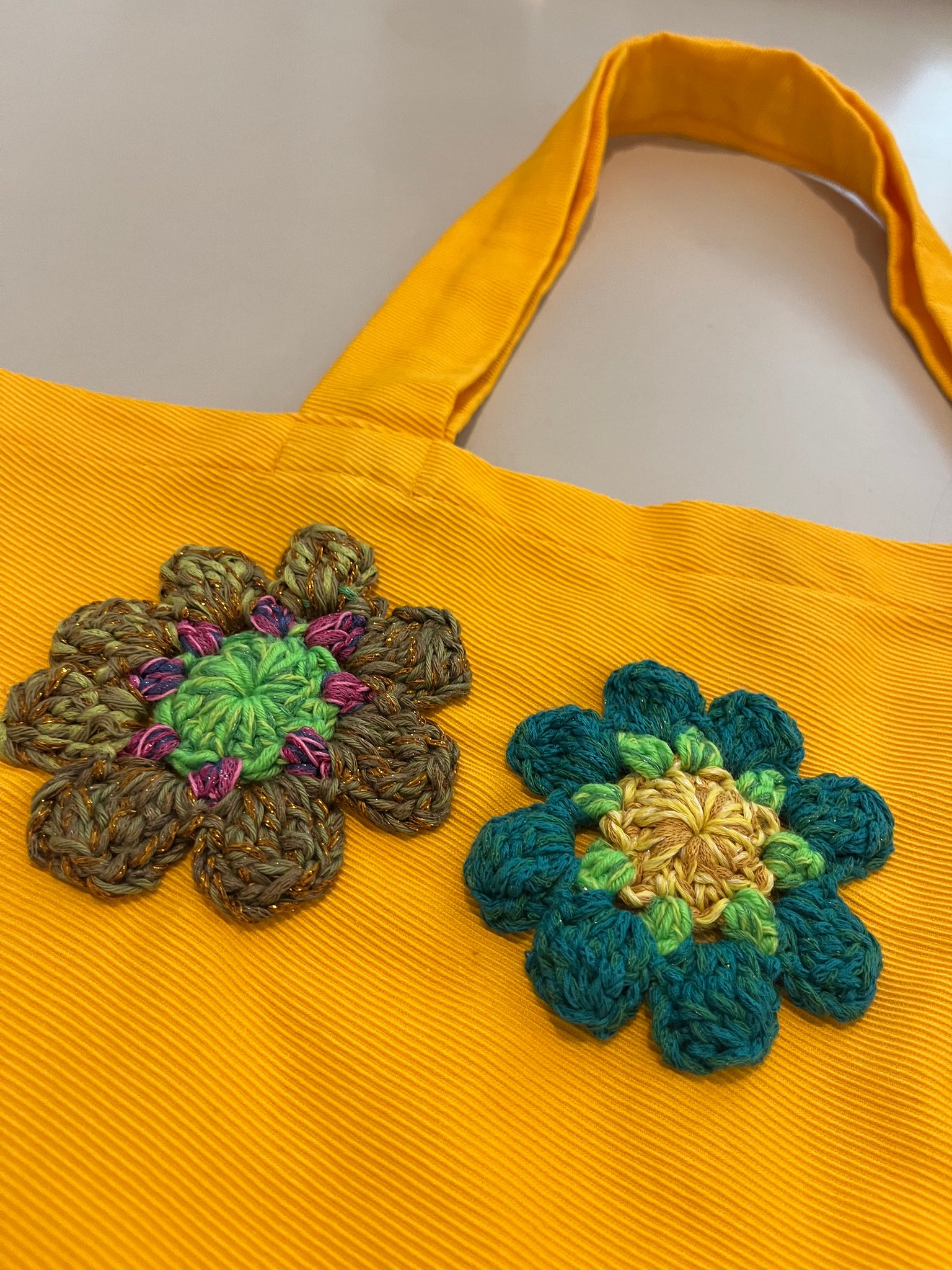 Borsa in tessuto vintage di cotone color giallo ocra realizzata artigianalmente con applicazioni floreali fatte a uncinetto.