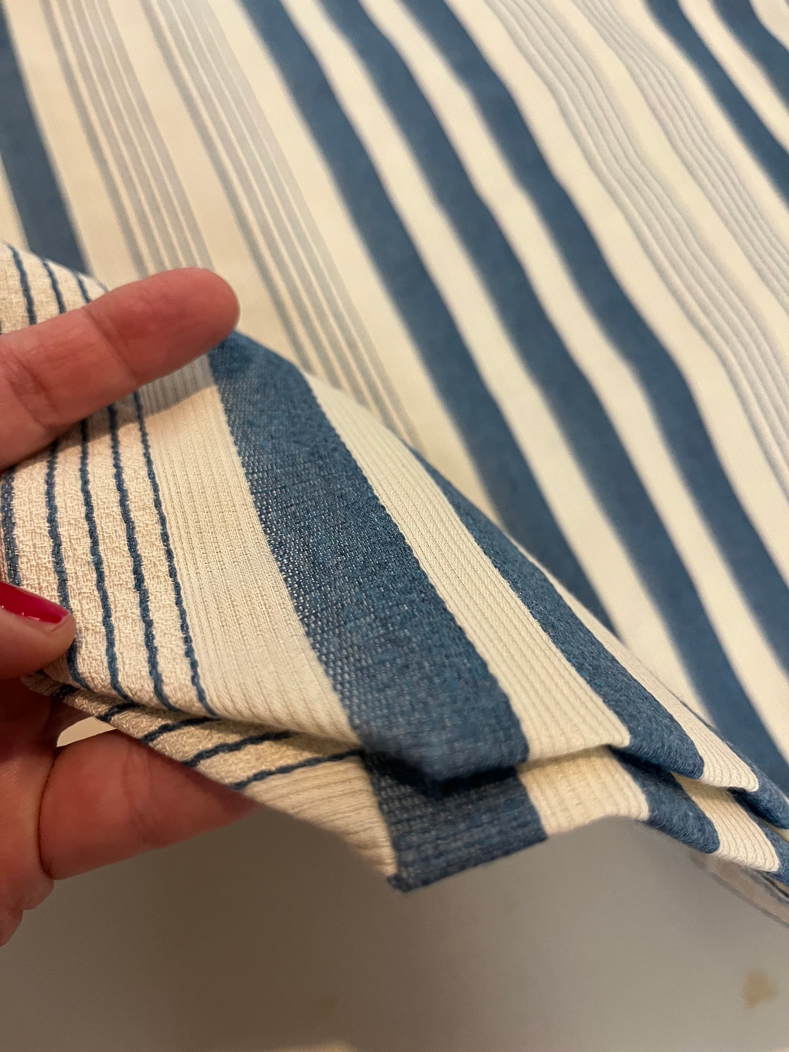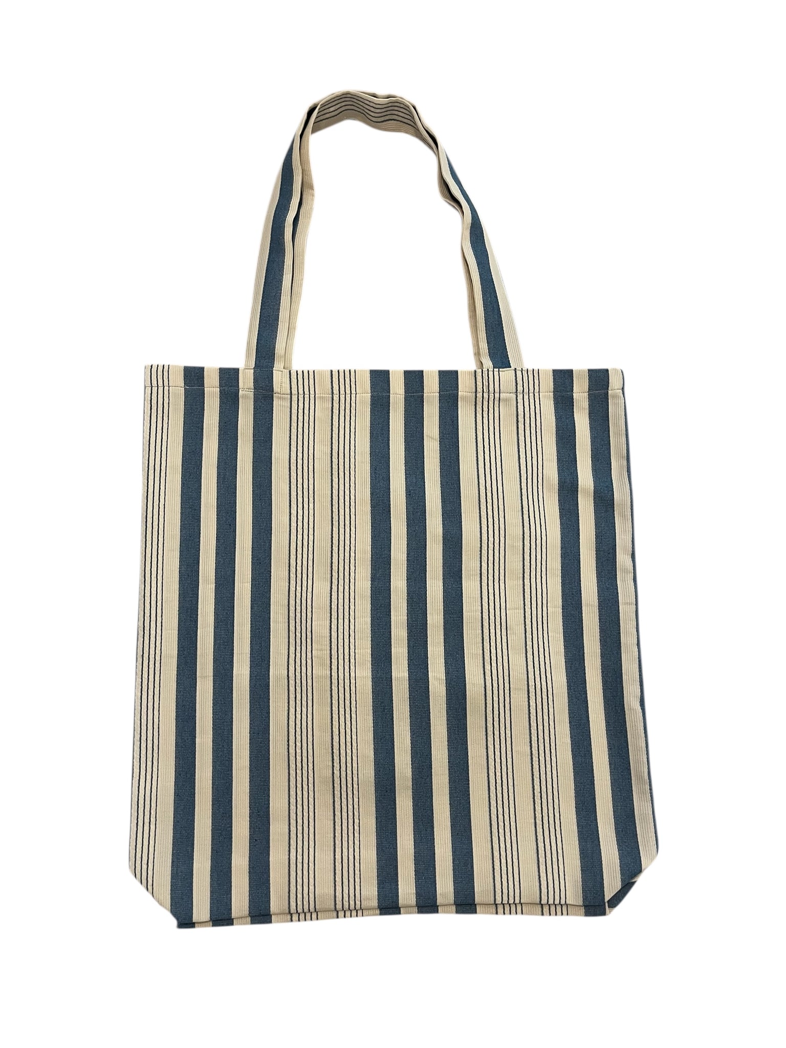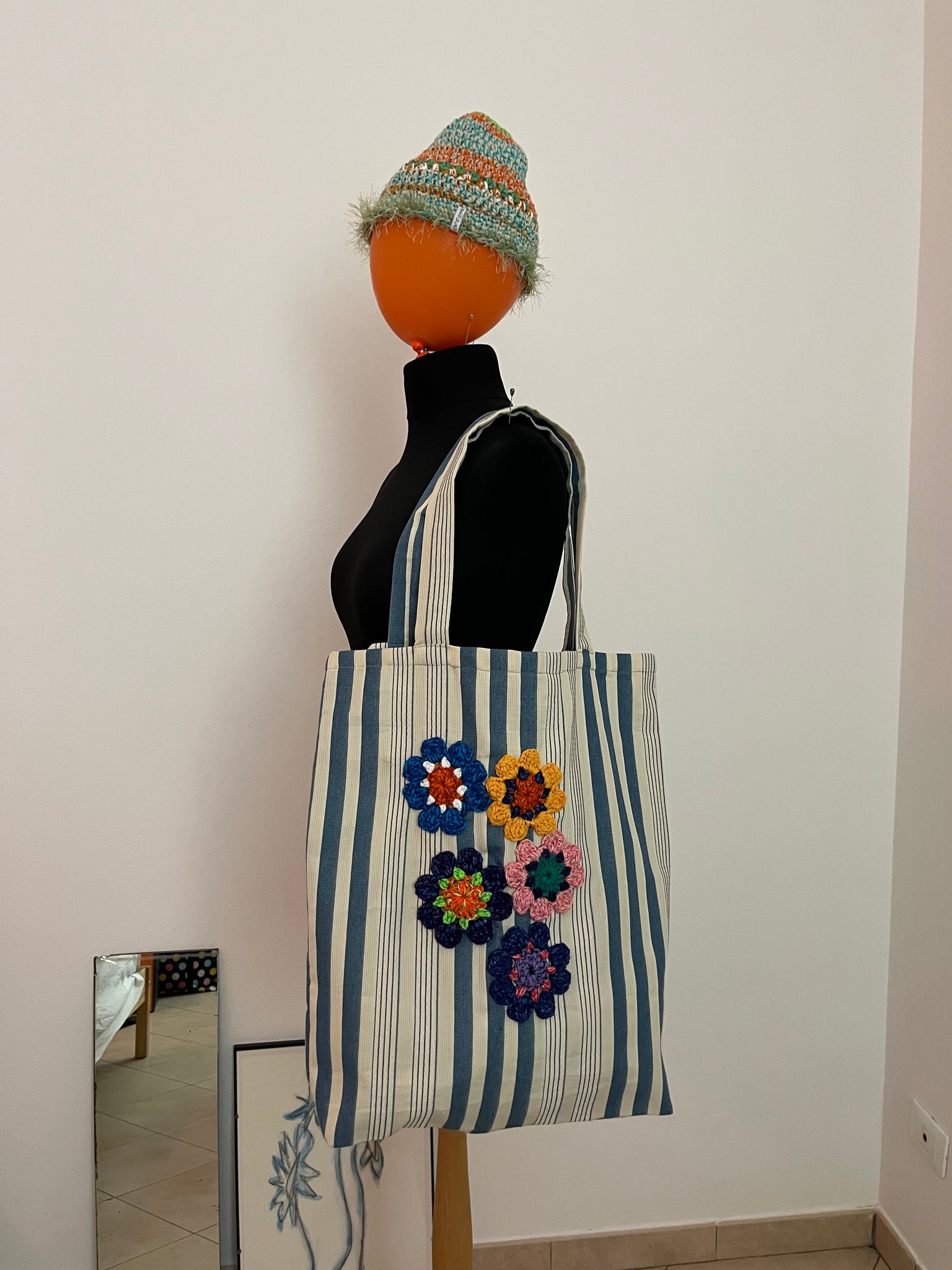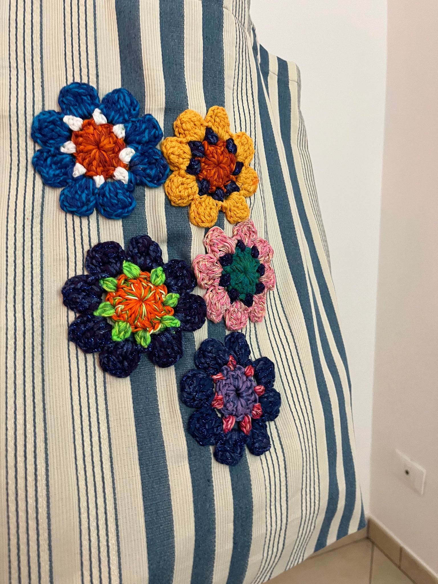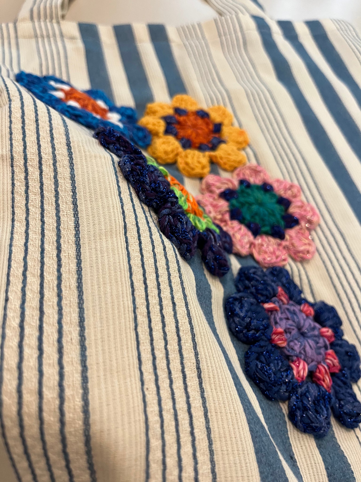 Borsa in tessuto vintage a righe color burro e carta da zucchero realizzata artigianalmente con applicazioni floreali fatte a uncinetto.