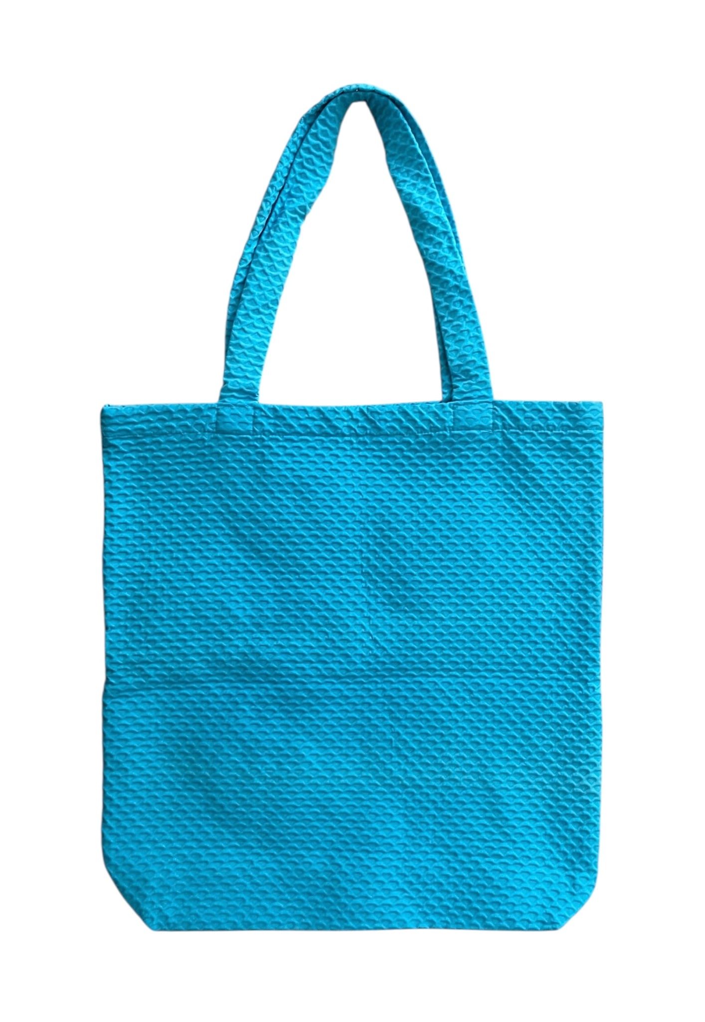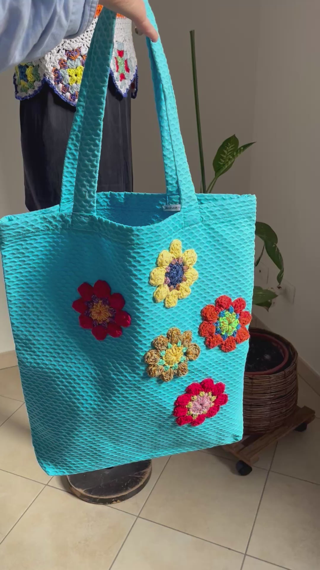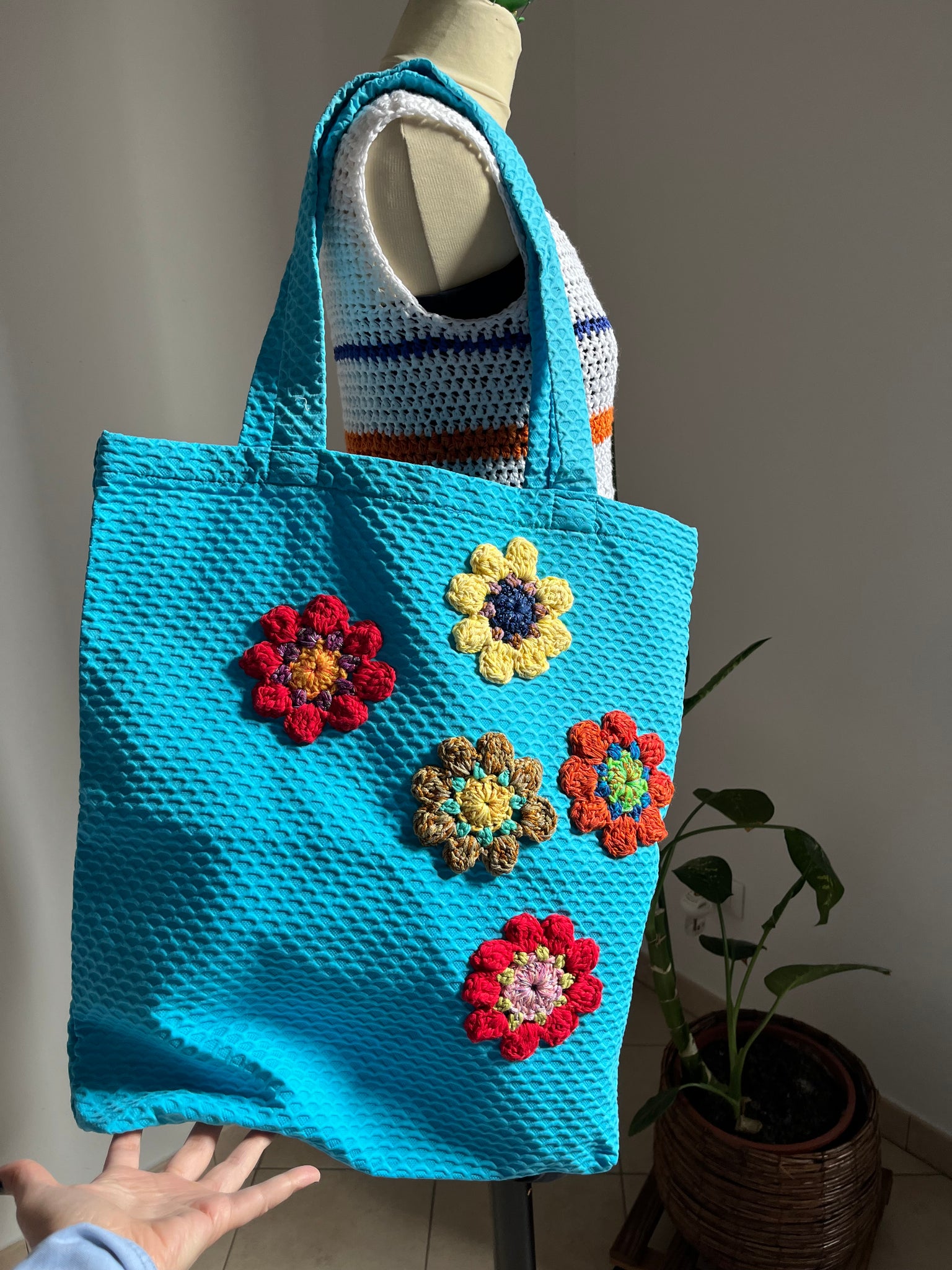 Borsa in tessuto vintage azzurro con applicazioni floreali fatte a uncinetto.