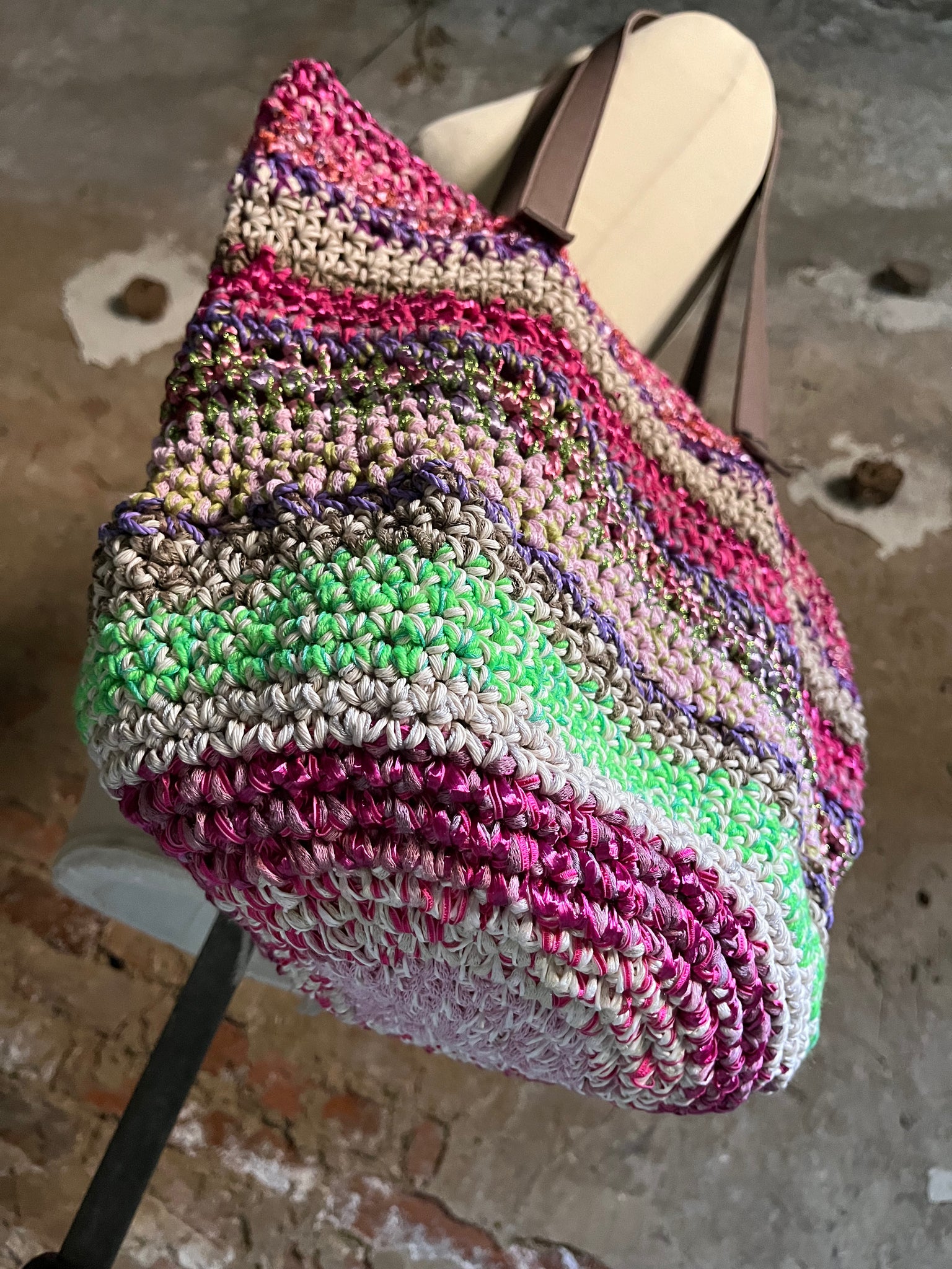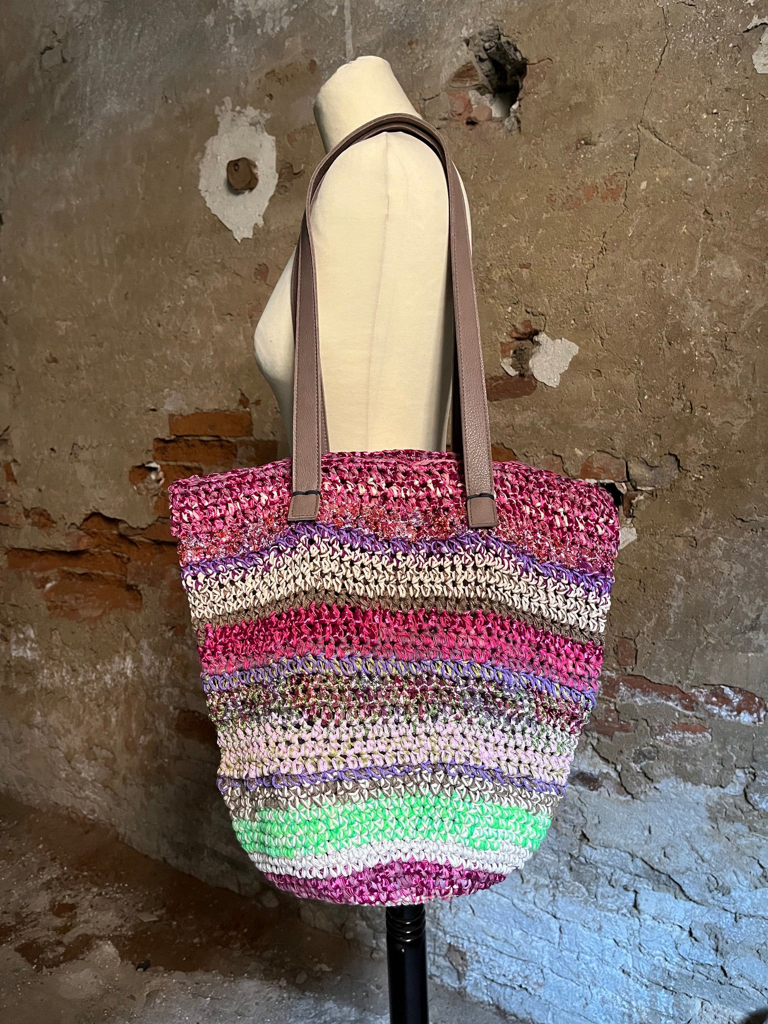 Borsa a secchiello in rafia e cotone fatta a mano a uncinetto. Manici a spalla in pelle.