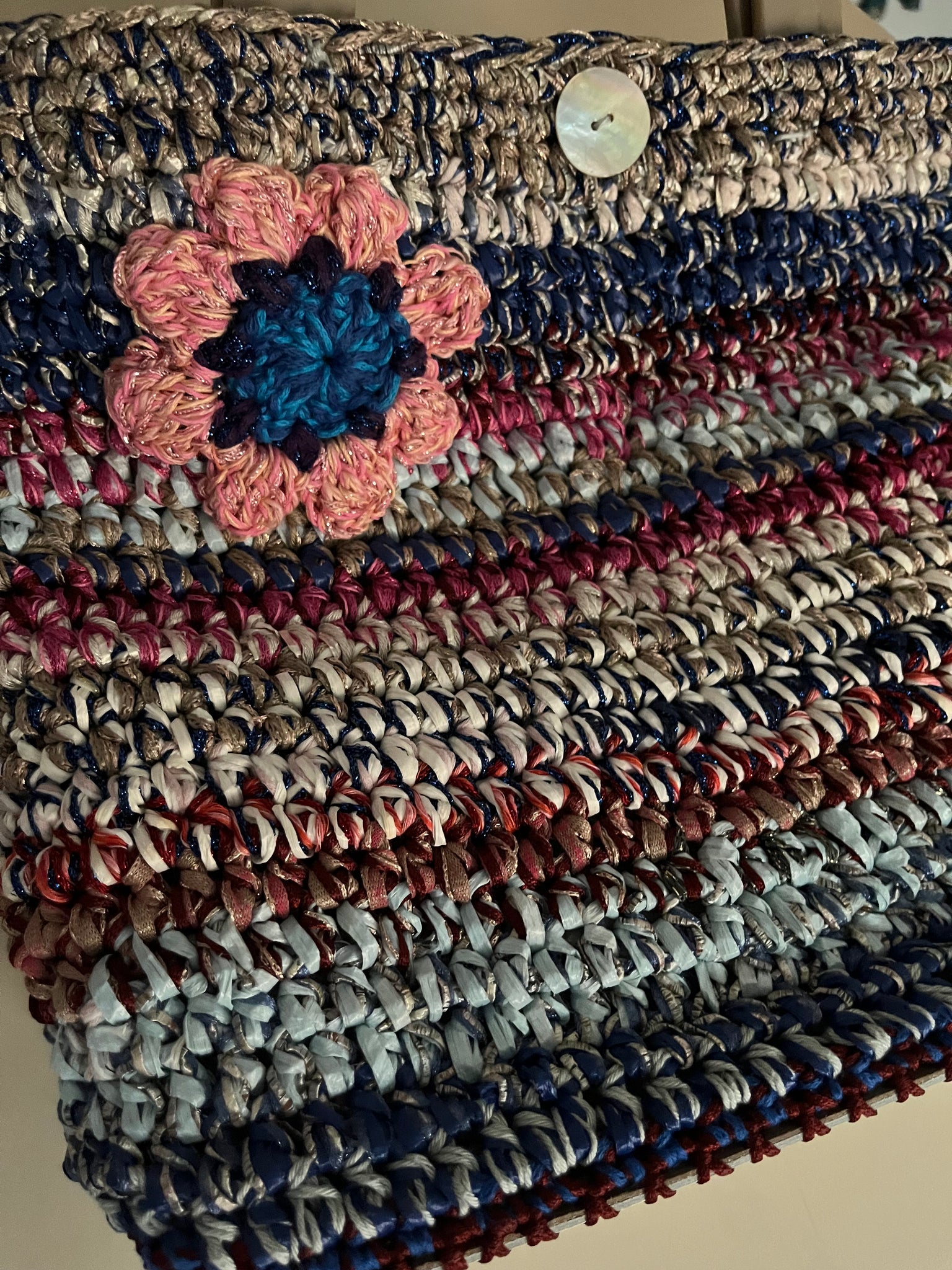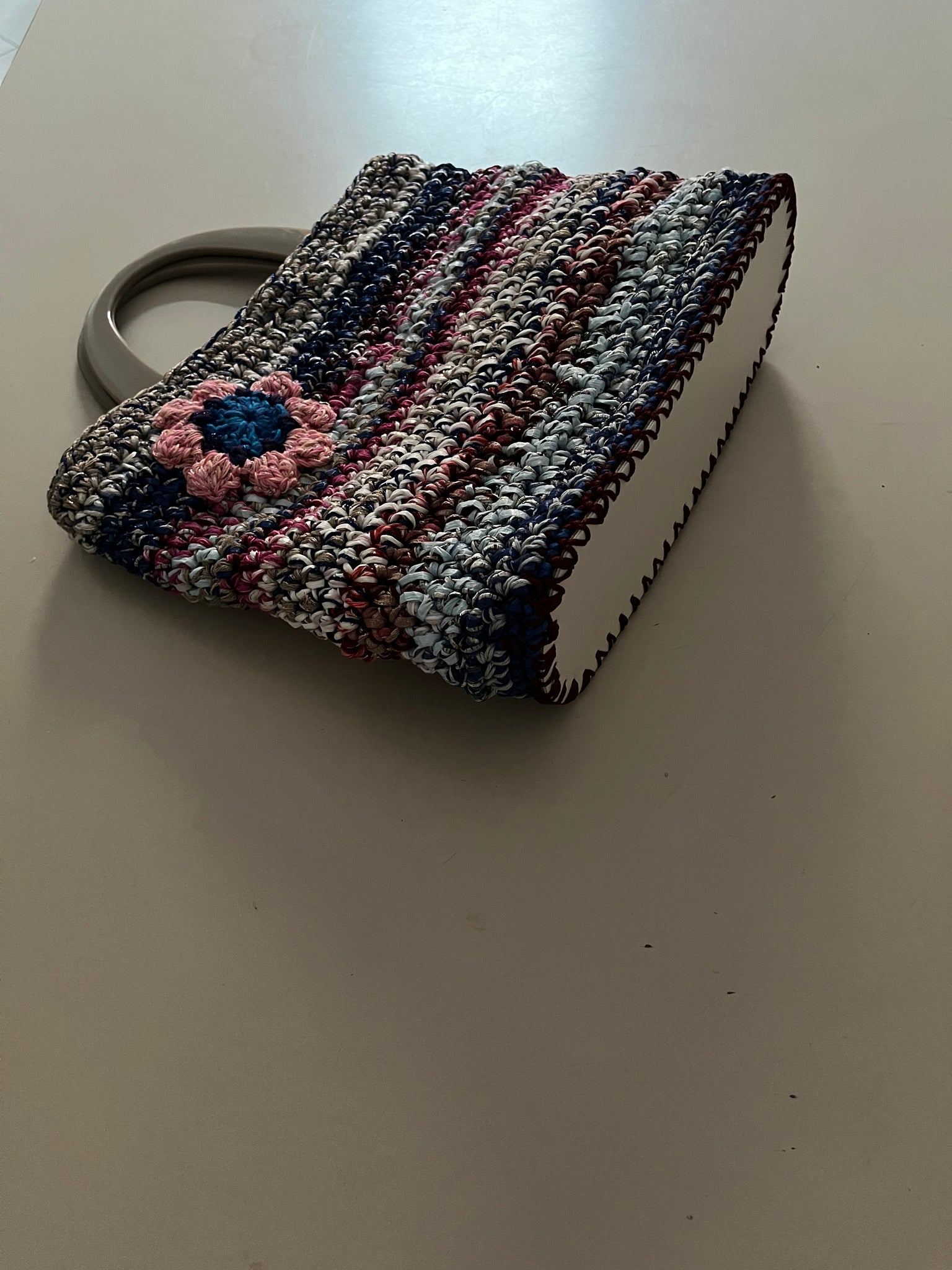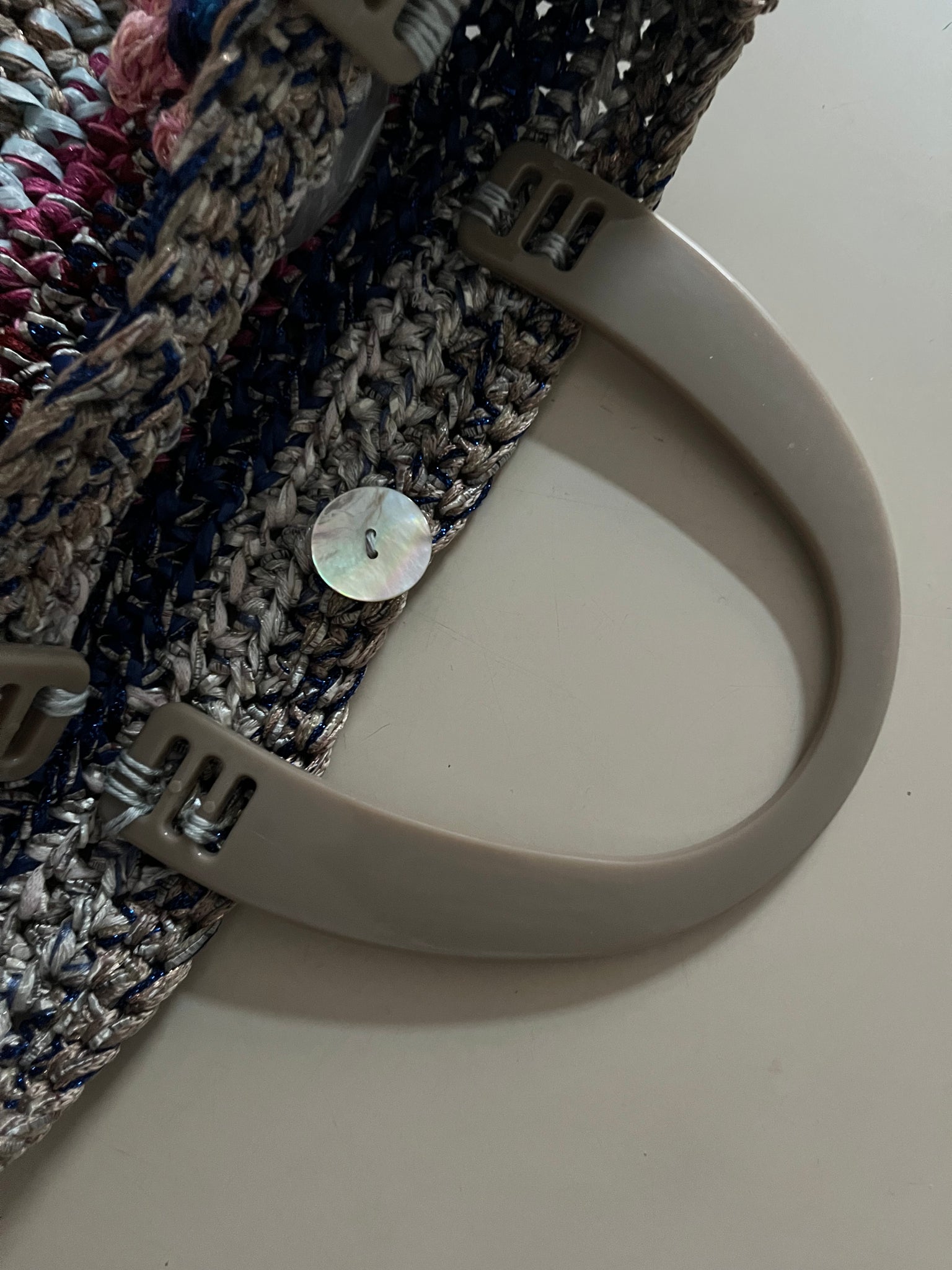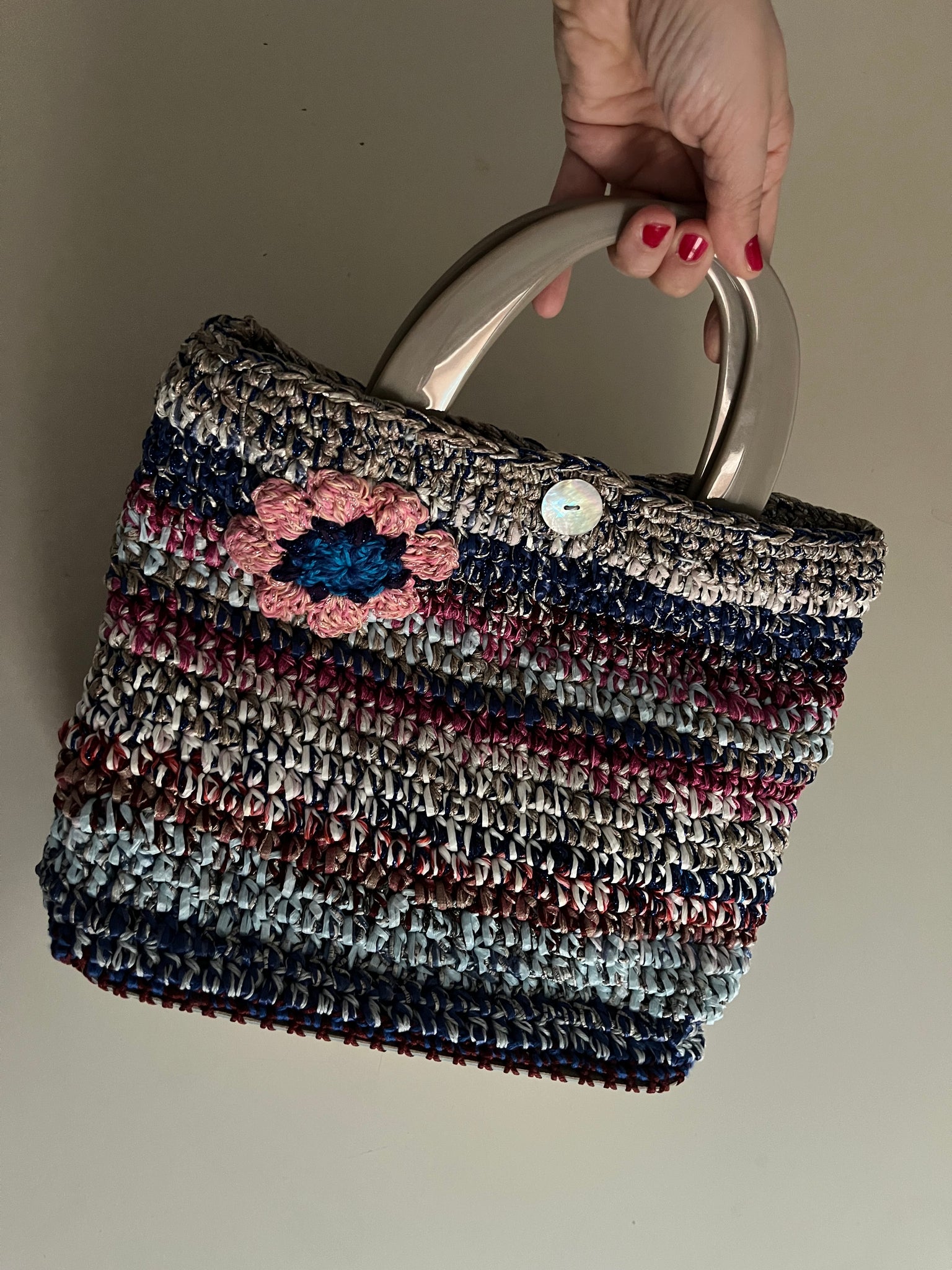 Borsa a mano fatta a uncinetto in rafia sui toni del blu, bianco e magenta usati in una combinazione variopinta. Chiusura con bottone in madreperla e manici in plastica color tortora. Fondo rigido rivestito in tessuto simil pelle.