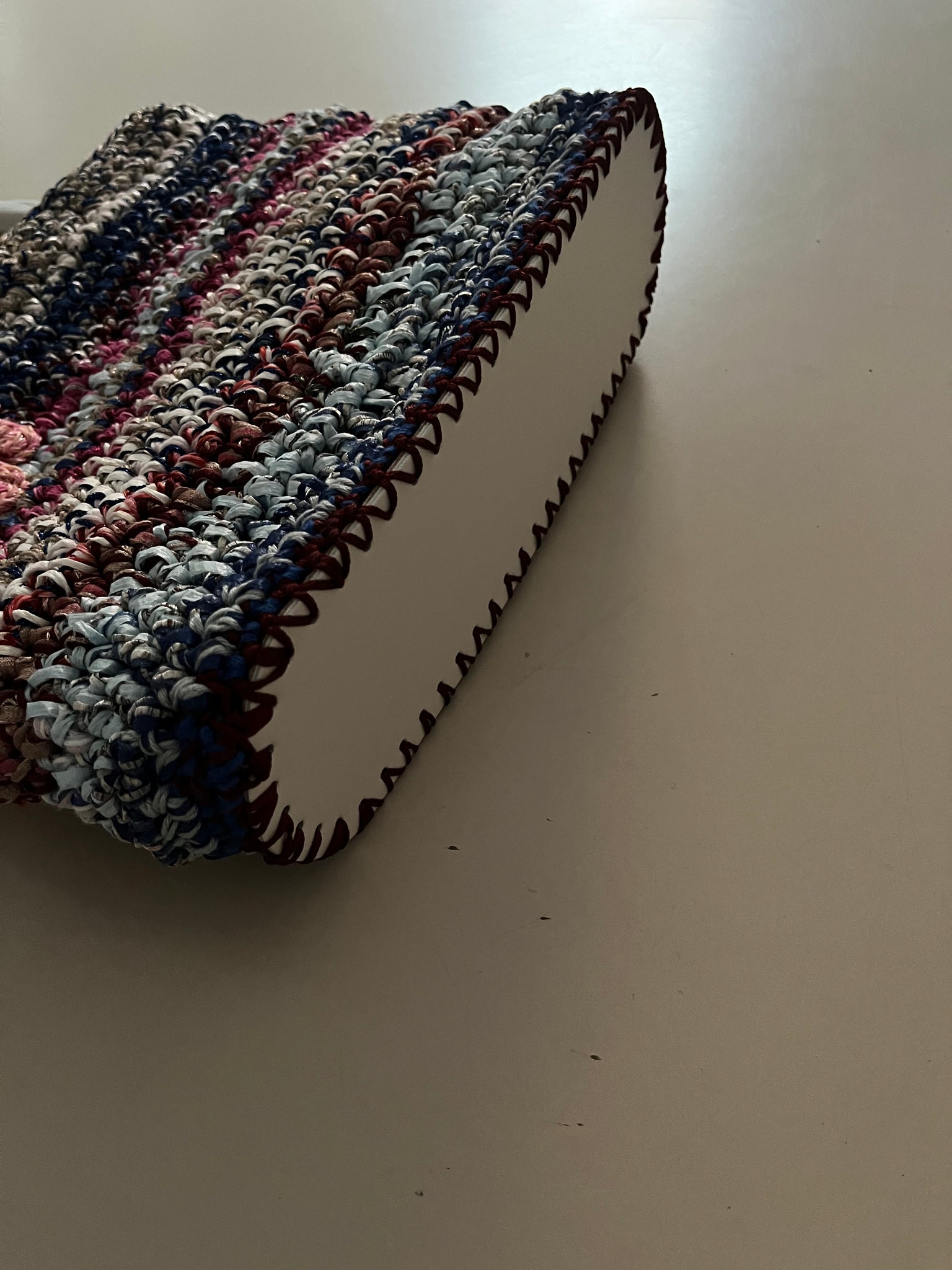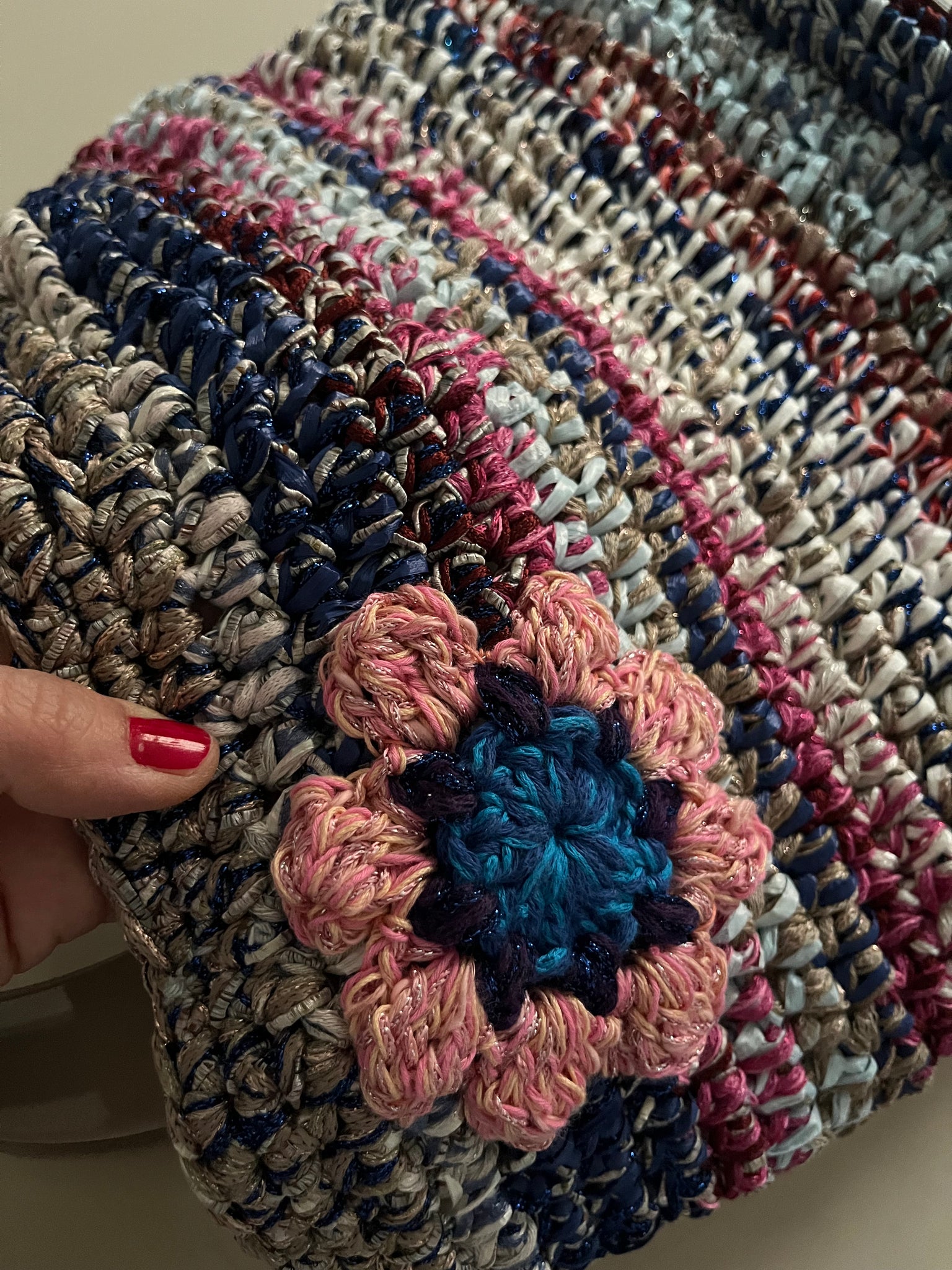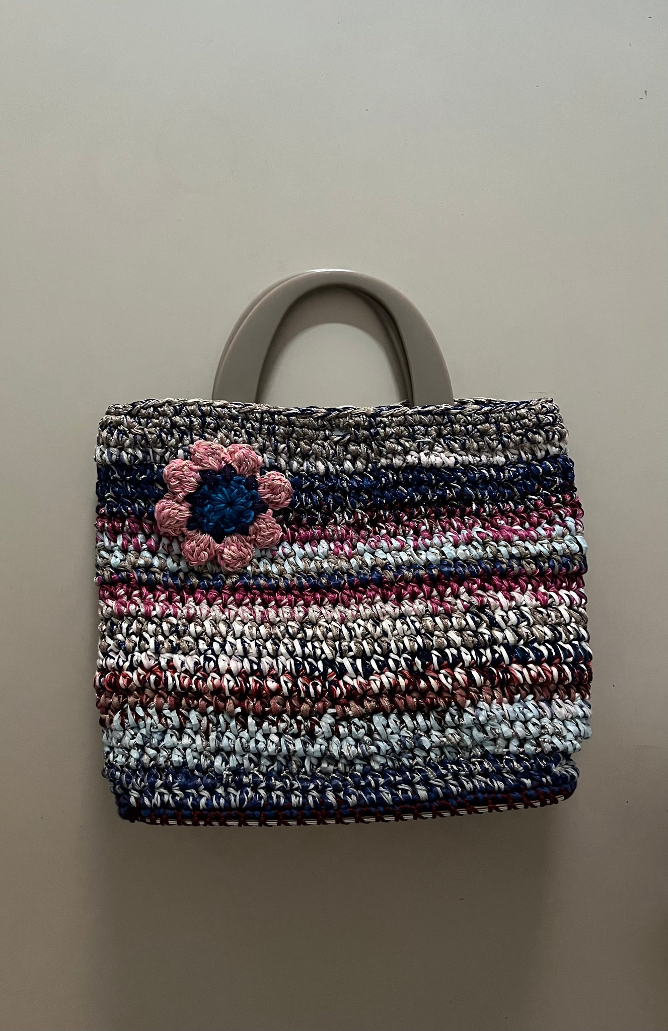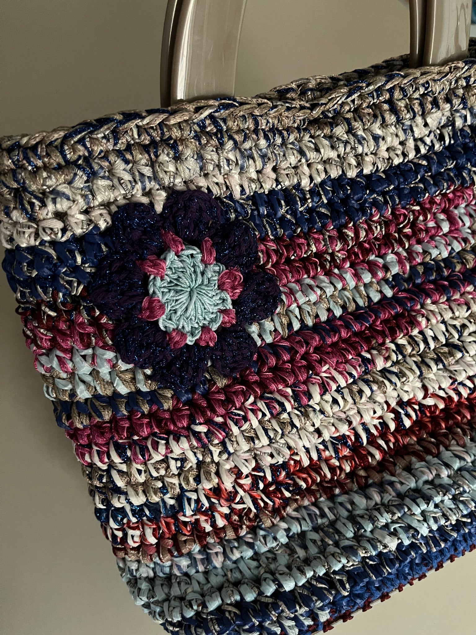 Borsa a mano fatta a uncinetto in rafia sui toni del blu, bianco e magenta usati in una combinazione variopinta. Chiusura con bottone in madreperla e manici in plastica color tortora. Fondo rigido rivestito in tessuto simil pelle.