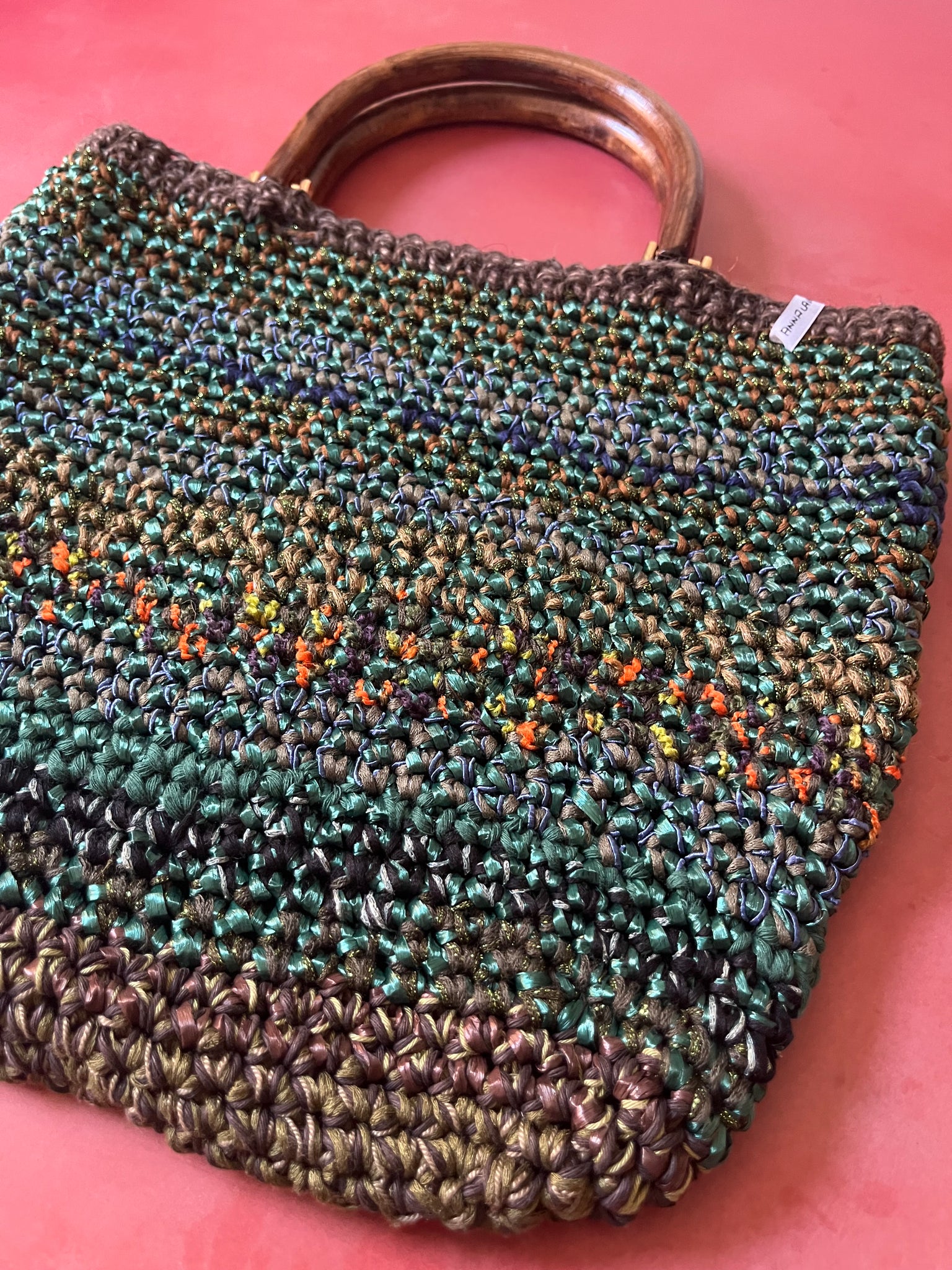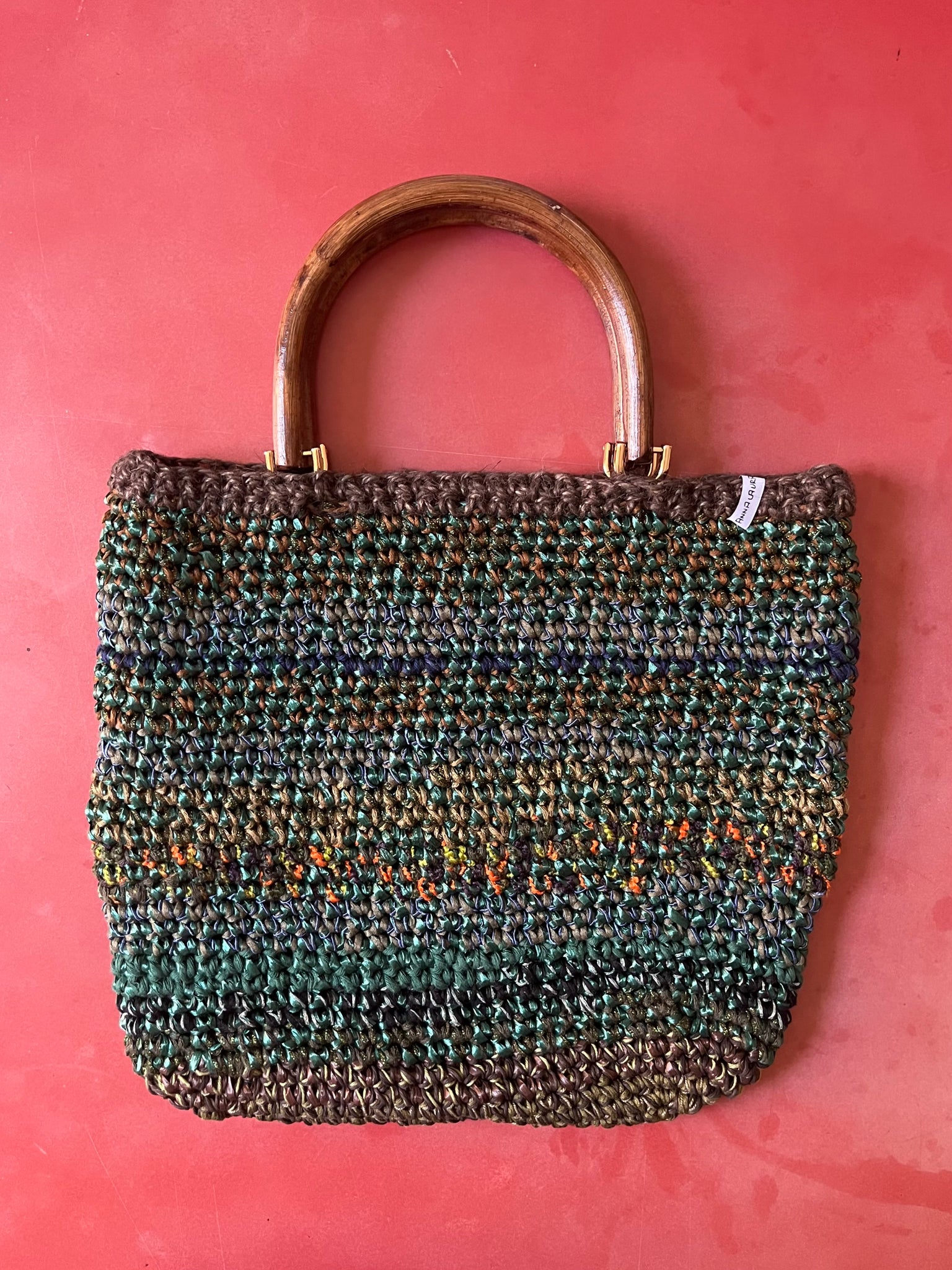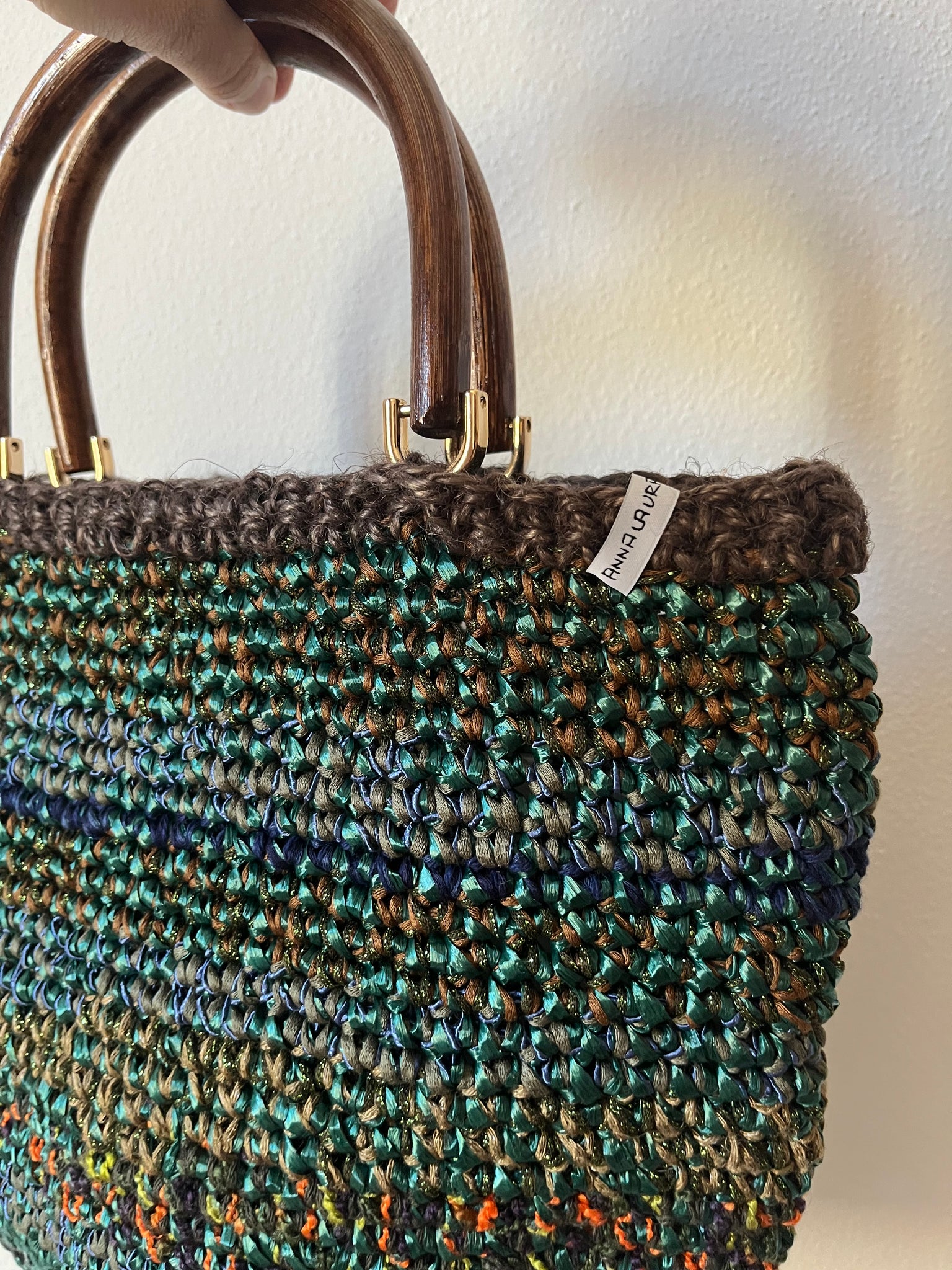 Borsa fatta a mano a uncinetto in rafia verde scuro e cotone blu, verde bosco e marrone lavorati insieme per un effetto mélange. Base rinforzata con cordino di cotone in color vinaccia. Manici in legno fissati con elementi in lega color oro su un giro di iuta naturale marrone a finitura della sacca.l