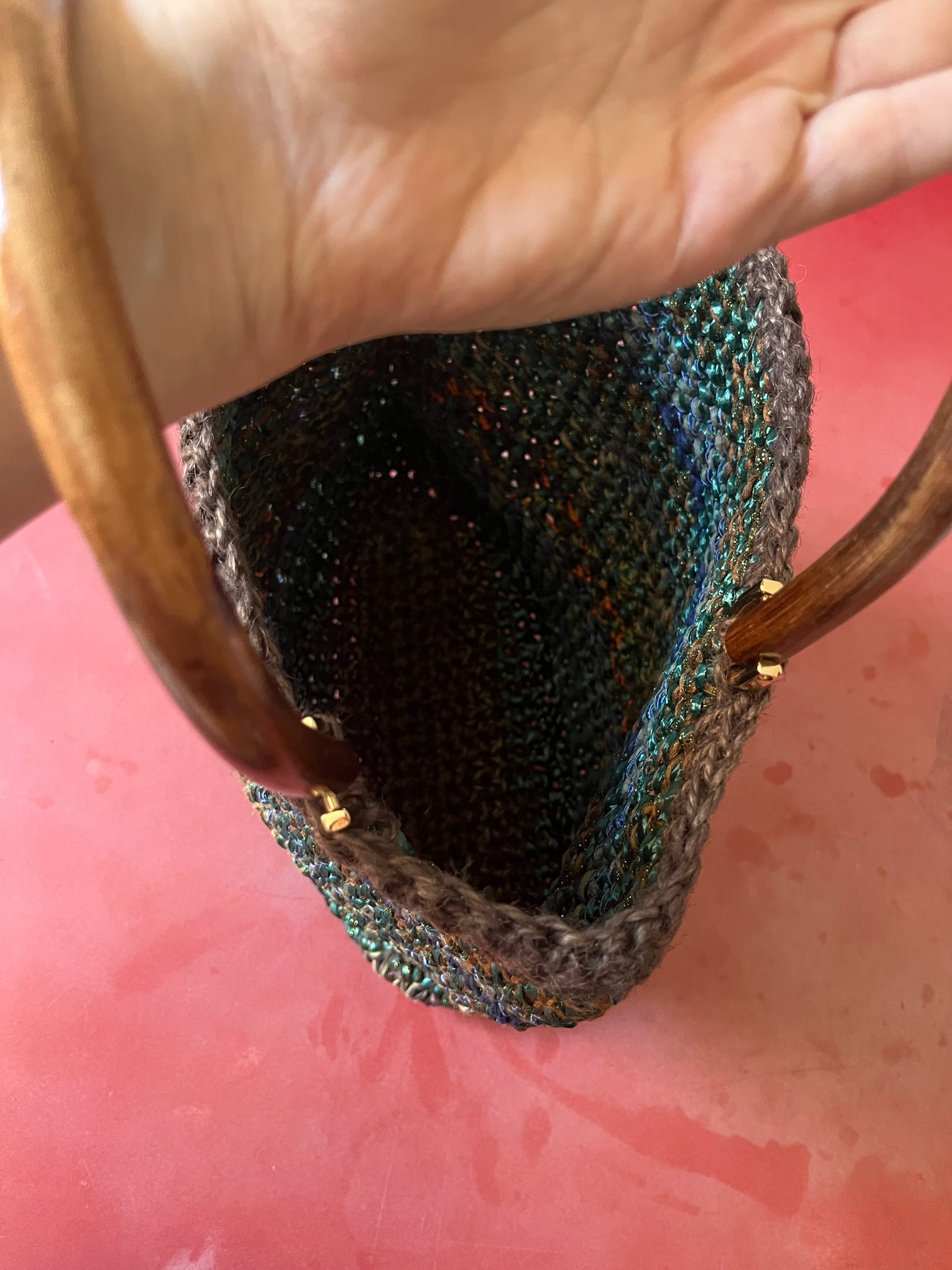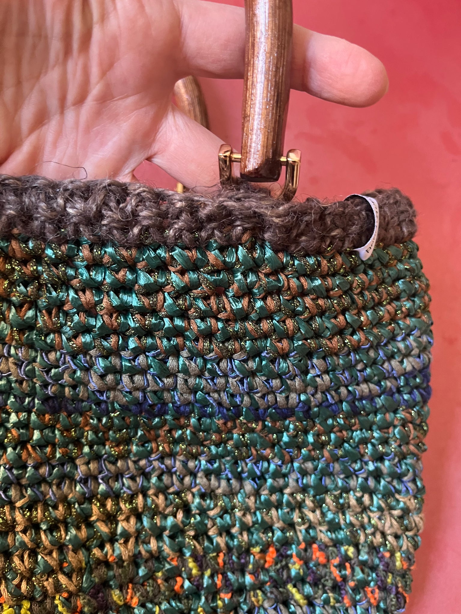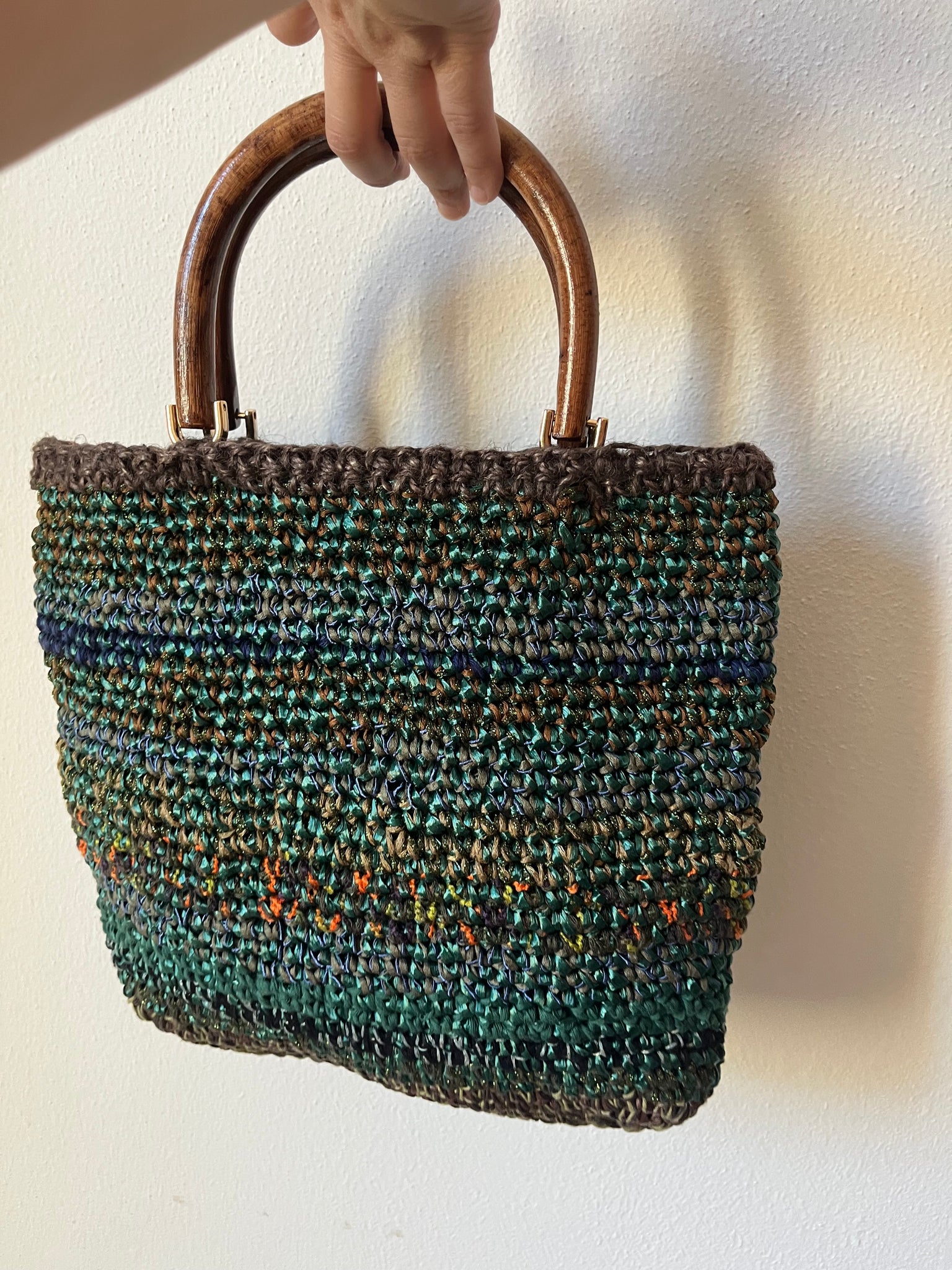 Borsa fatta a mano a uncinetto in rafia verde scuro e cotone blu, verde bosco e marrone lavorati insieme per un effetto mélange. Base rinforzata con cordino di cotone in color vinaccia. Manici in legno fissati con elementi in lega color oro su un giro di iuta naturale marrone a finitura della sacca.l