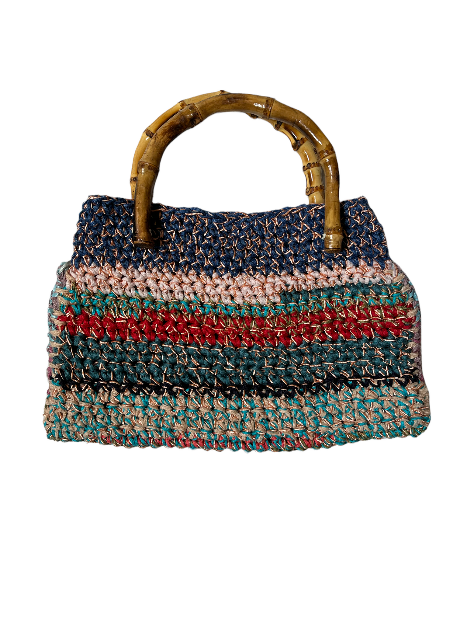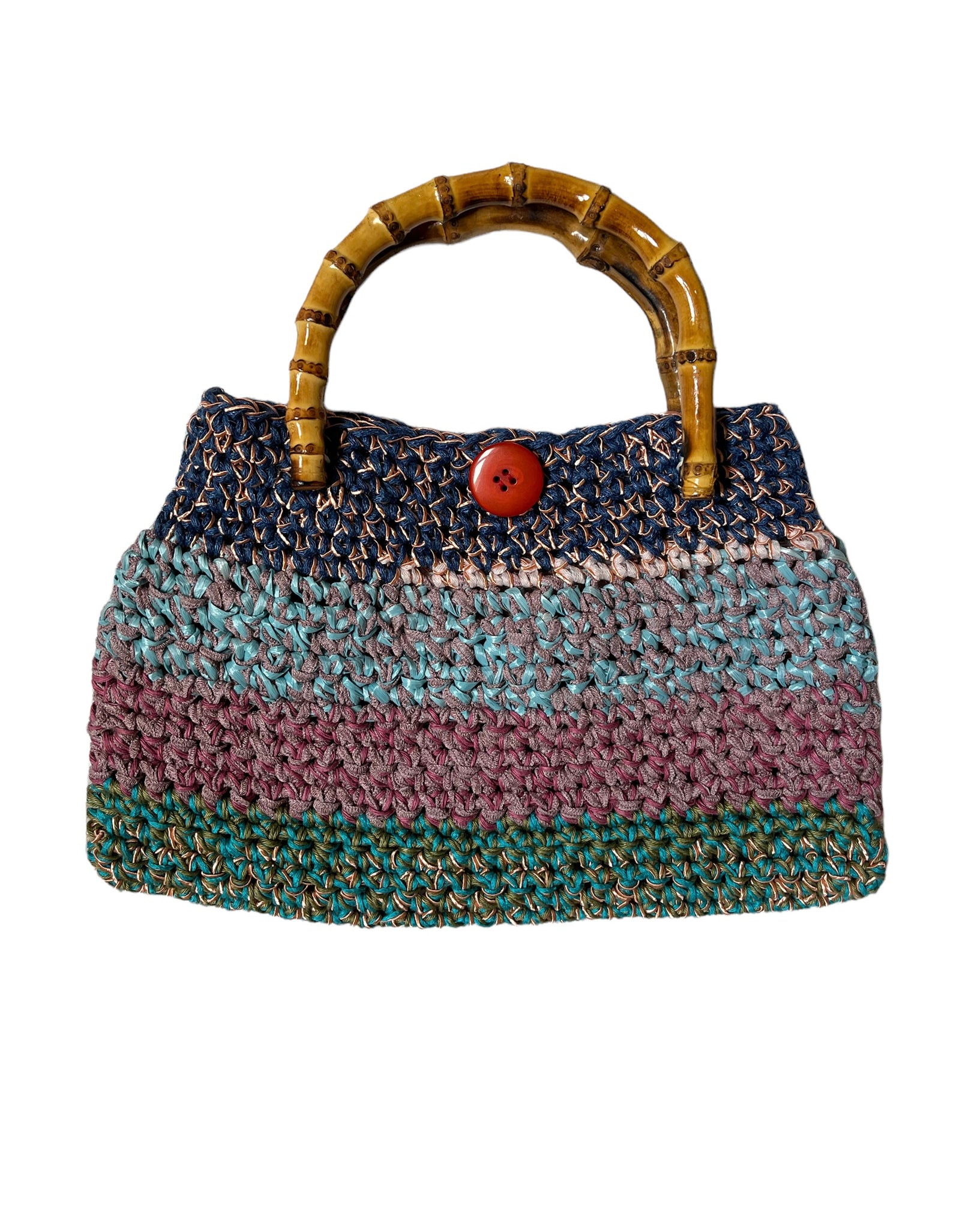 Borsina fatta a mano a uncinetto in cotone di varie tinte e piccolo inserto in rafia celeste. Bottone in plastica rosso e manici in bambù.