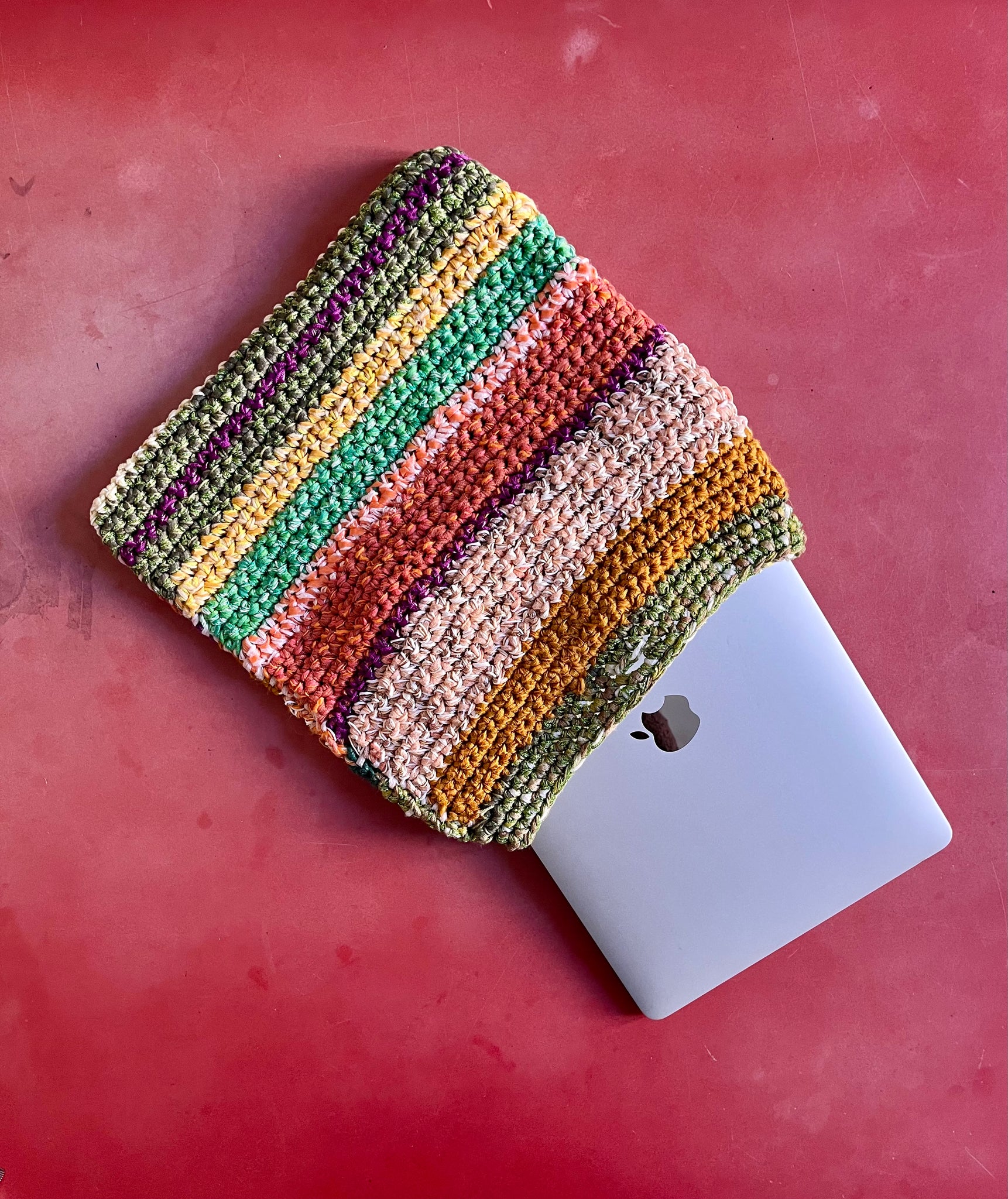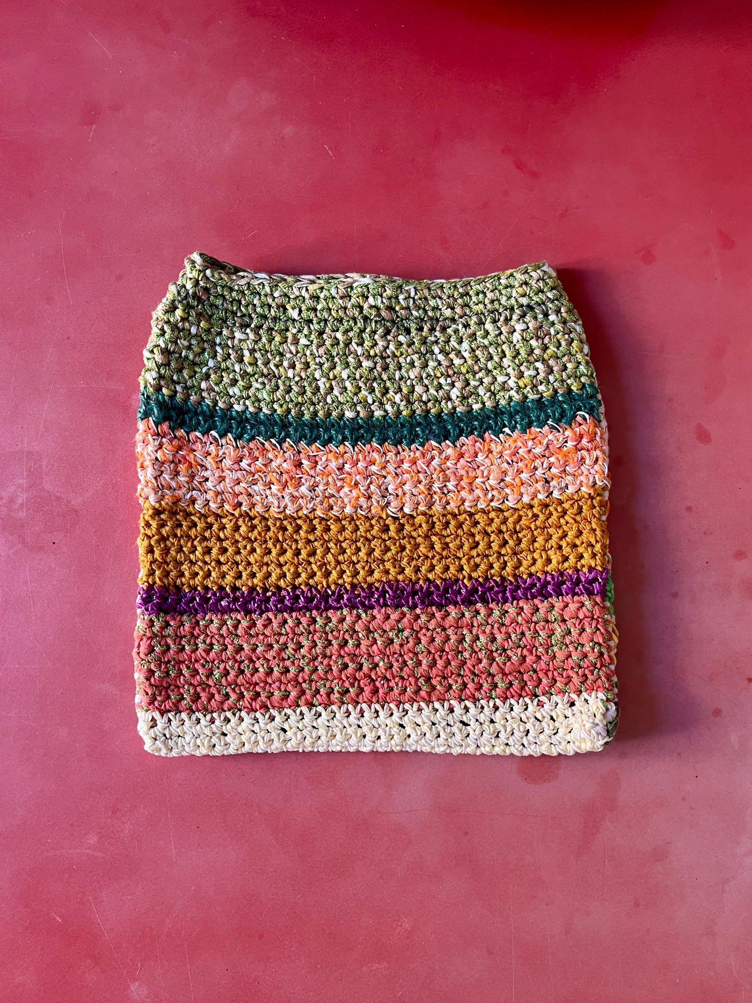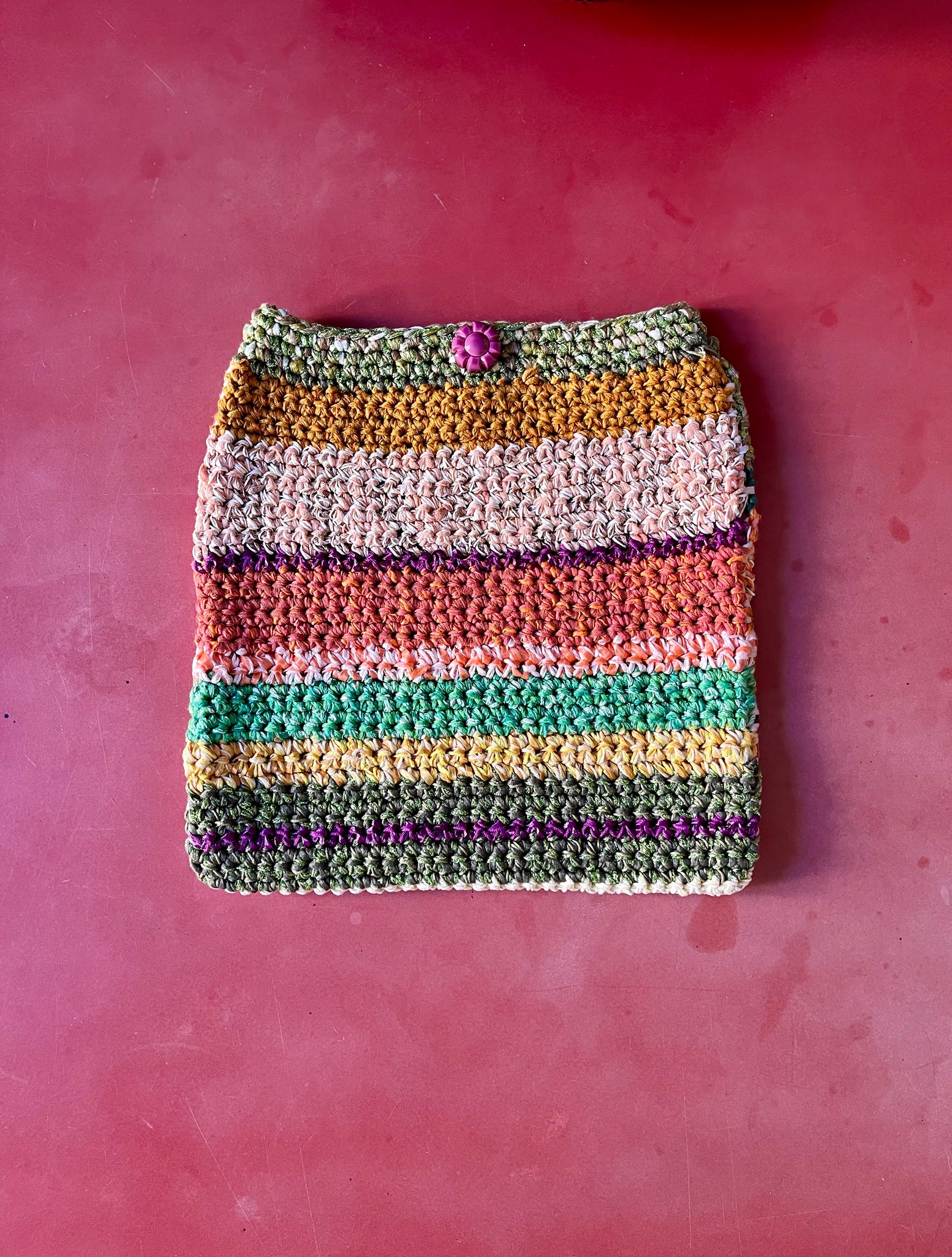 Bustina multicolor in cotone, lurex e rafia lavorati a mano a uncinetto. Chiusura con bottone.
