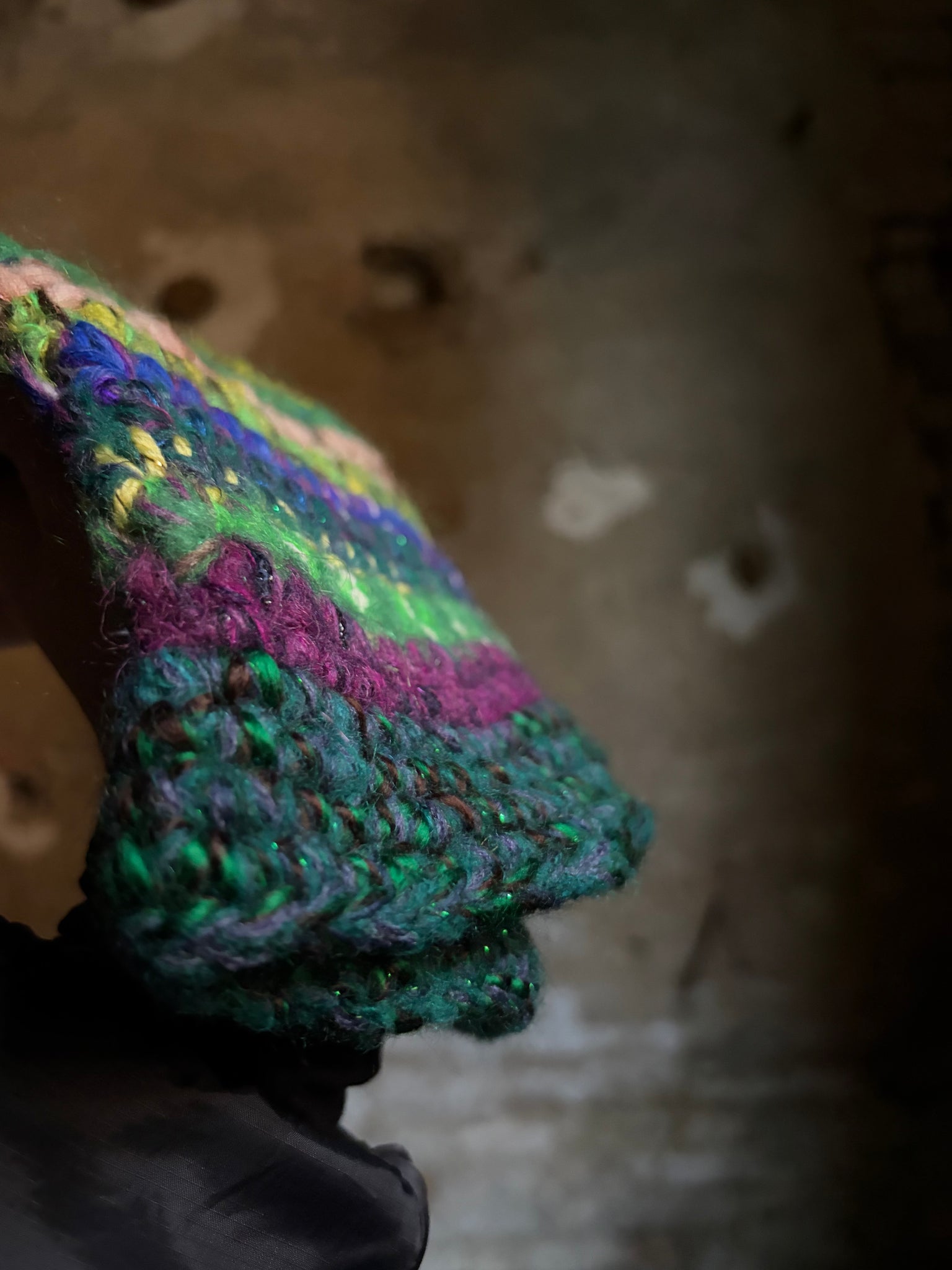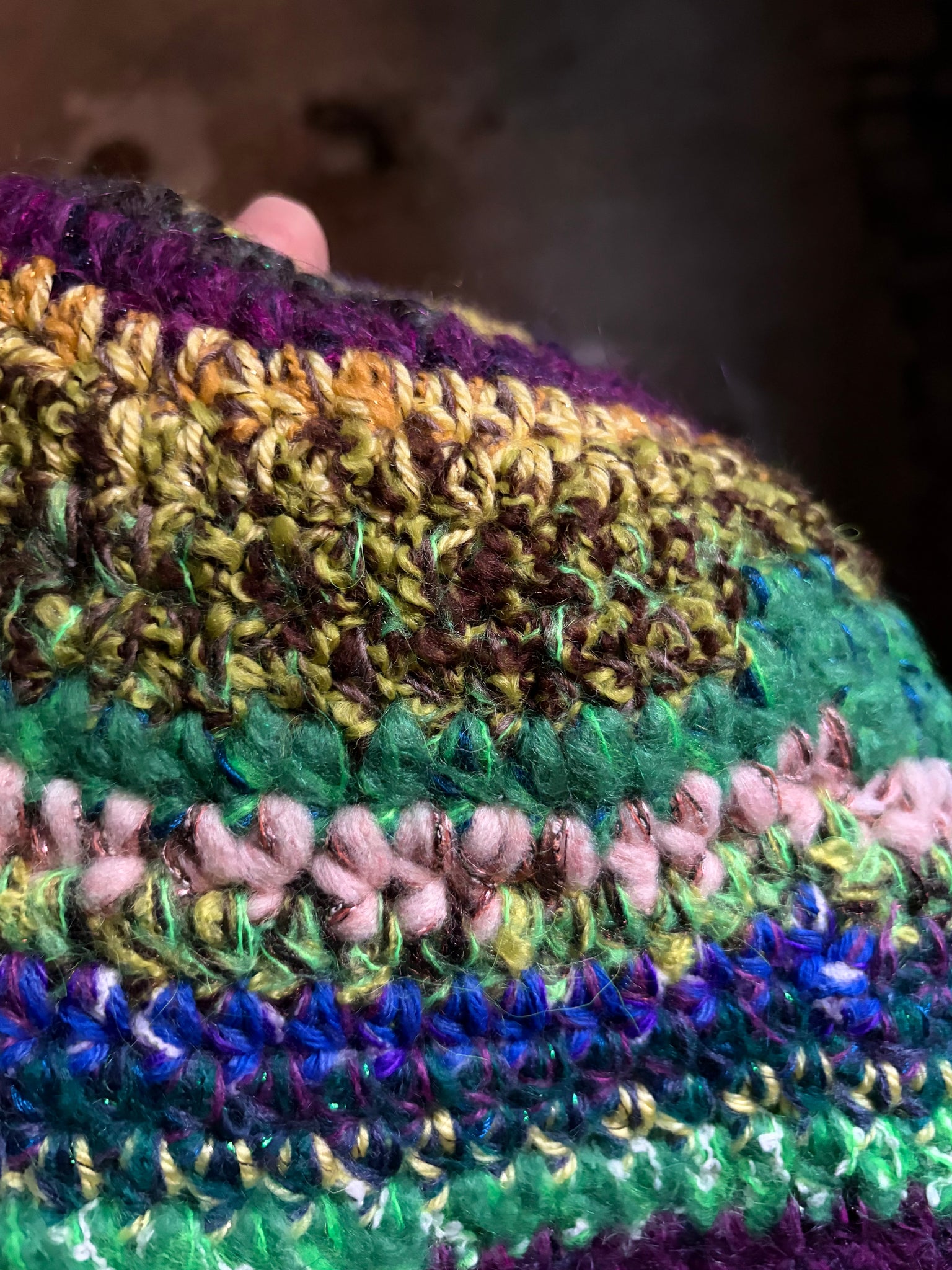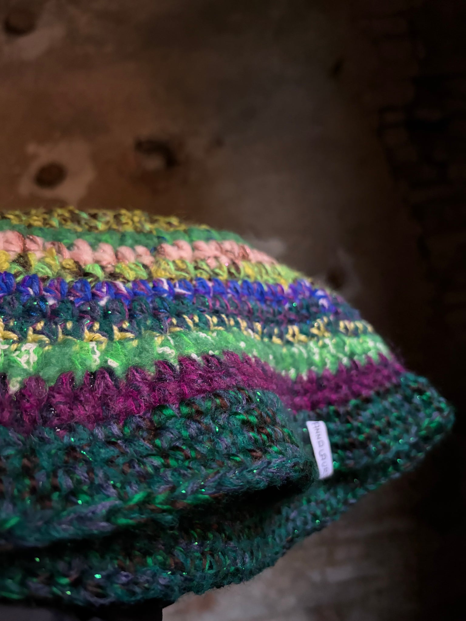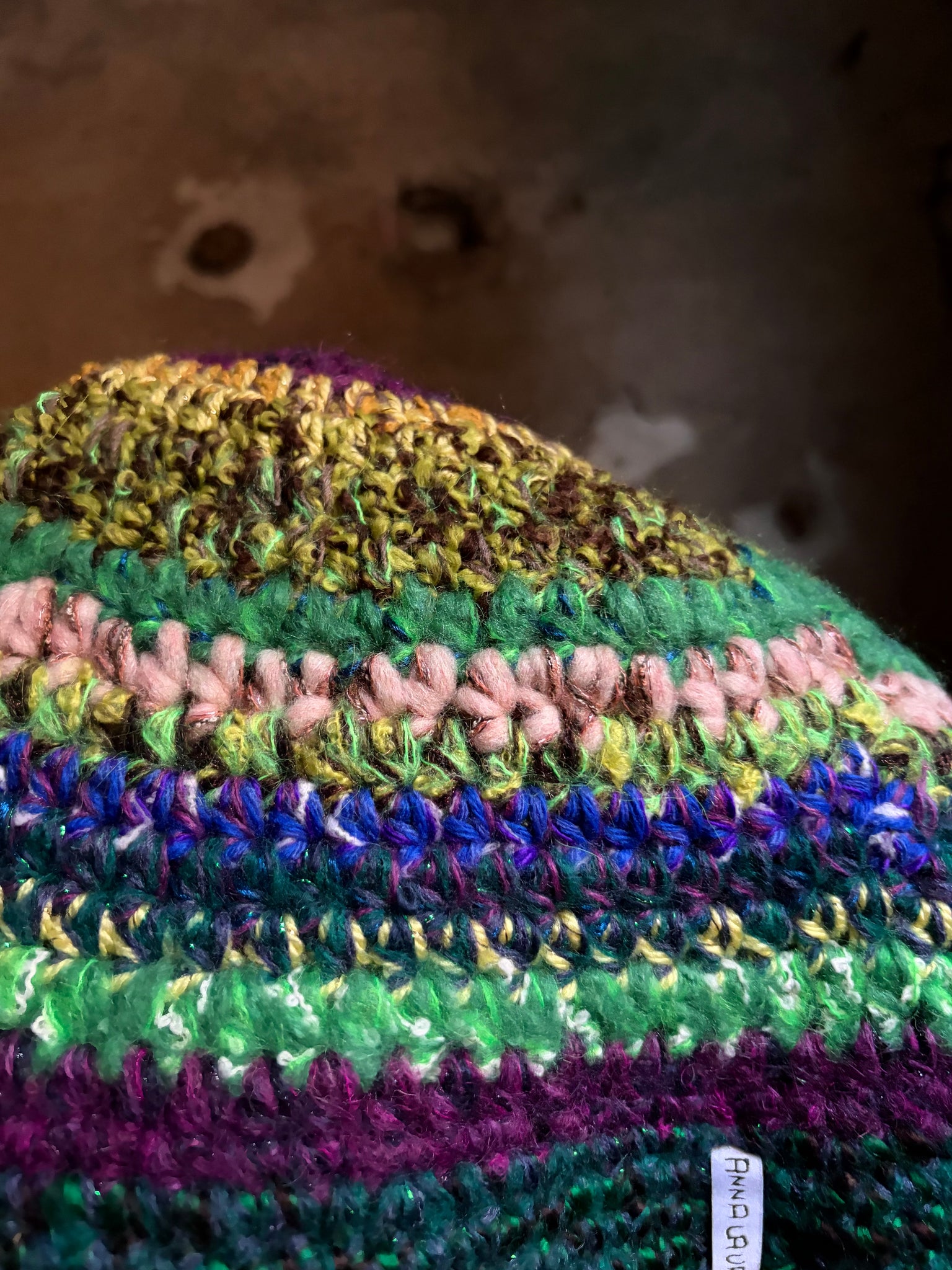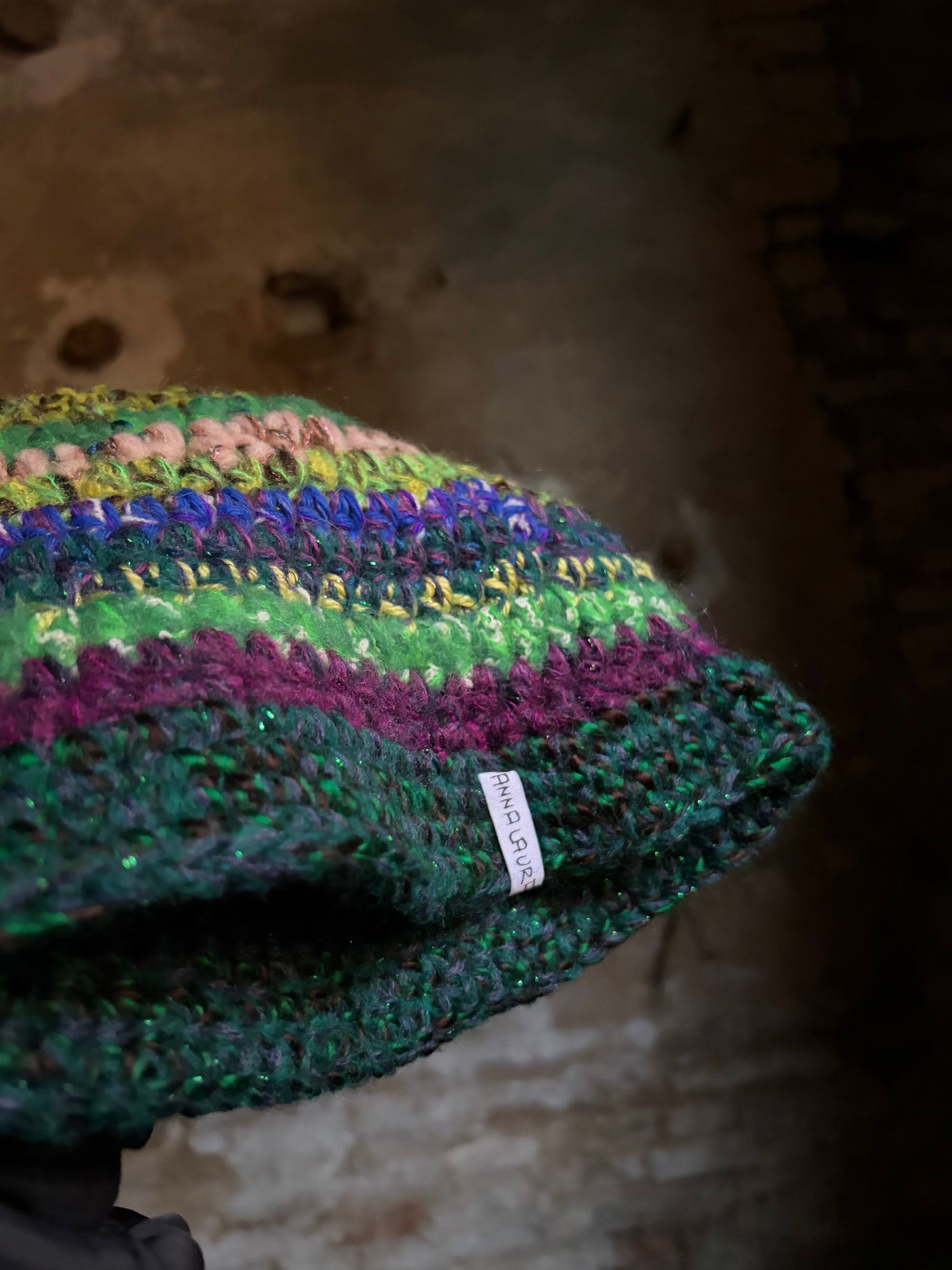 Cappellino fatto a mano a uncinetto in lane miste. Colori principali: verde, viola, bluette e inserti in giallo e rosa.