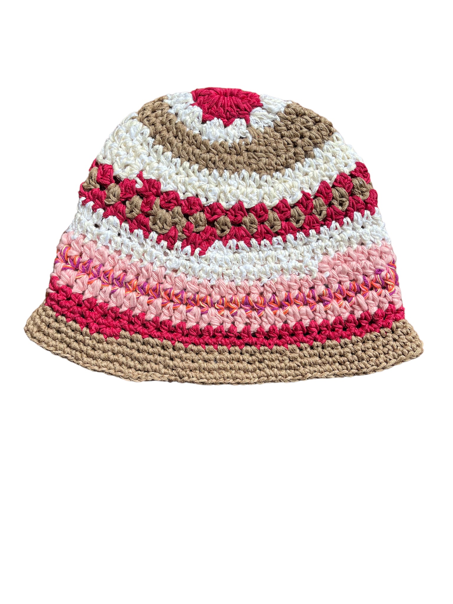 Berretto in cotone variopinto fatto a mano a uncinetto.