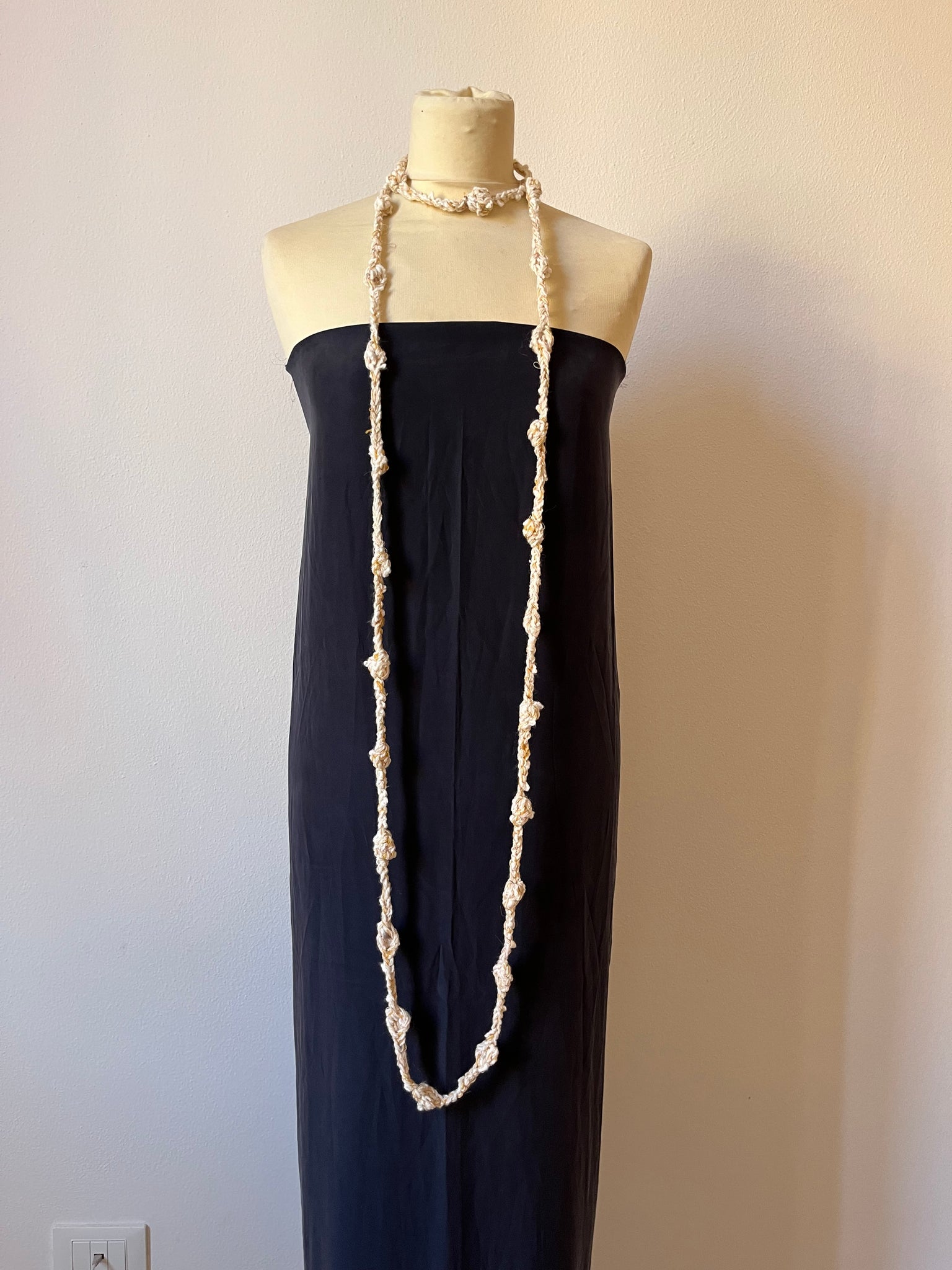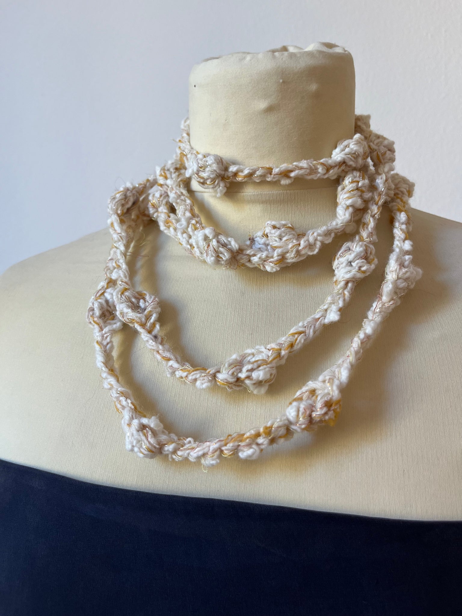 Collana in lana bianca, ocra e lurex, fatta a mano a uncinetto.
