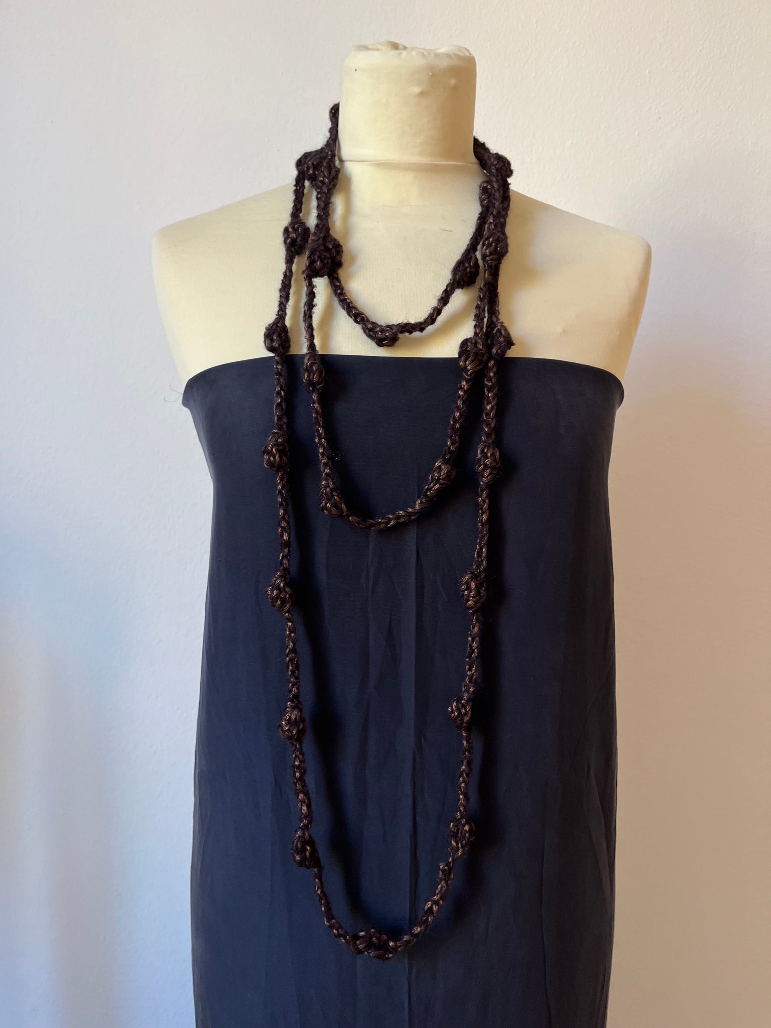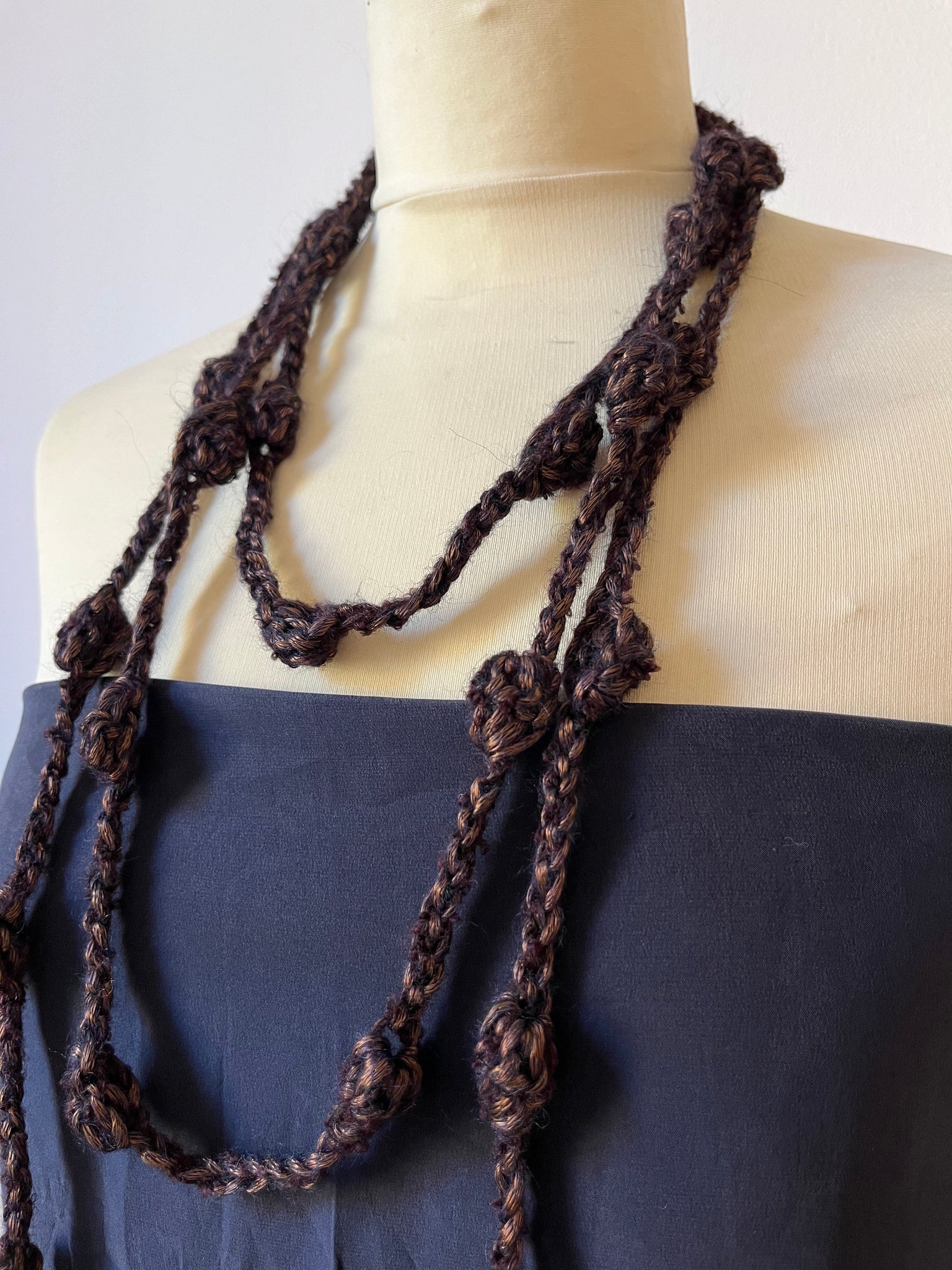 Collana in lana marrone e nera, fatta a mano a uncinetto.
