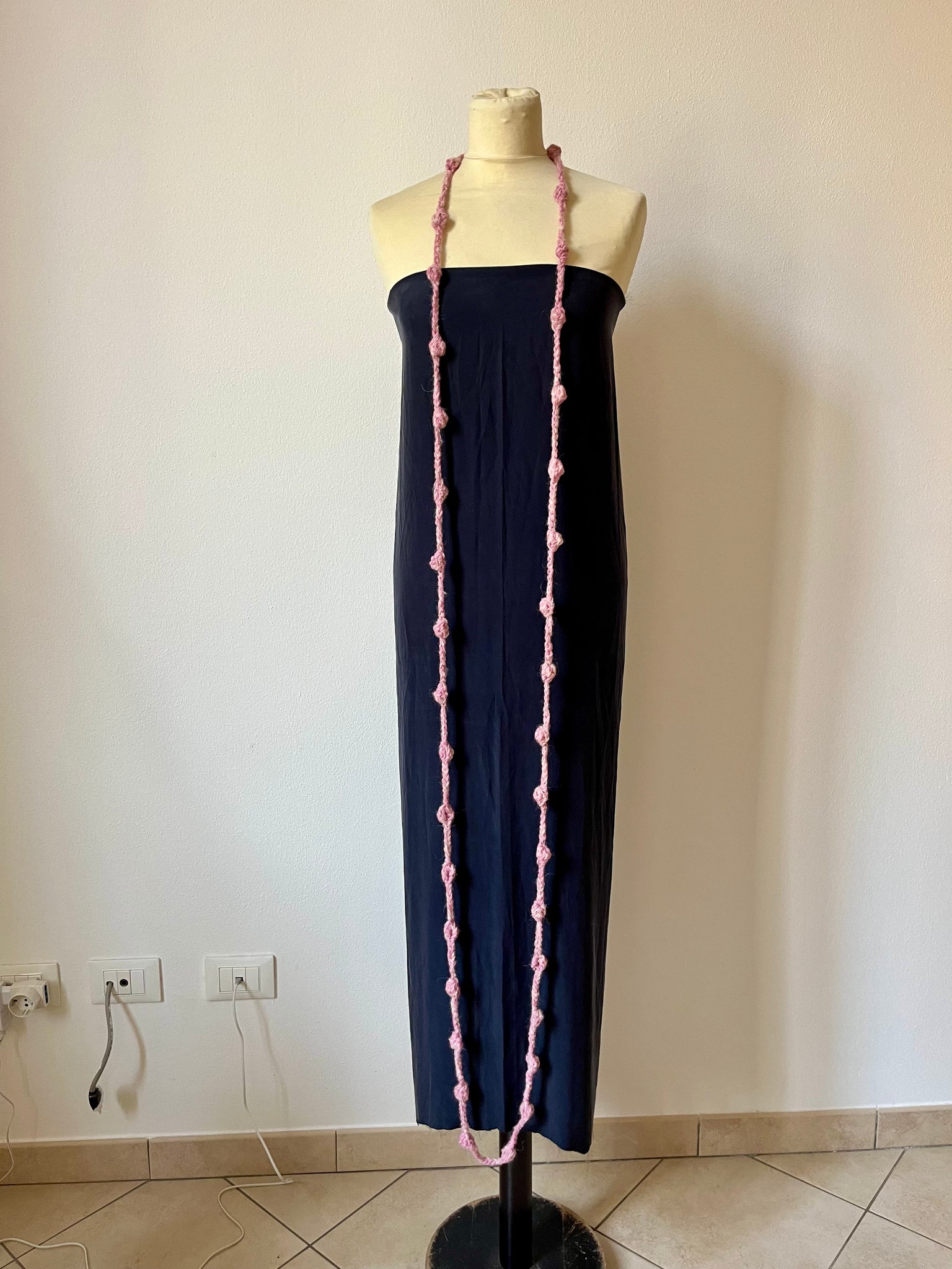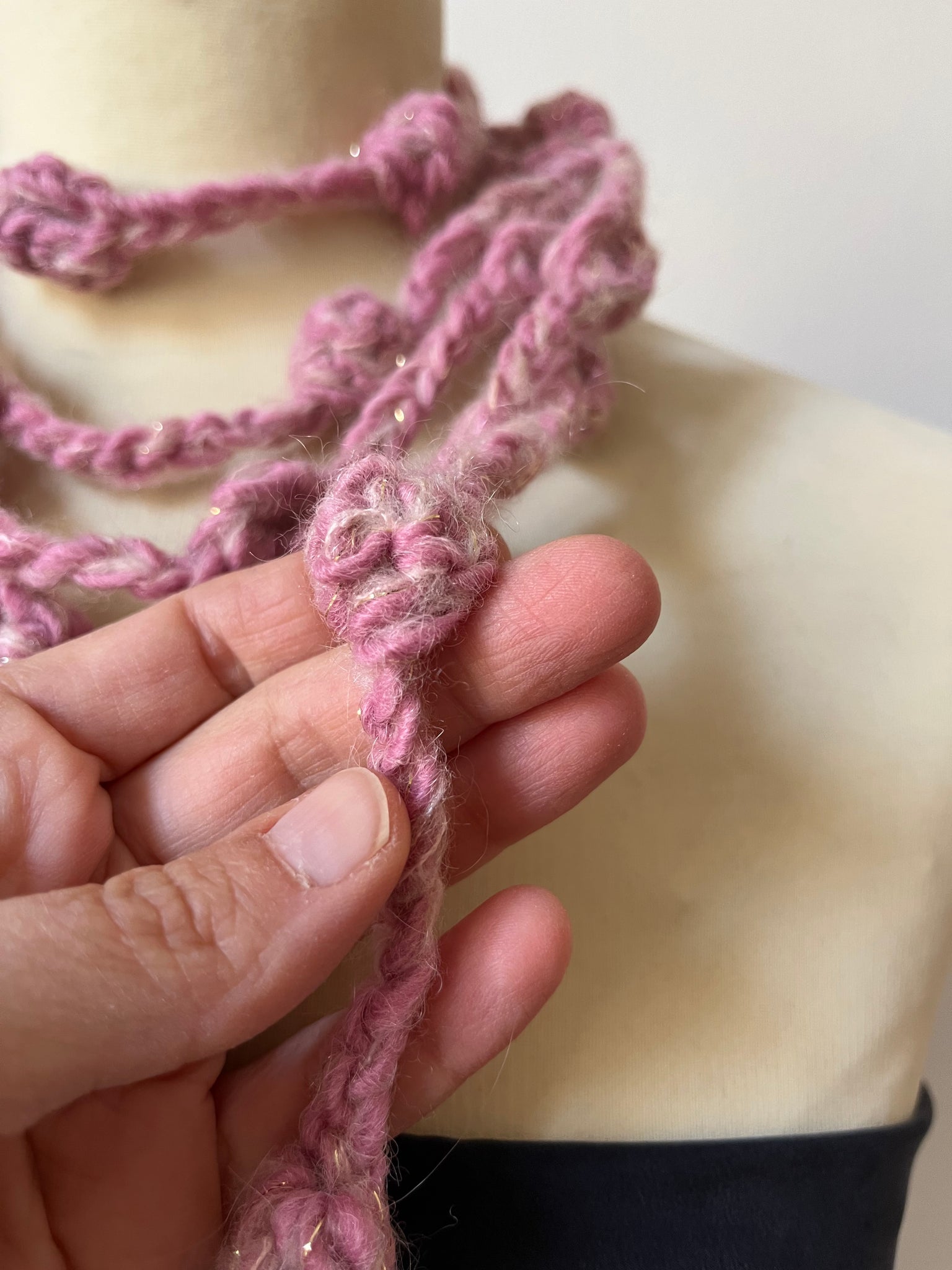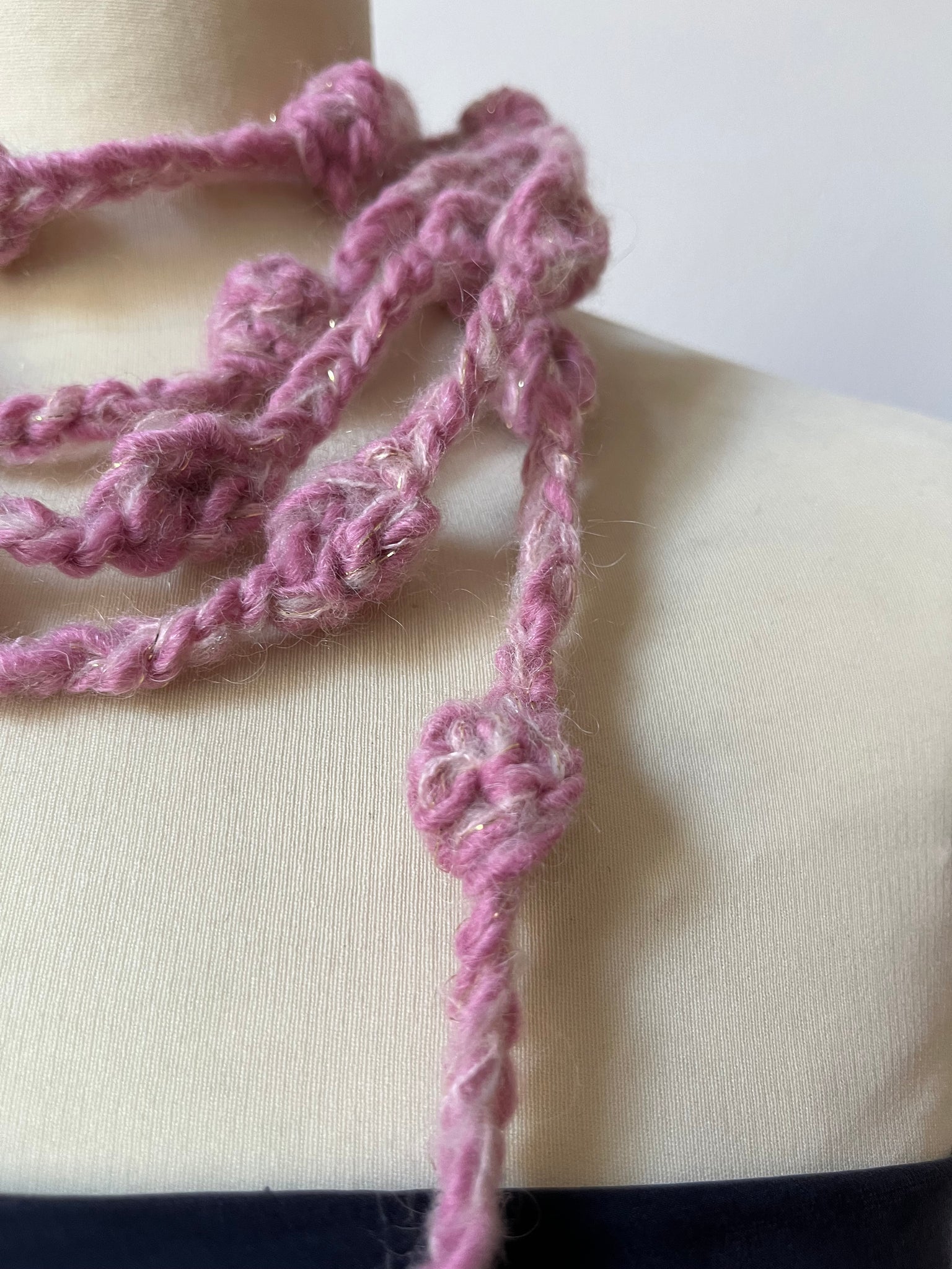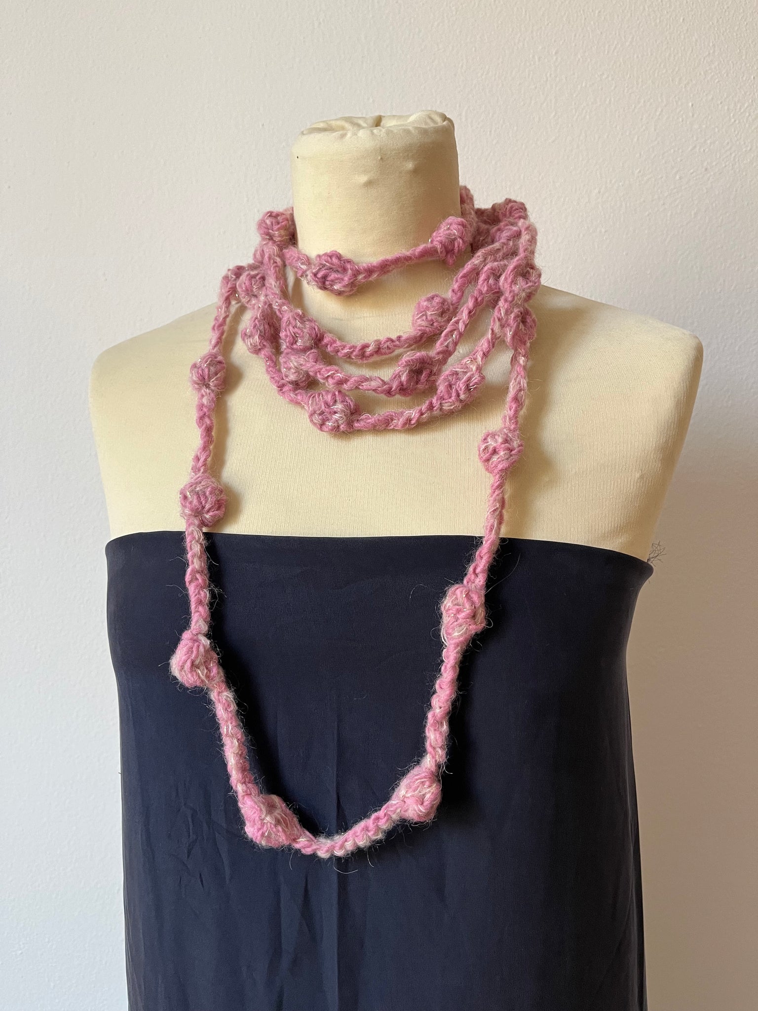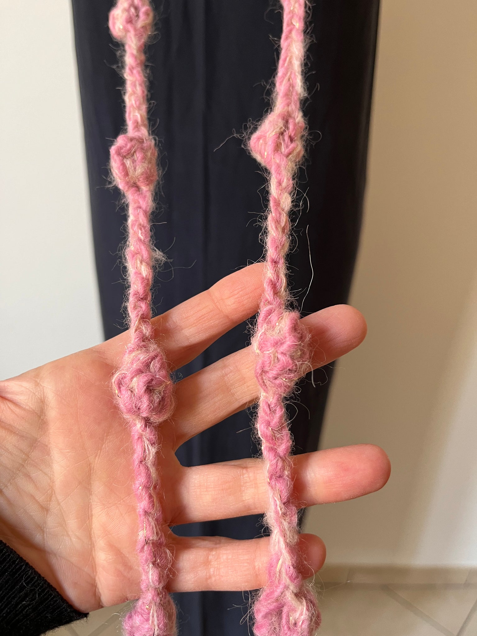 Collana fatta a mano a uncinetto in lana rosa, filo di lana mohair rosa chiaro, per renderla più soffice e voluminosa, e lurex oro per aggiungere luminosità.