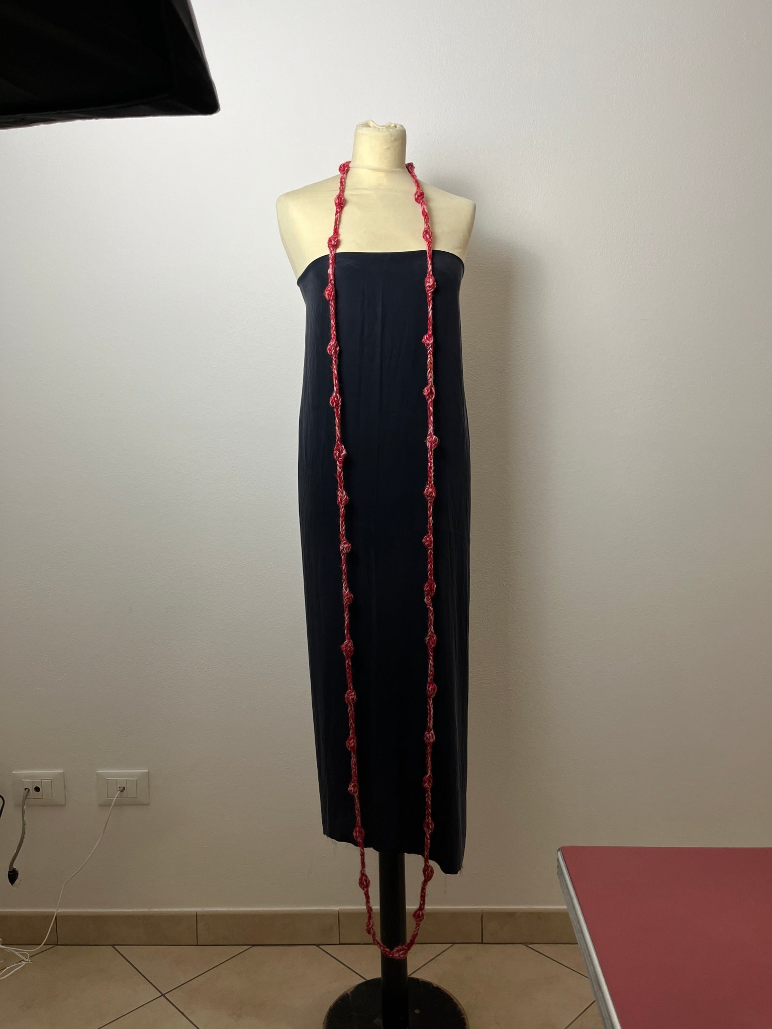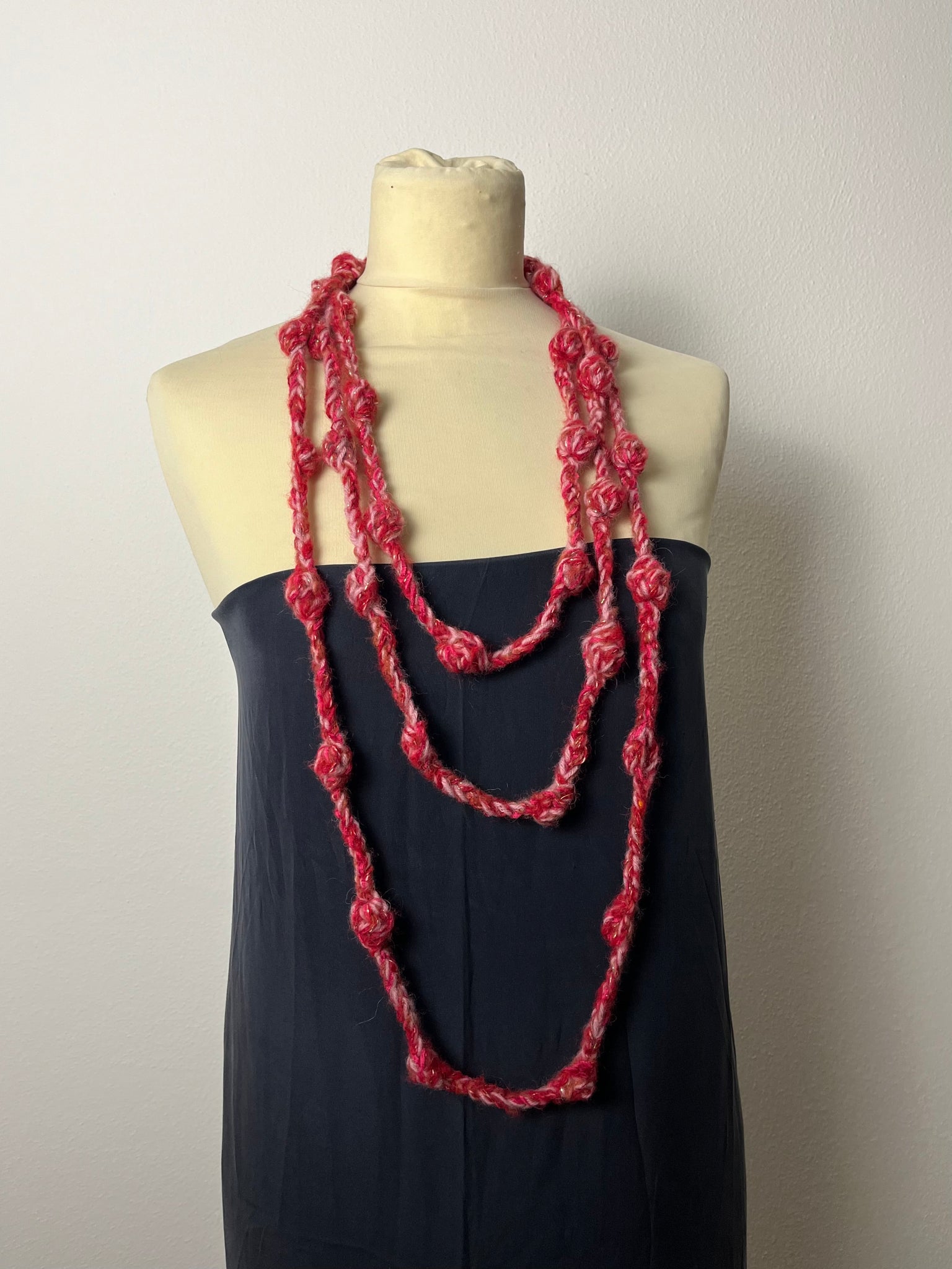 Collana fatta a mano a uncinetto con lana mista rosa e rosso con filo sottile in lurex oro.