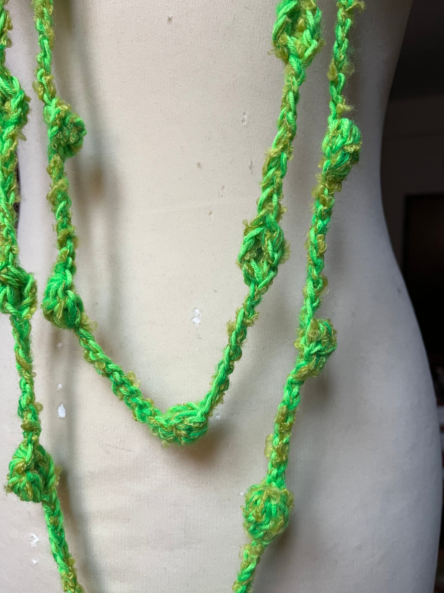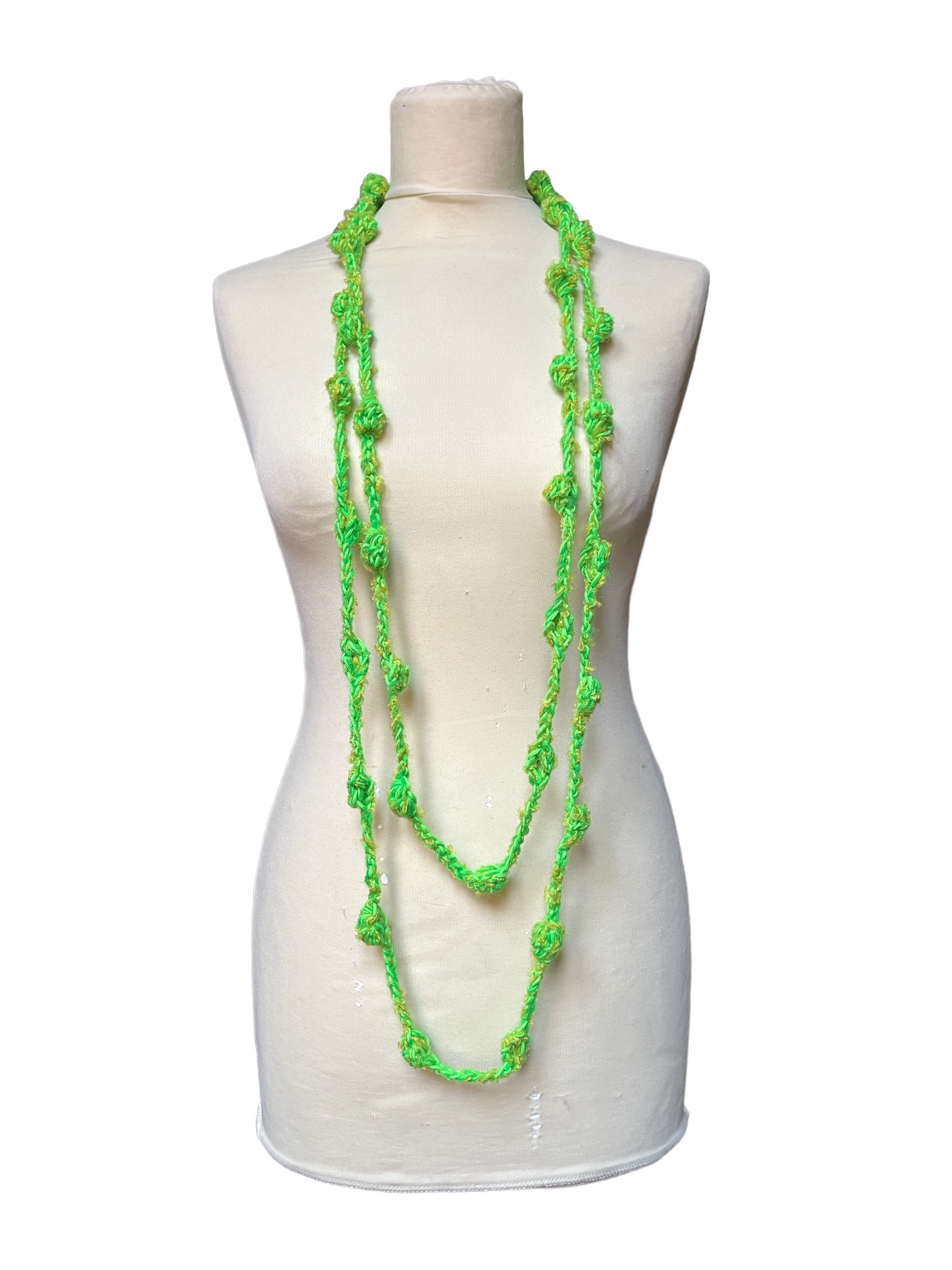 Collana fatta a mano a uncinetto con lana mista verde mela, verde e giallo in lana bouclè.