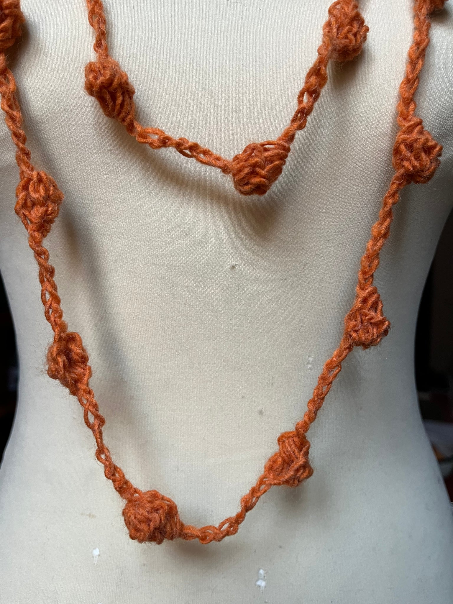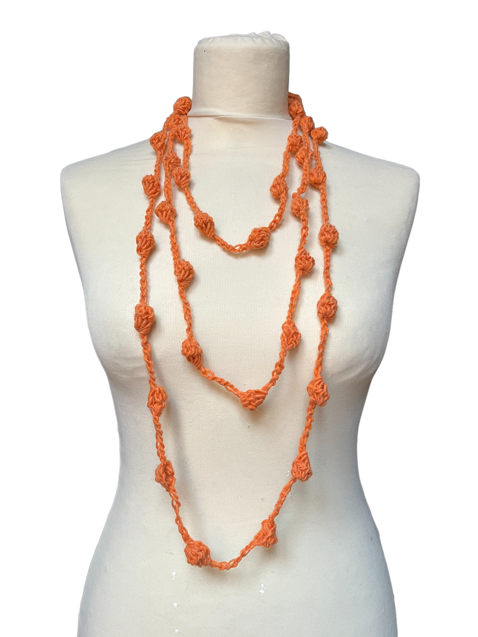 Collana in lana fatta a mano a uncinetto. Lunghezza totale 280 cm.