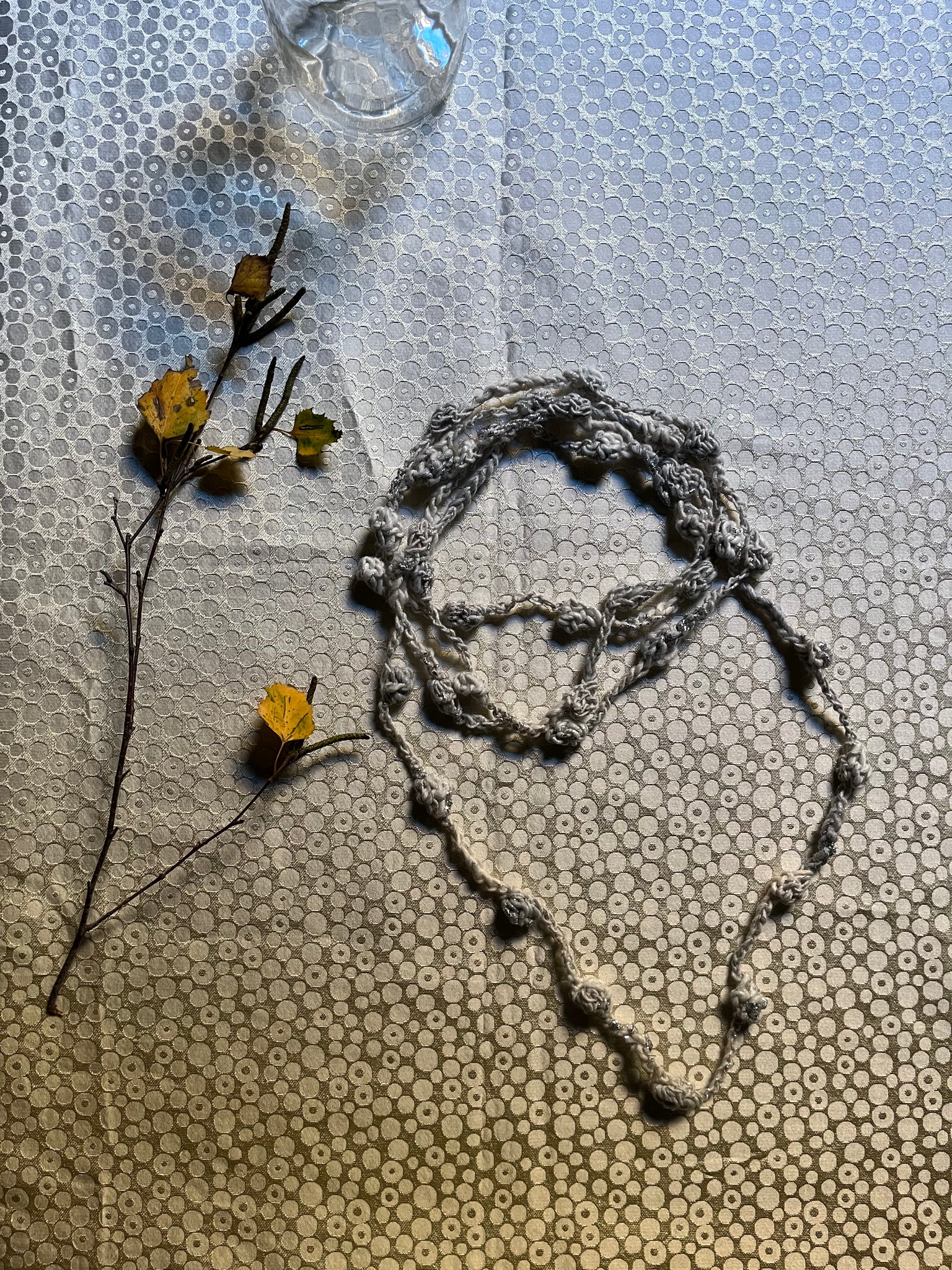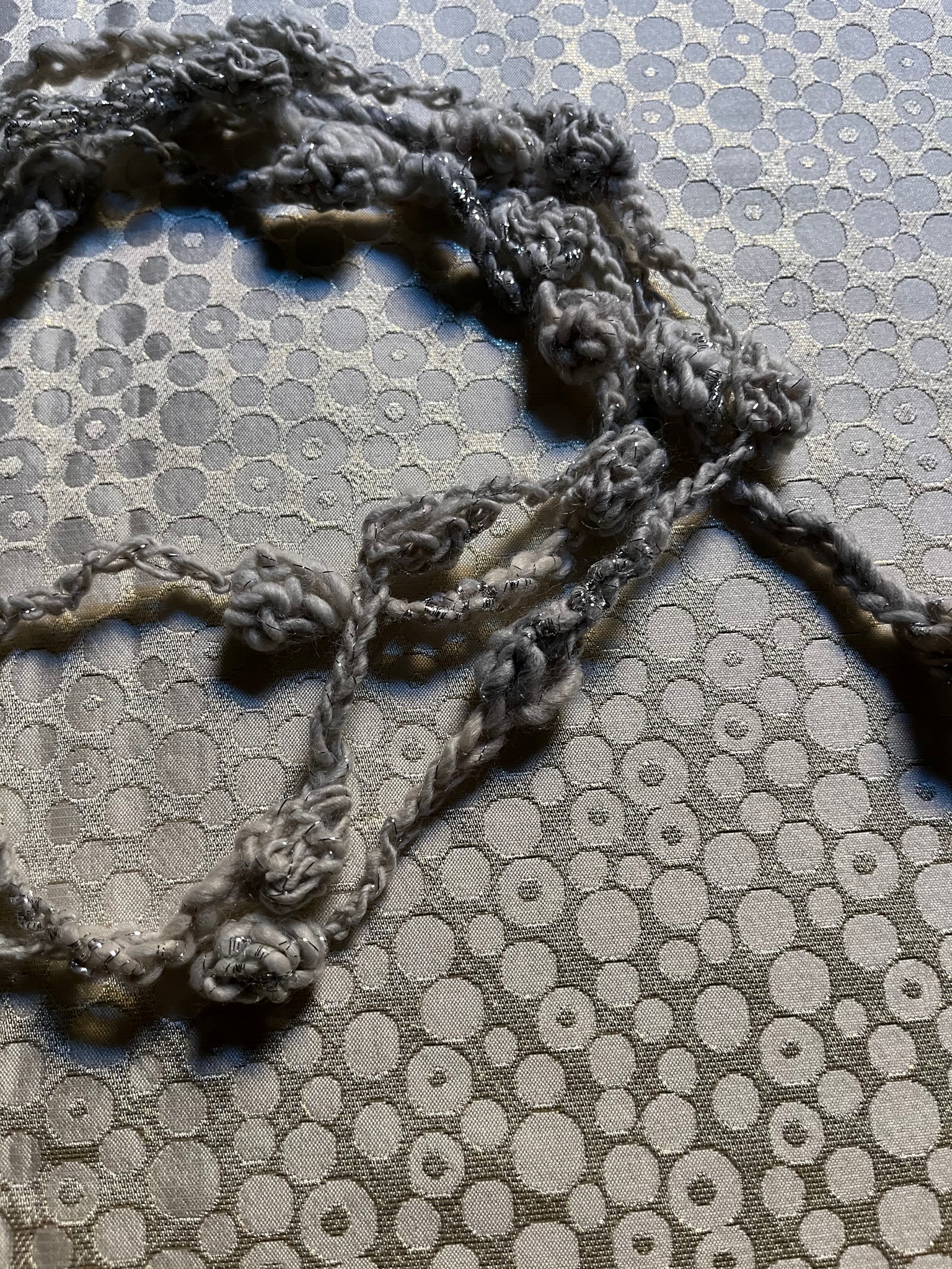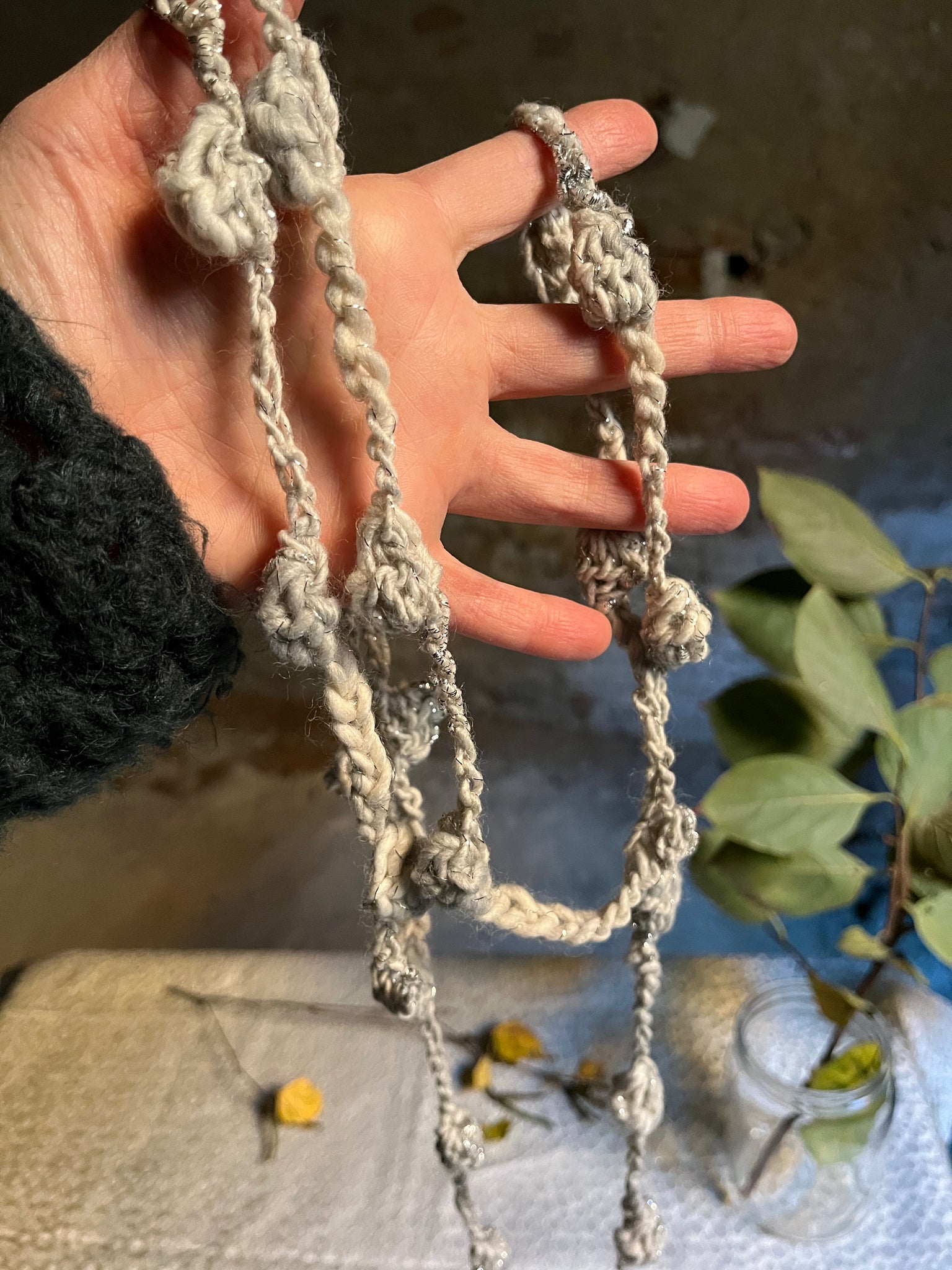 Collana fatta a mano a uncinetto in lana color grigio ghiaccio mélange e lurex argento.
