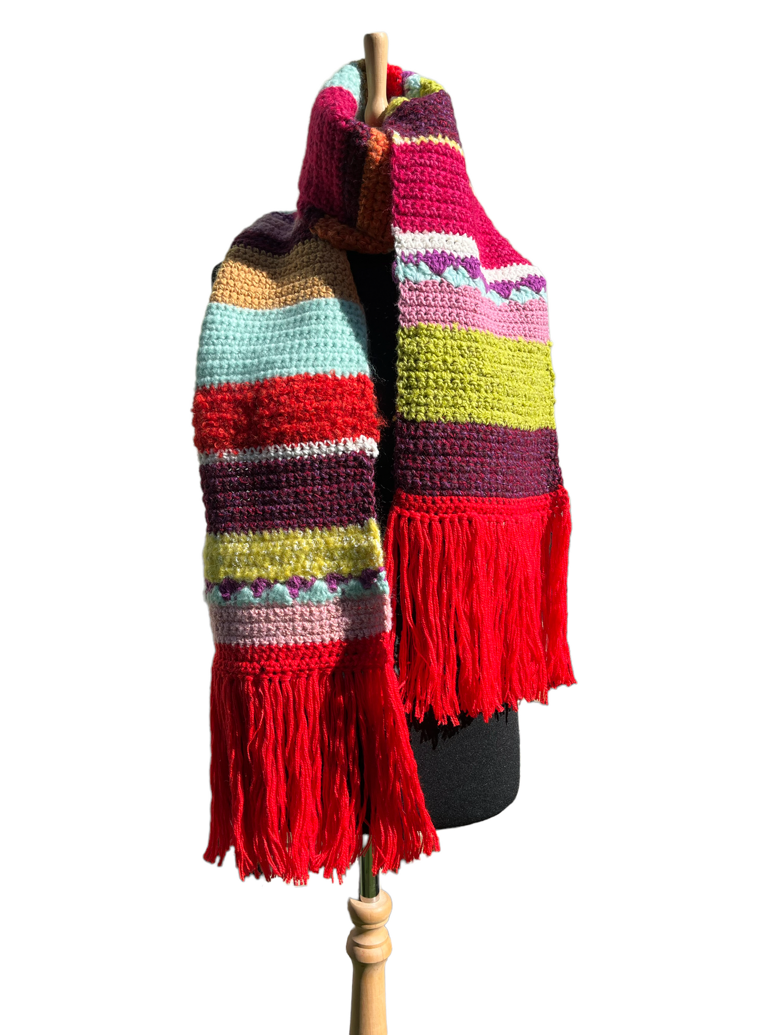 Sciarpa in lana fatta a mano a uncinetto. Lavorazione a righe multicolor e frange rosso fuoco.