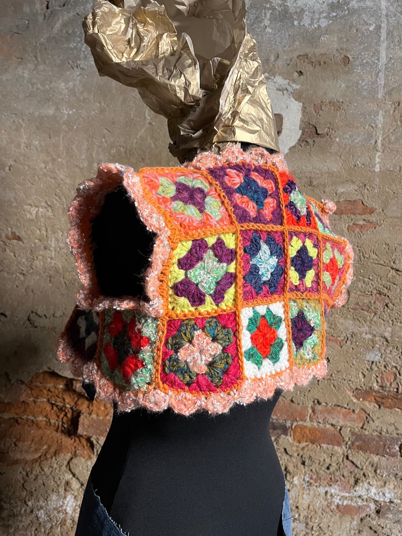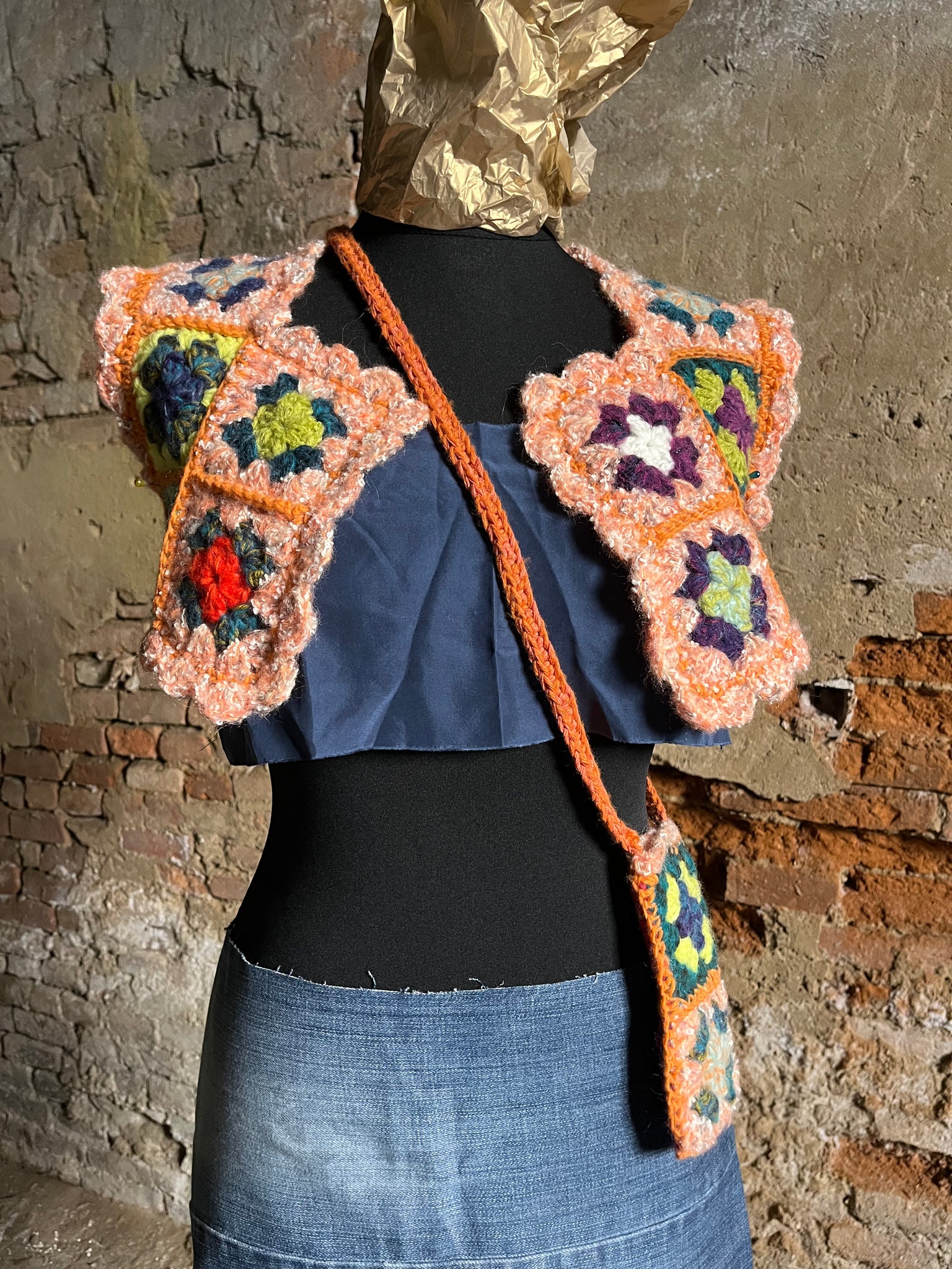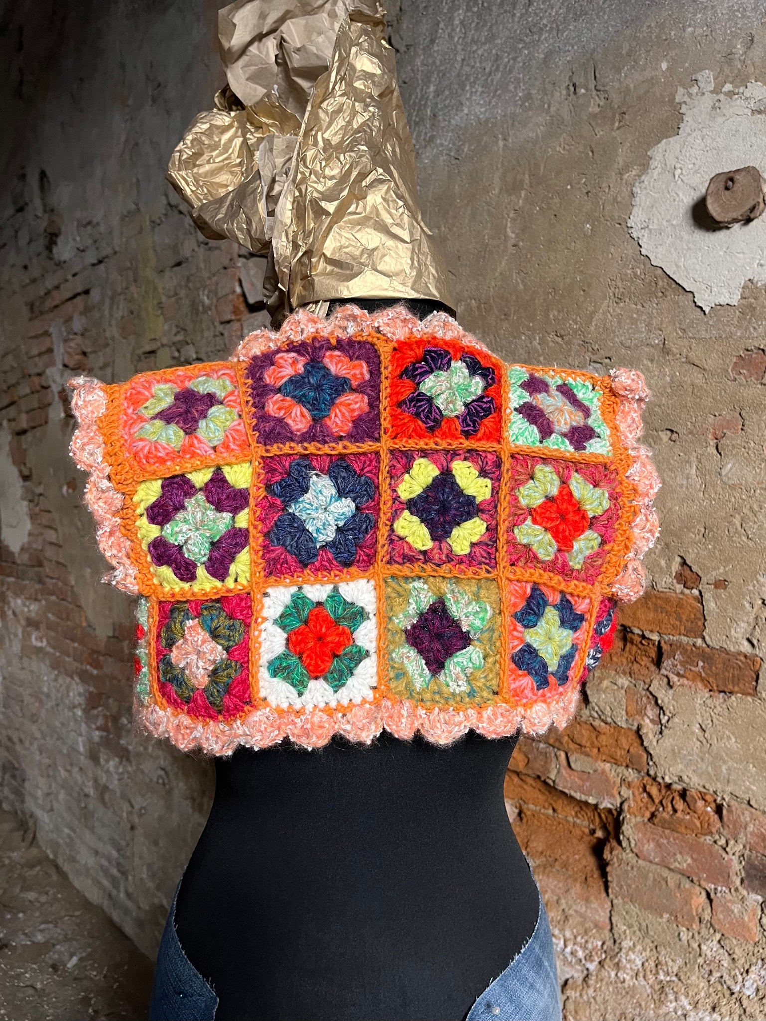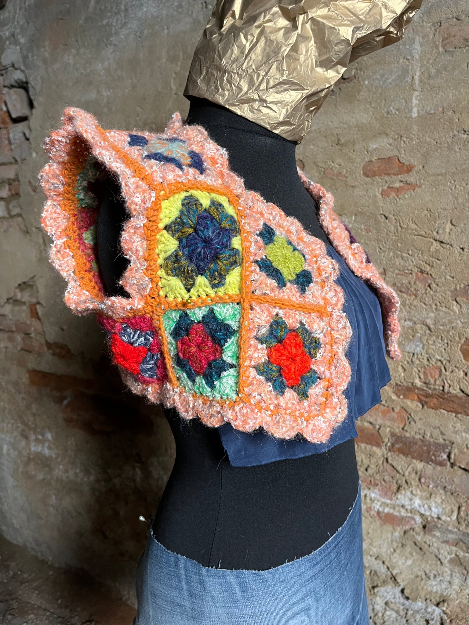 Coprispalle in lana fatto a mano a uncinetto con quadrotti.