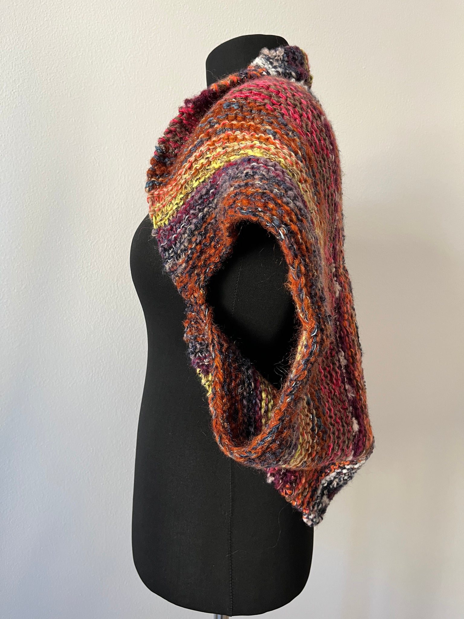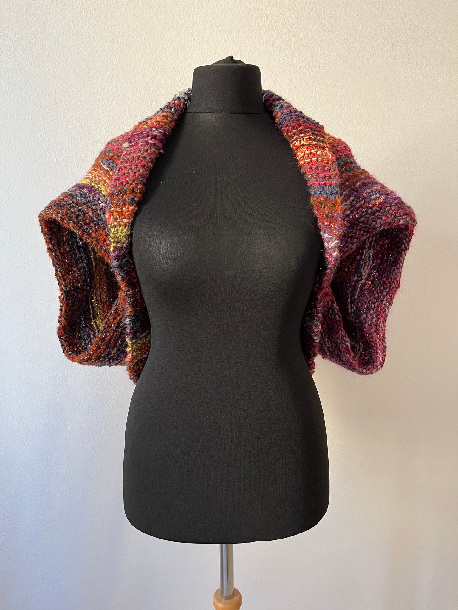 Coprispalle in lana fatto a mano a ferri. Può essere chiuso con una spilla a piacere.