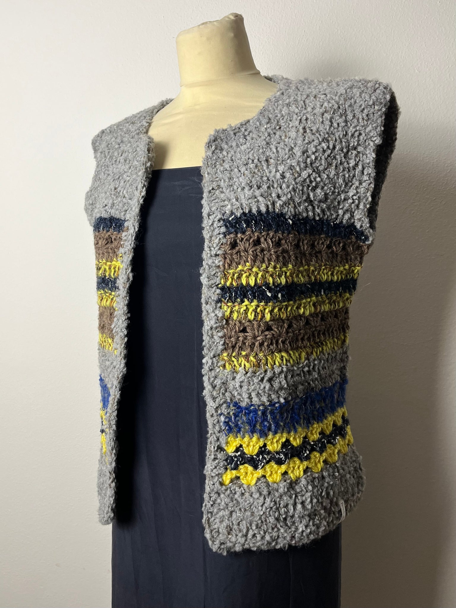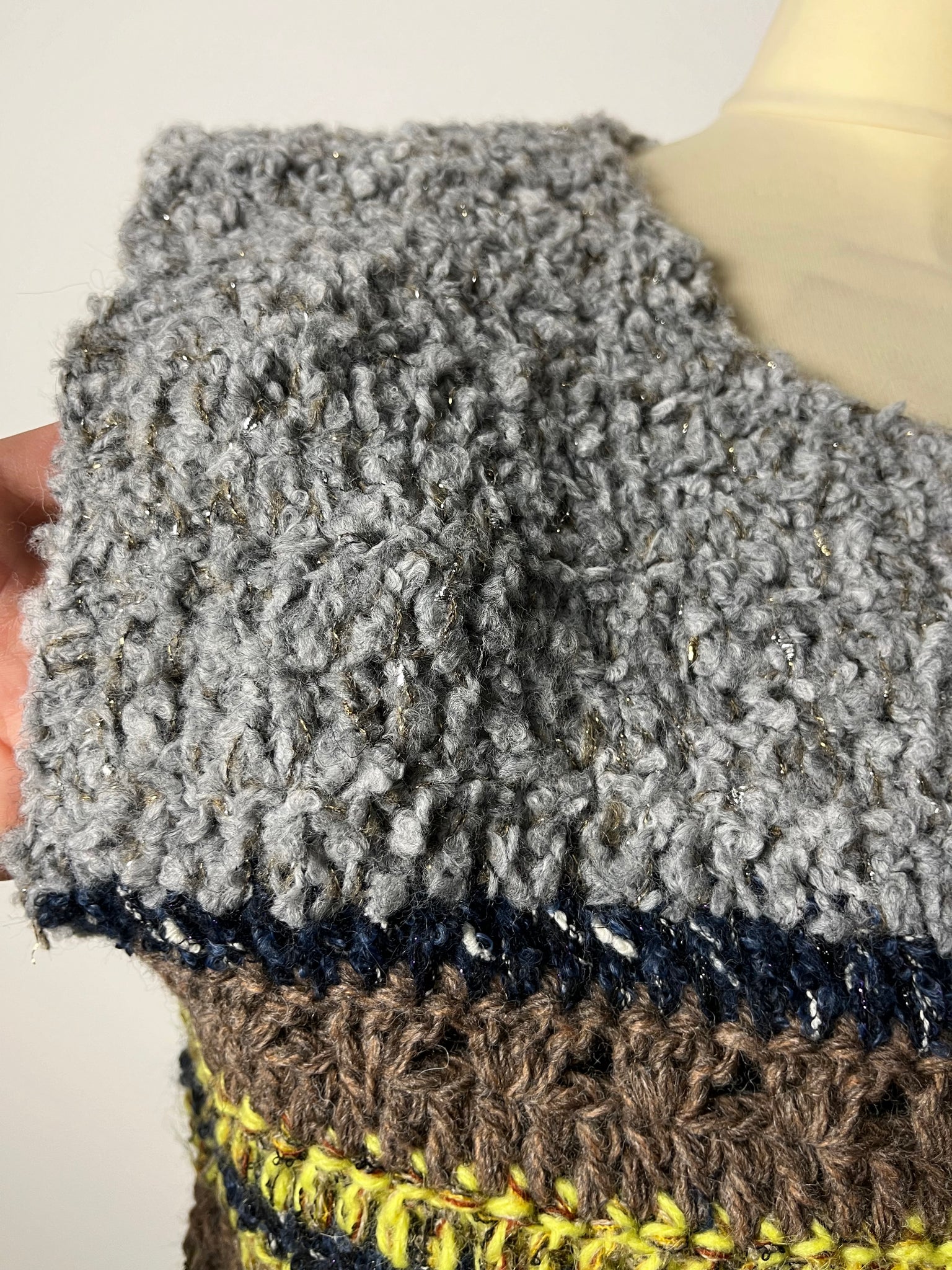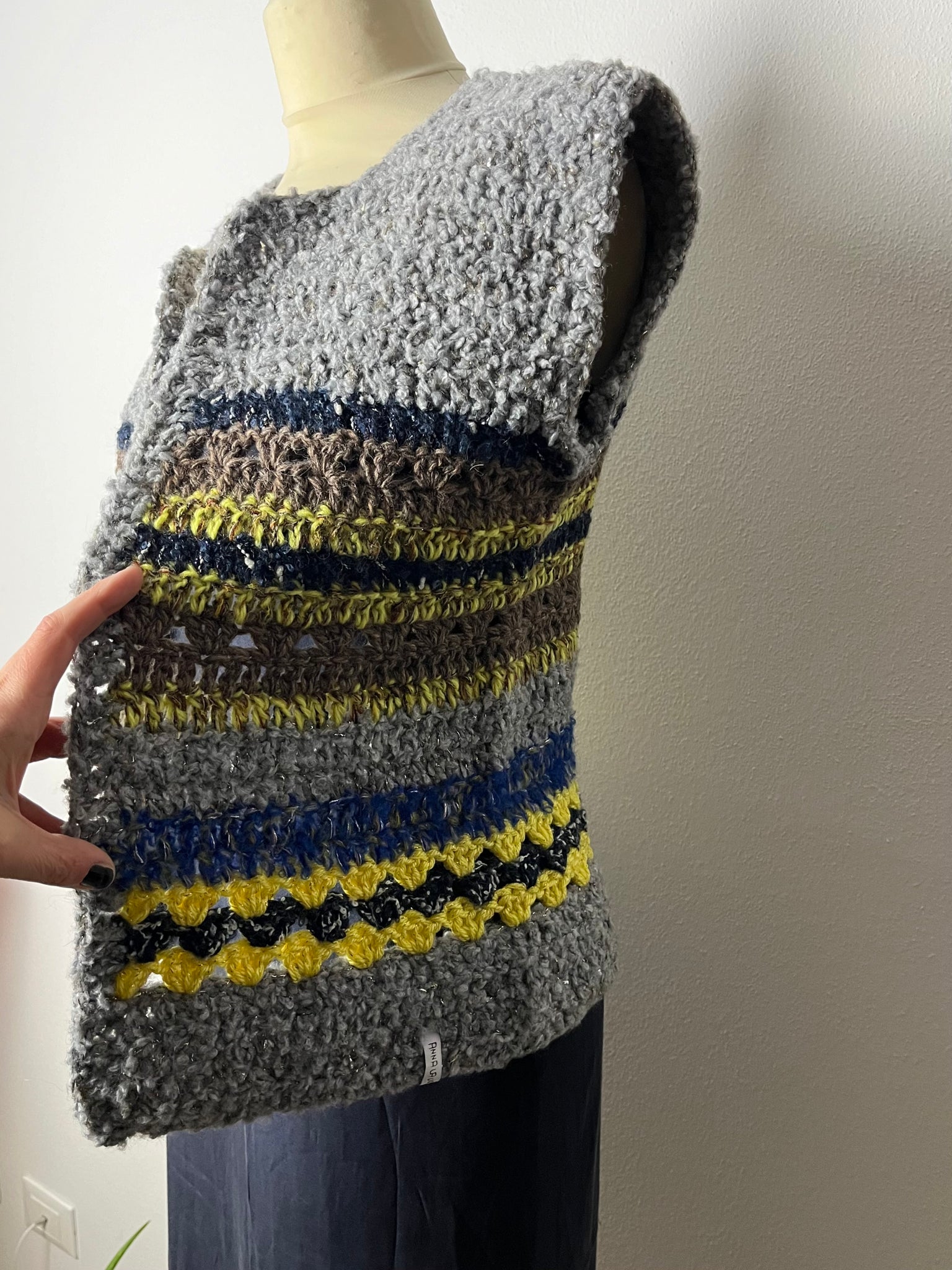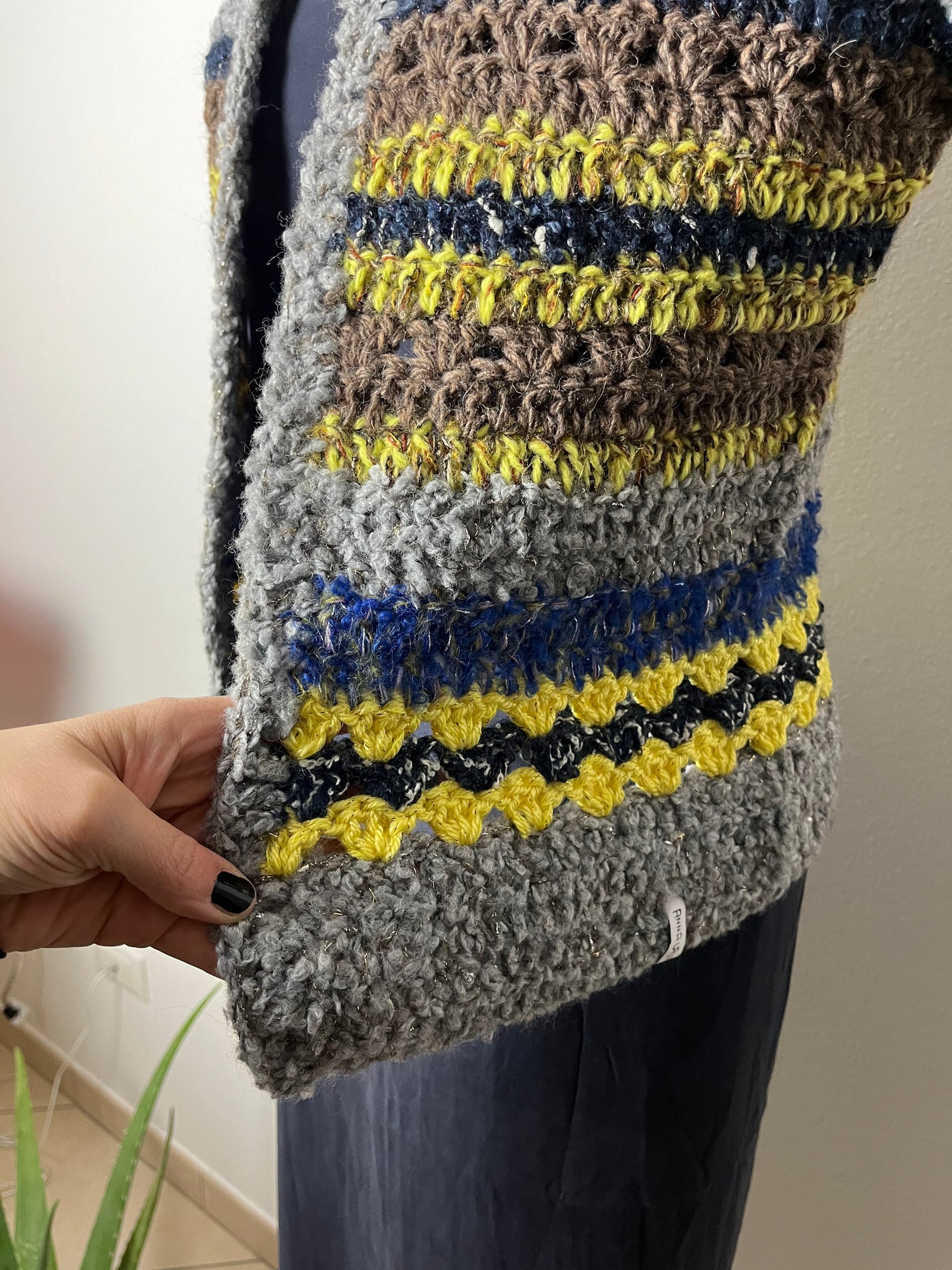 Gilet in lana mista e lurex lavorato a mano a uncinetto.