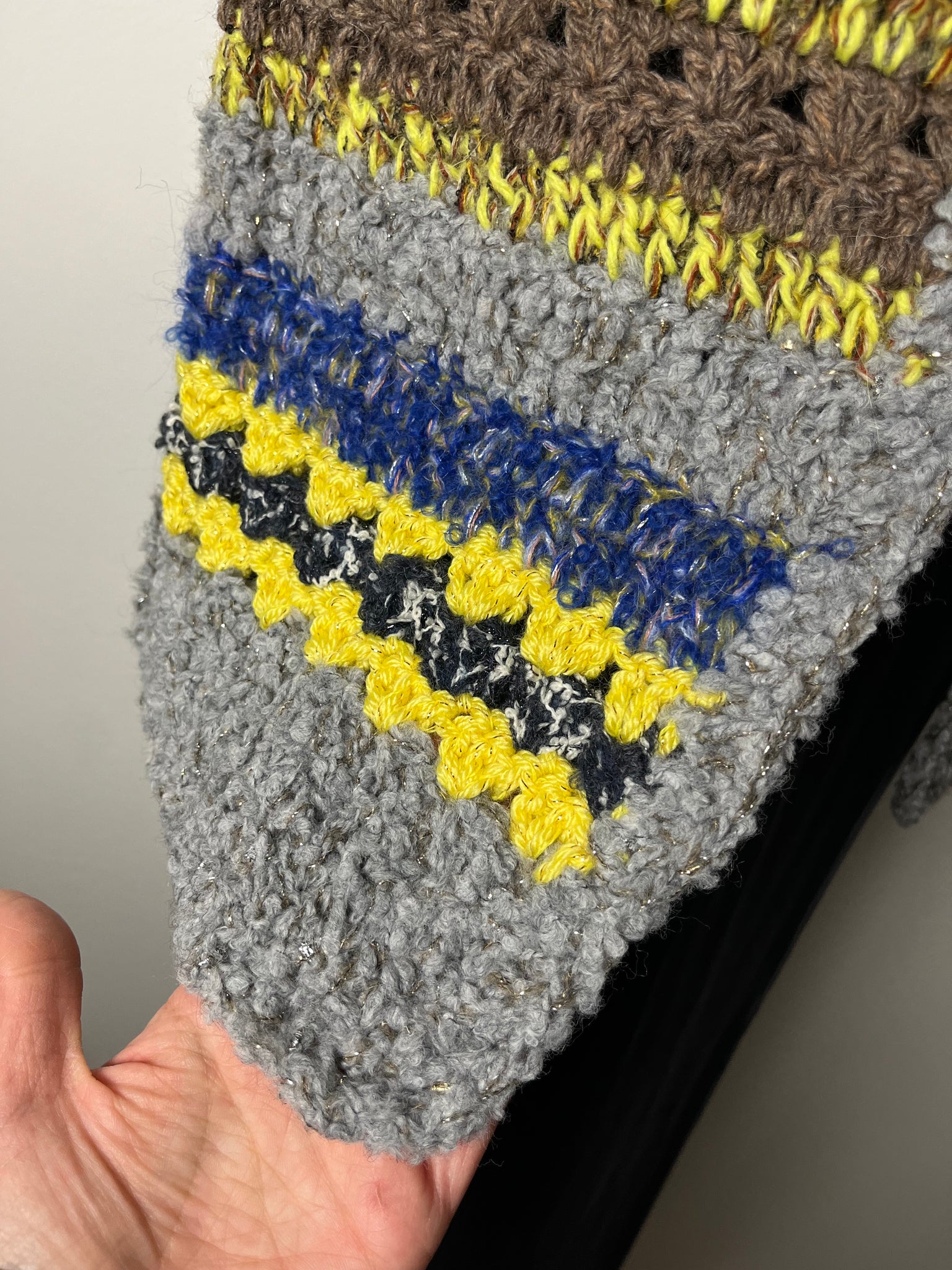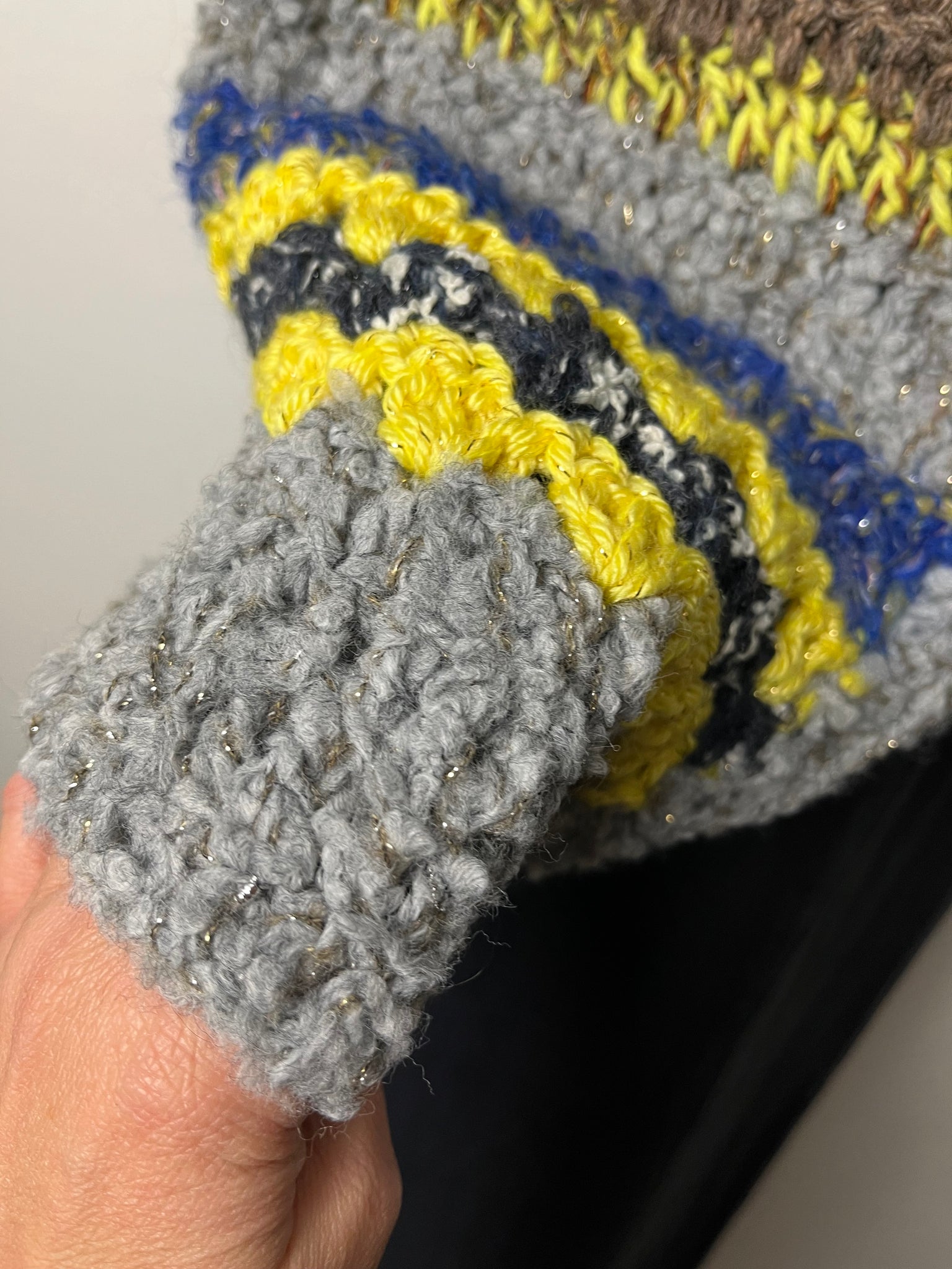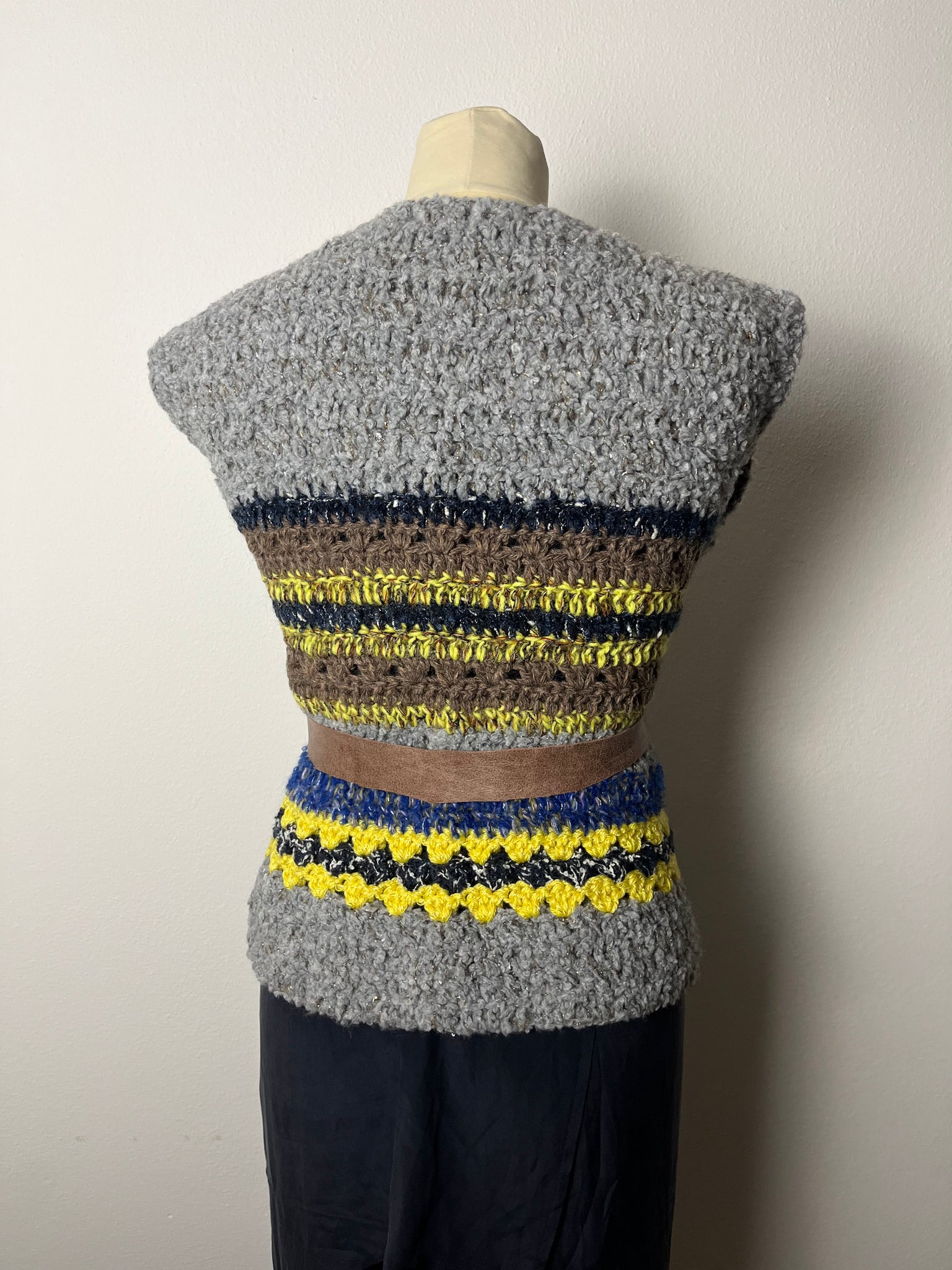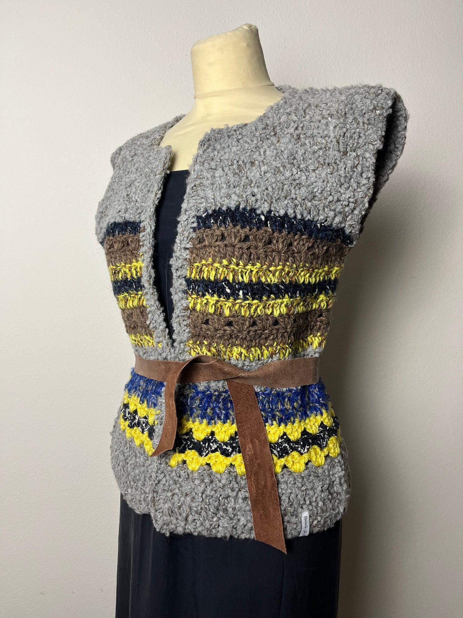 Gilet in lana mista e lurex lavorato a mano a uncinetto.