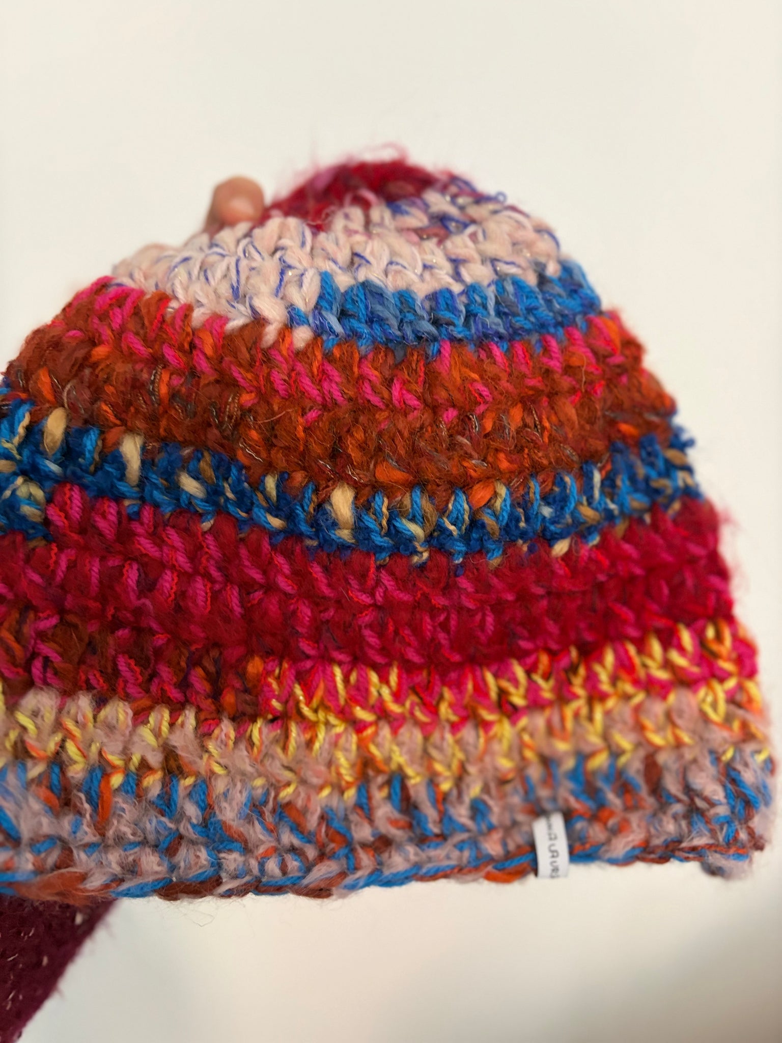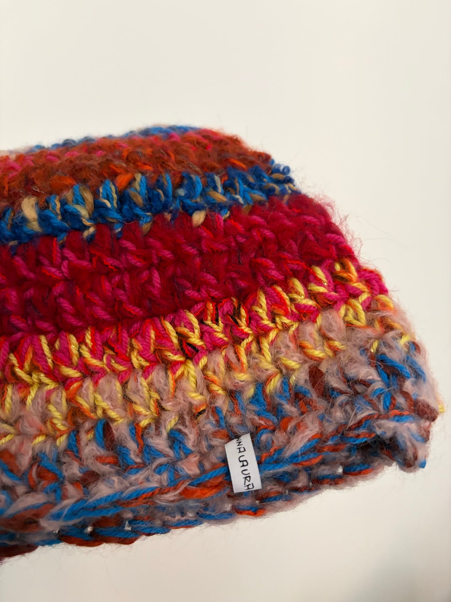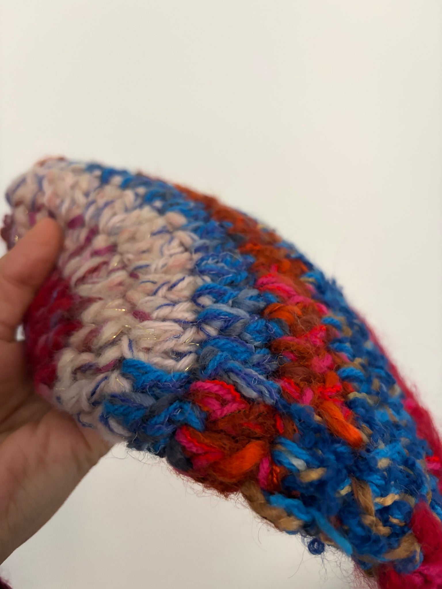 Berretto in lane miste multicolor sui toni del celeste e del rosso fatto a mano a uncinetto.