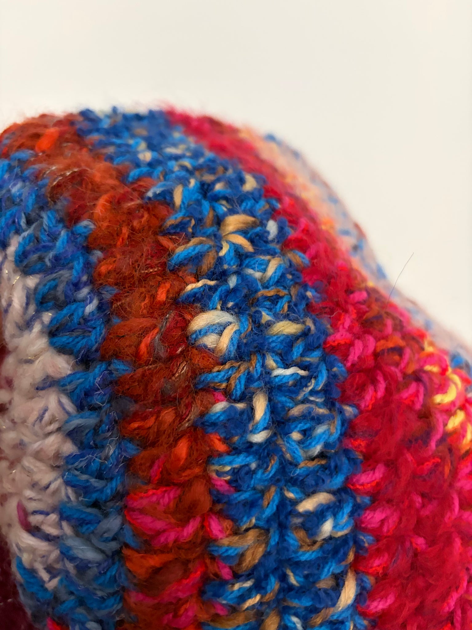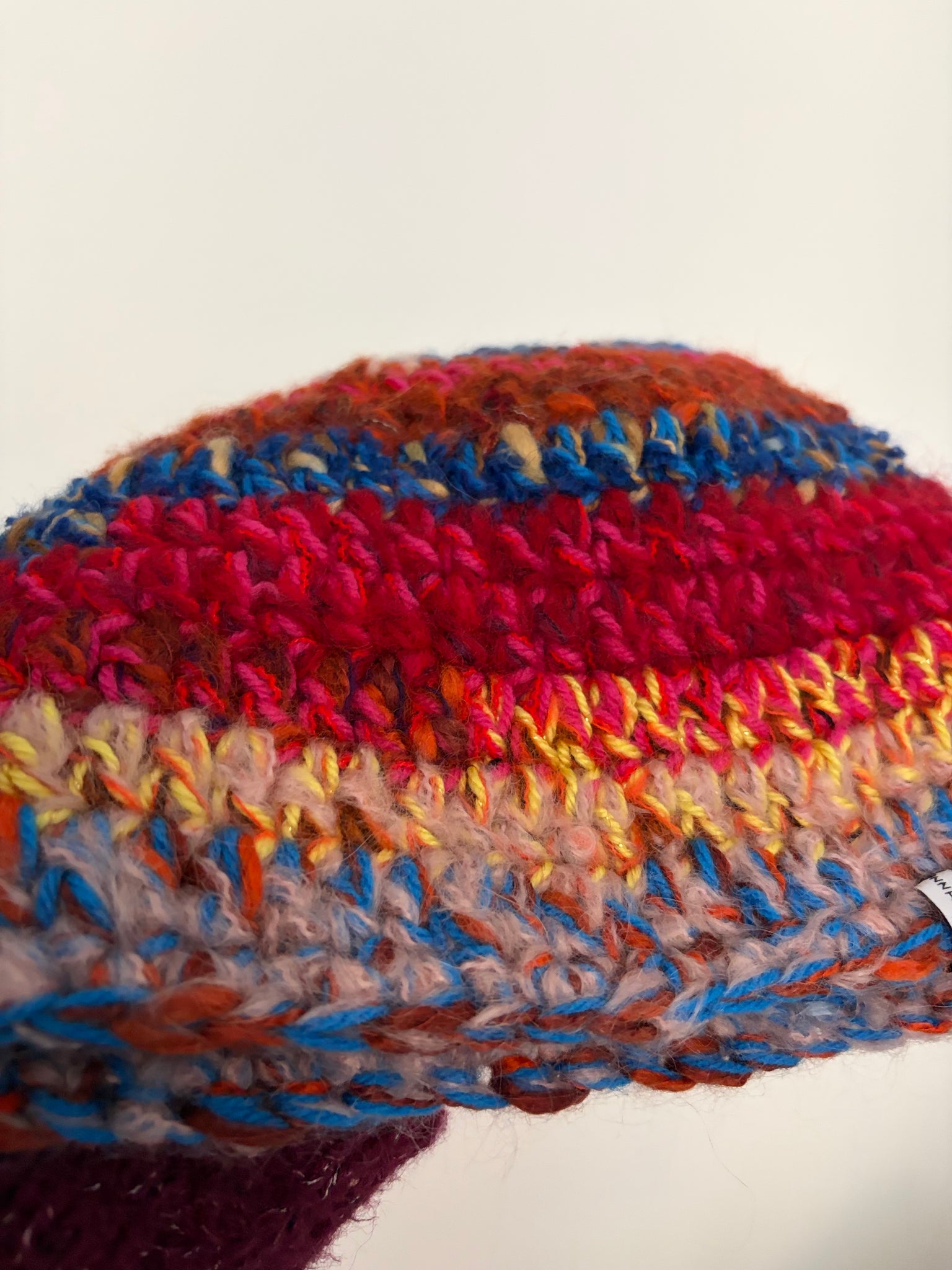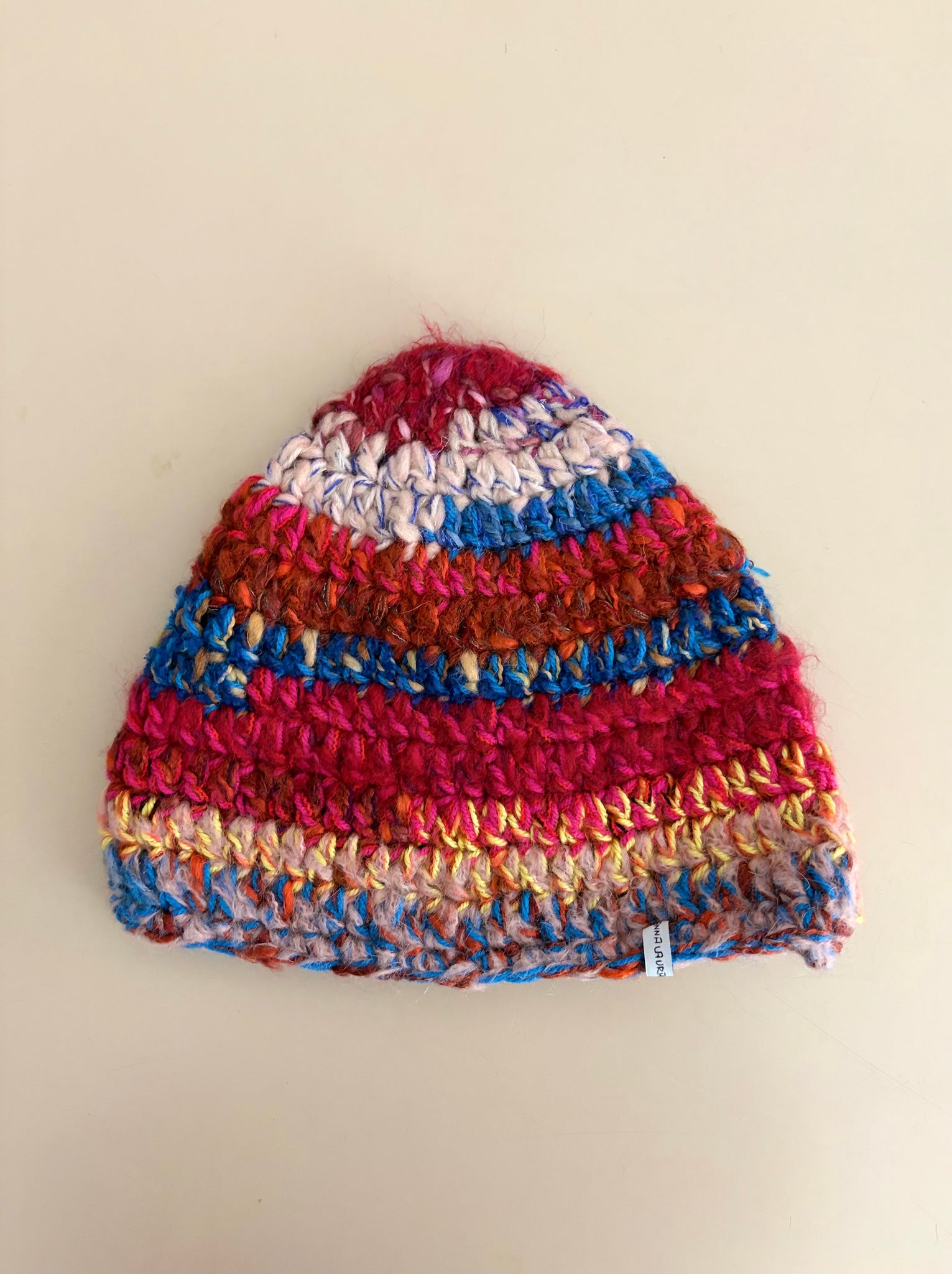 Berretto in lane miste multicolor sui toni del celeste e del rosso fatto a mano a uncinetto.