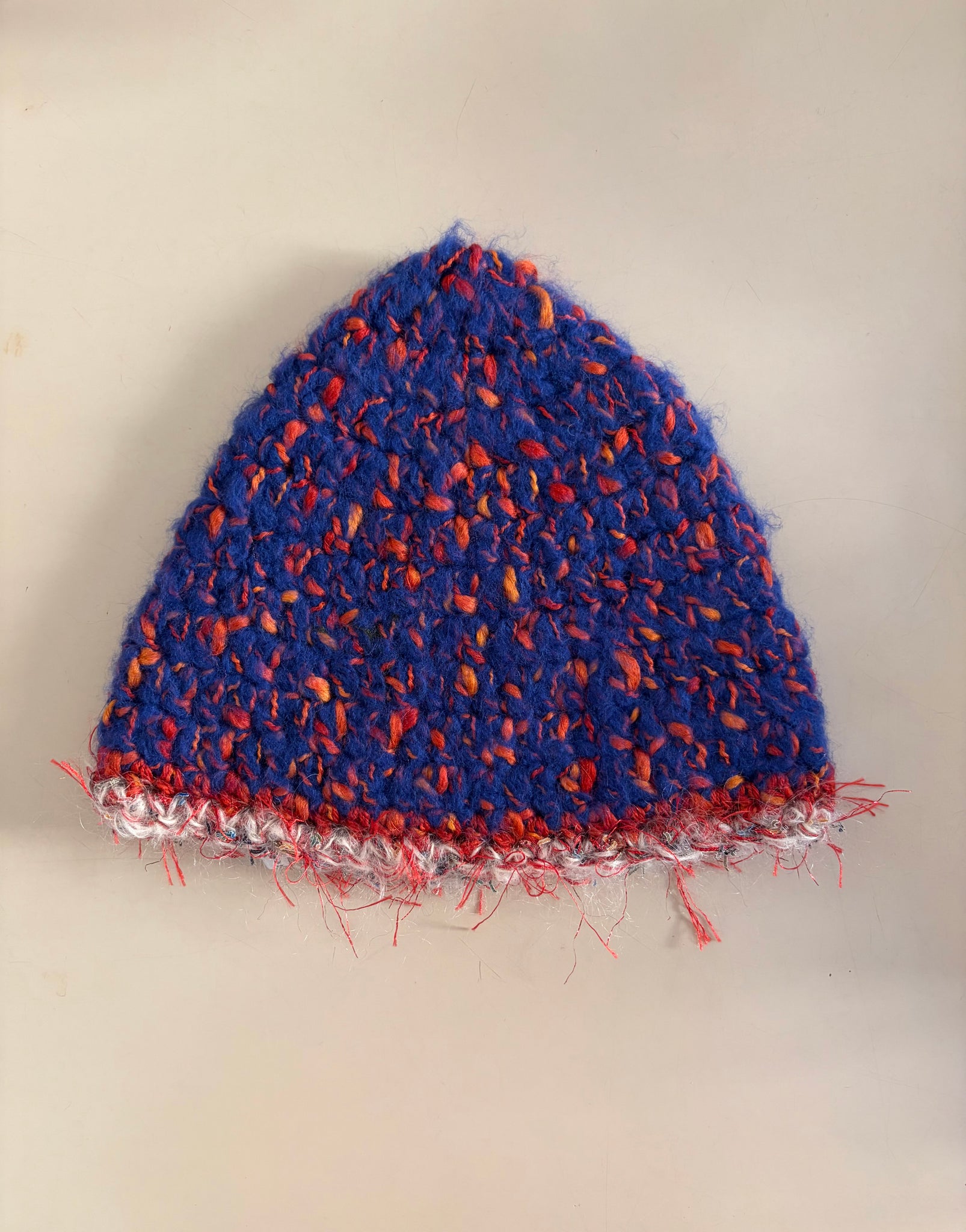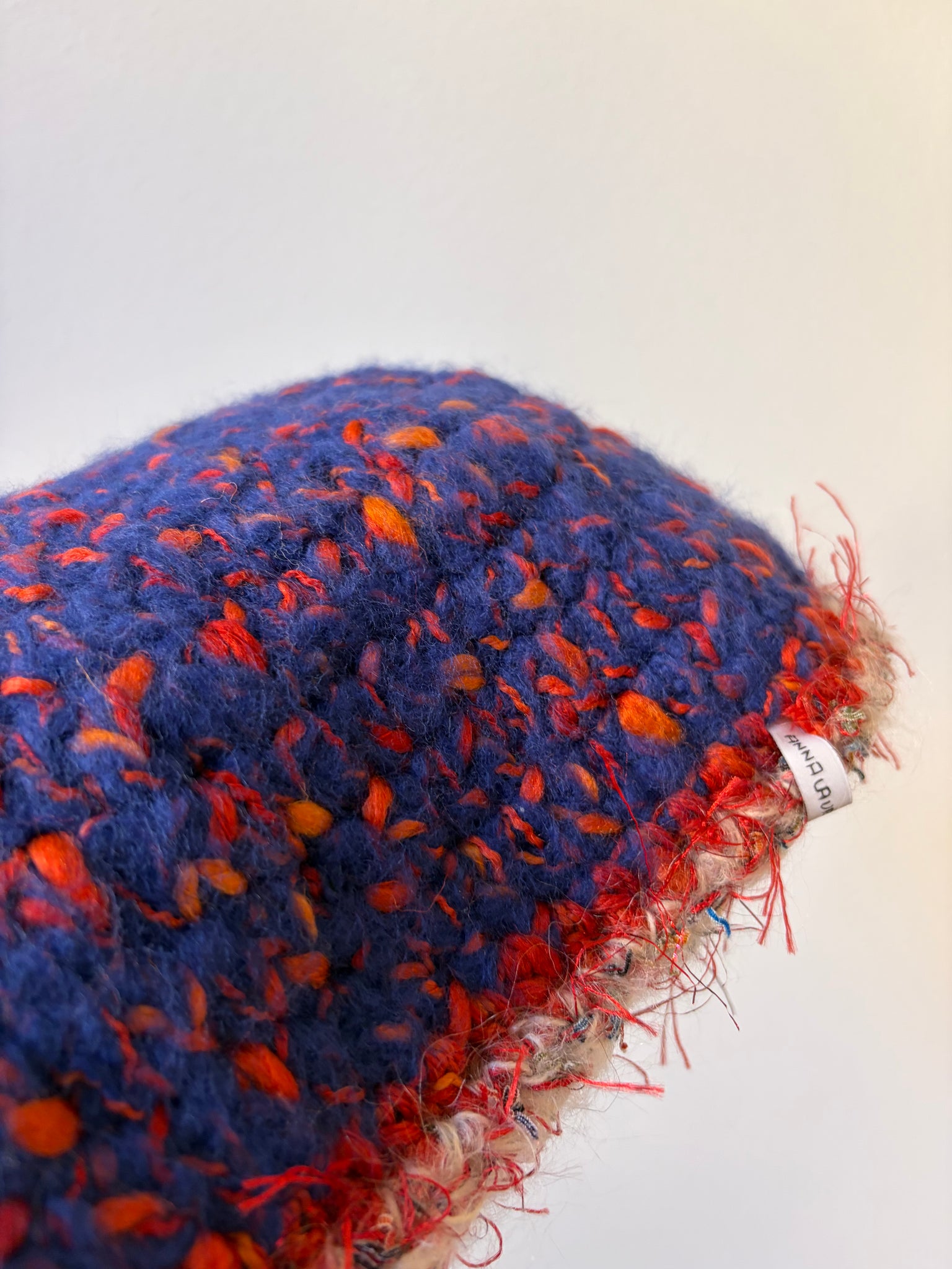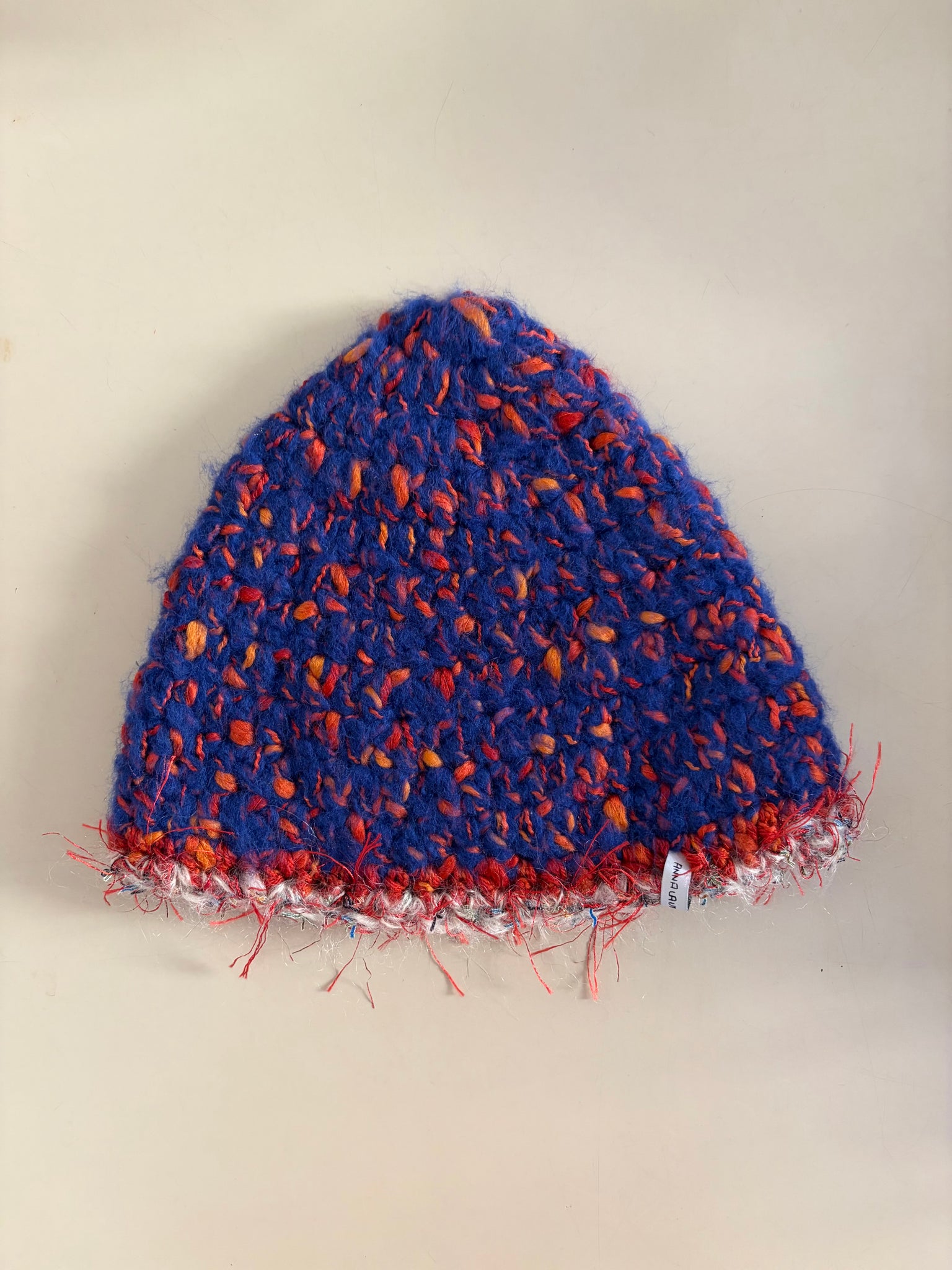 Berretto con forma leggermente a punta fatto a mano a uncinetto con filati misti sui toni del blu e arancio chiaro e scuro lavorati insieme per un effetto mélange. Frangetta sul bordo inferiore in filato con inserti in lurex.