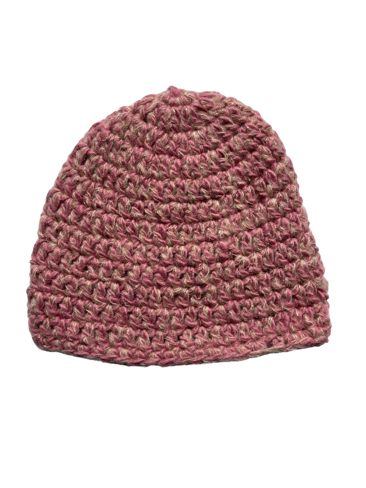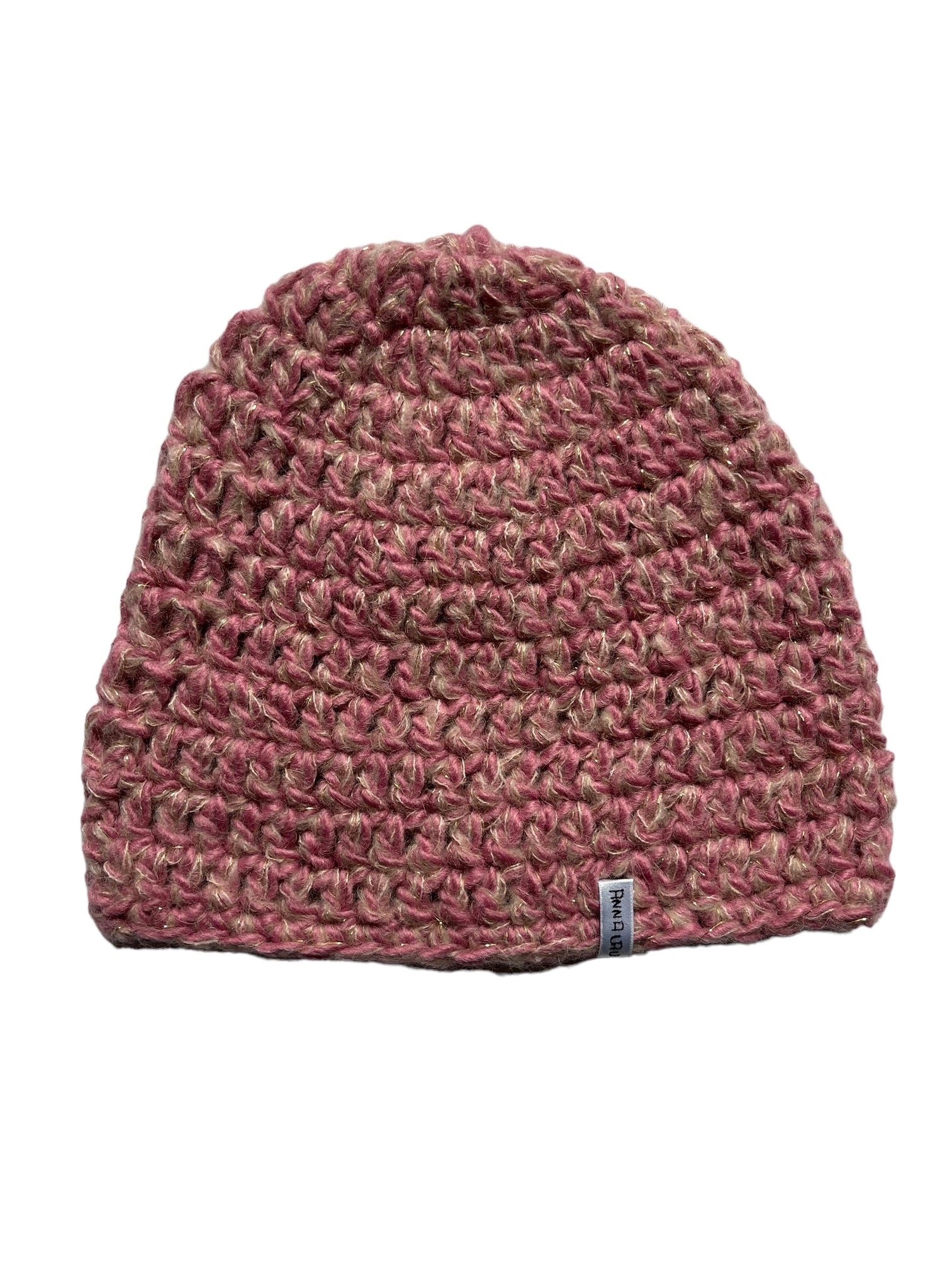 Berretto in lana rosa e rosa chiaro mélange e lurex oro, fatto a mano a uncinetto.
