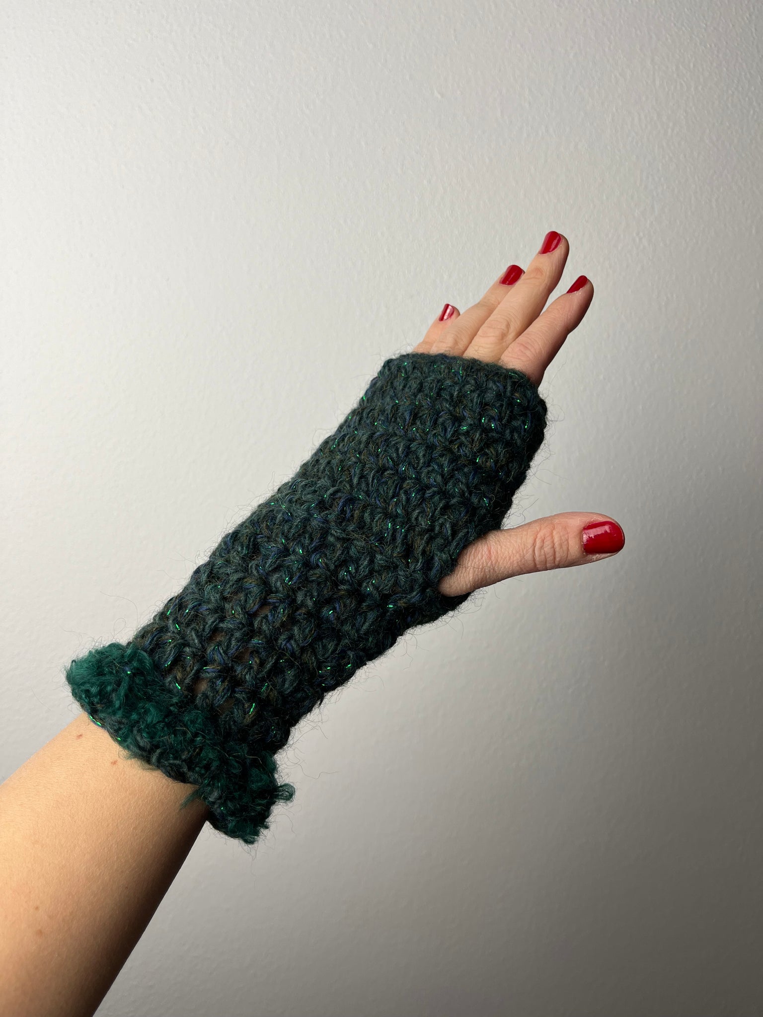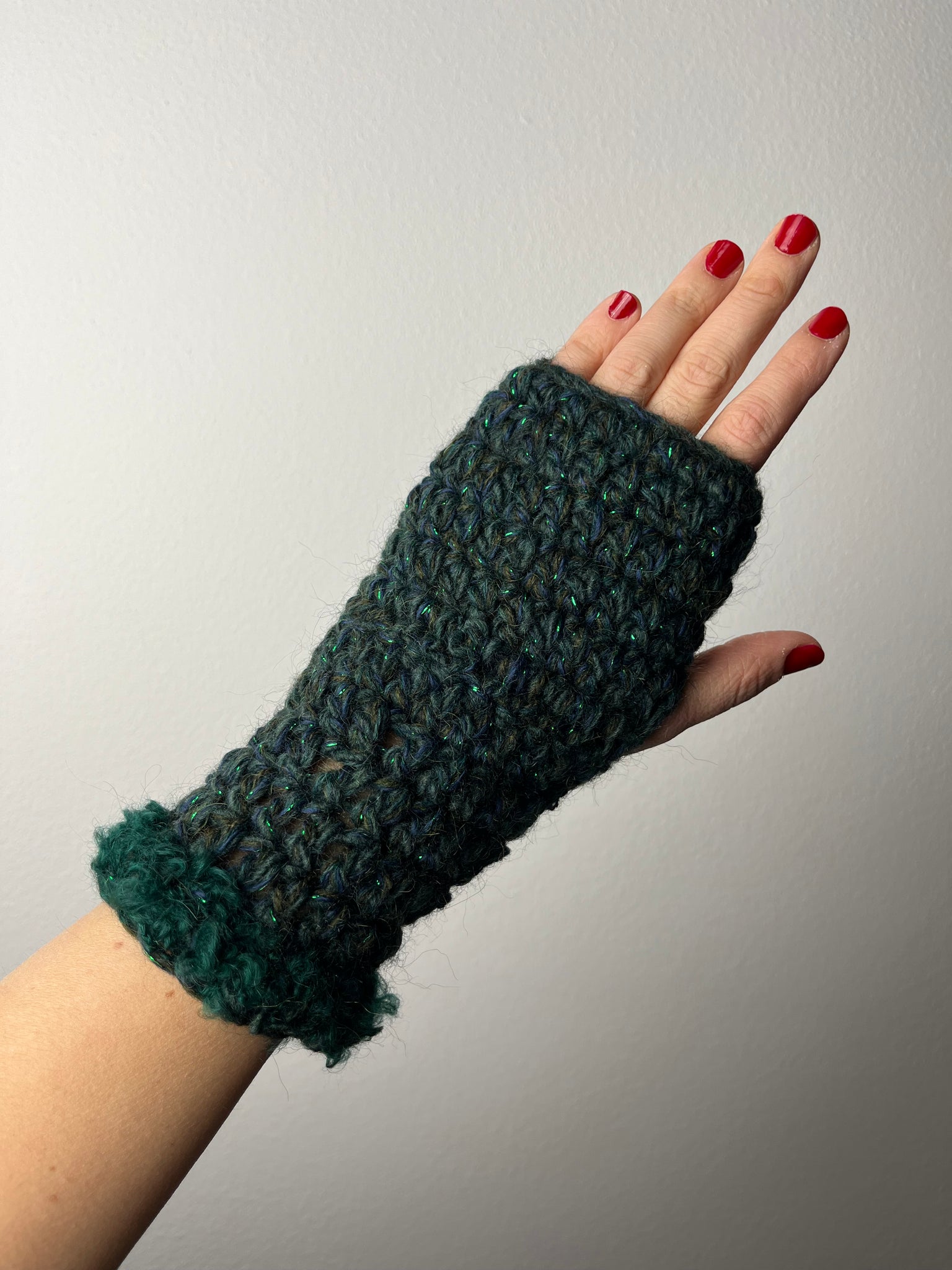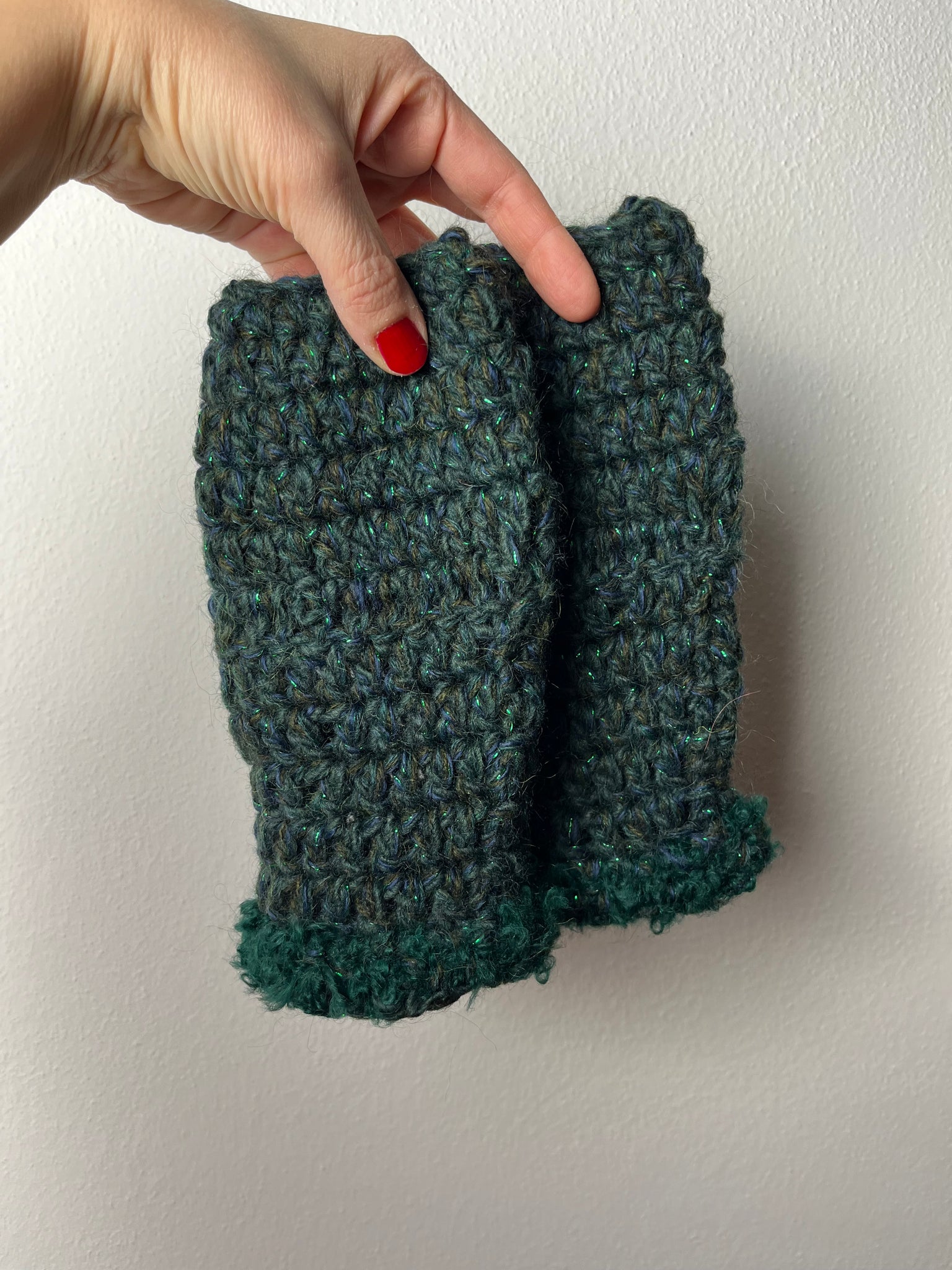 Manicotti fatti a mano in lane miste sui toni del verde scuro e blu lavorate insieme per un effetto mélange. Polsini in lana boucle’ verde bottiglia.