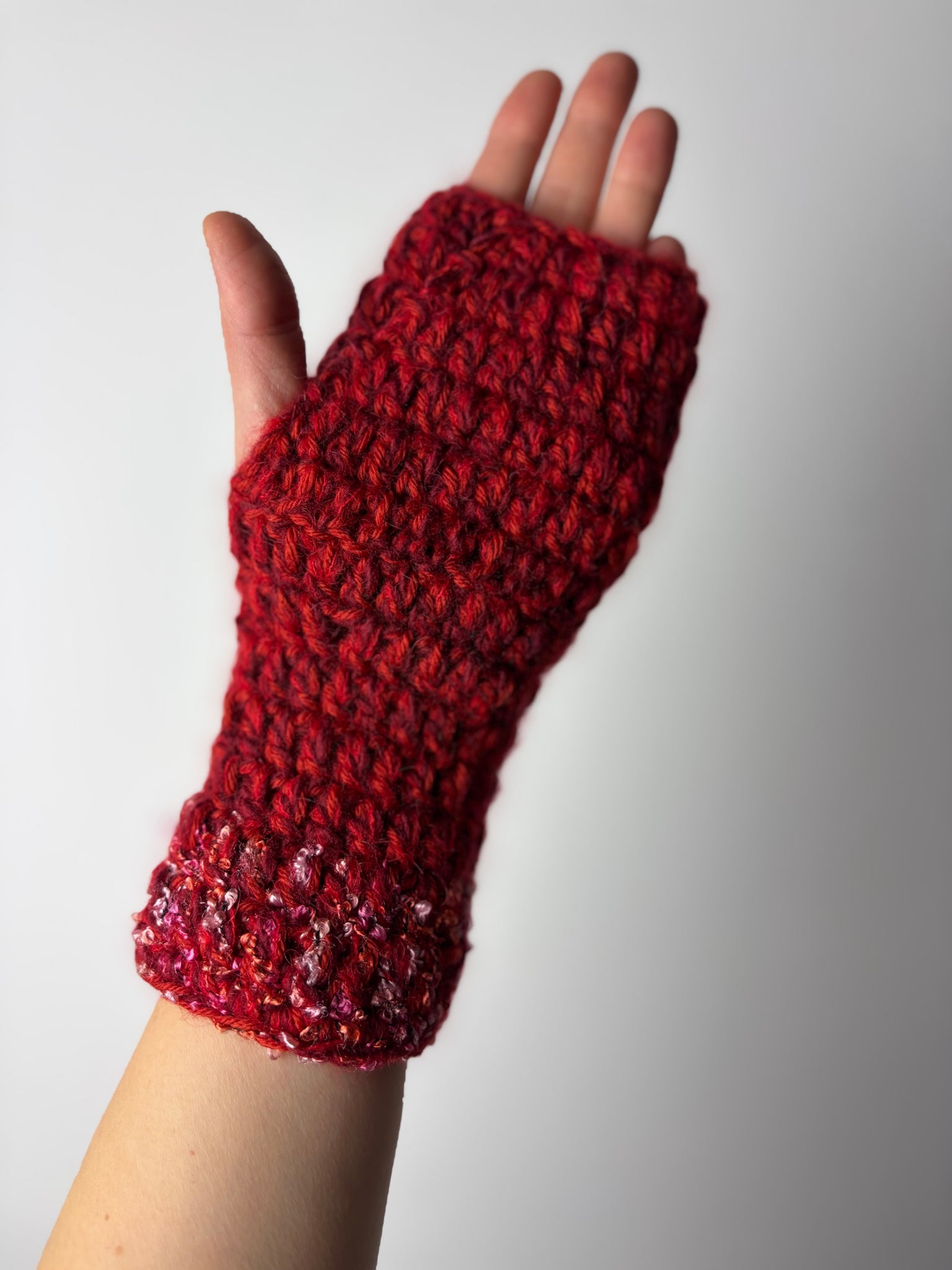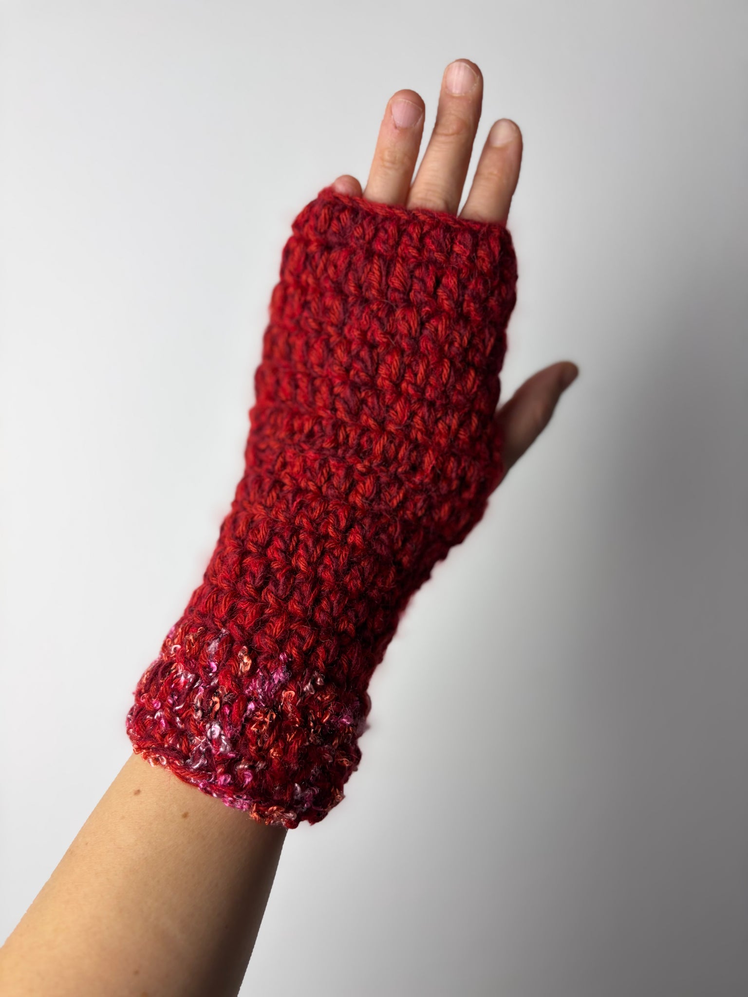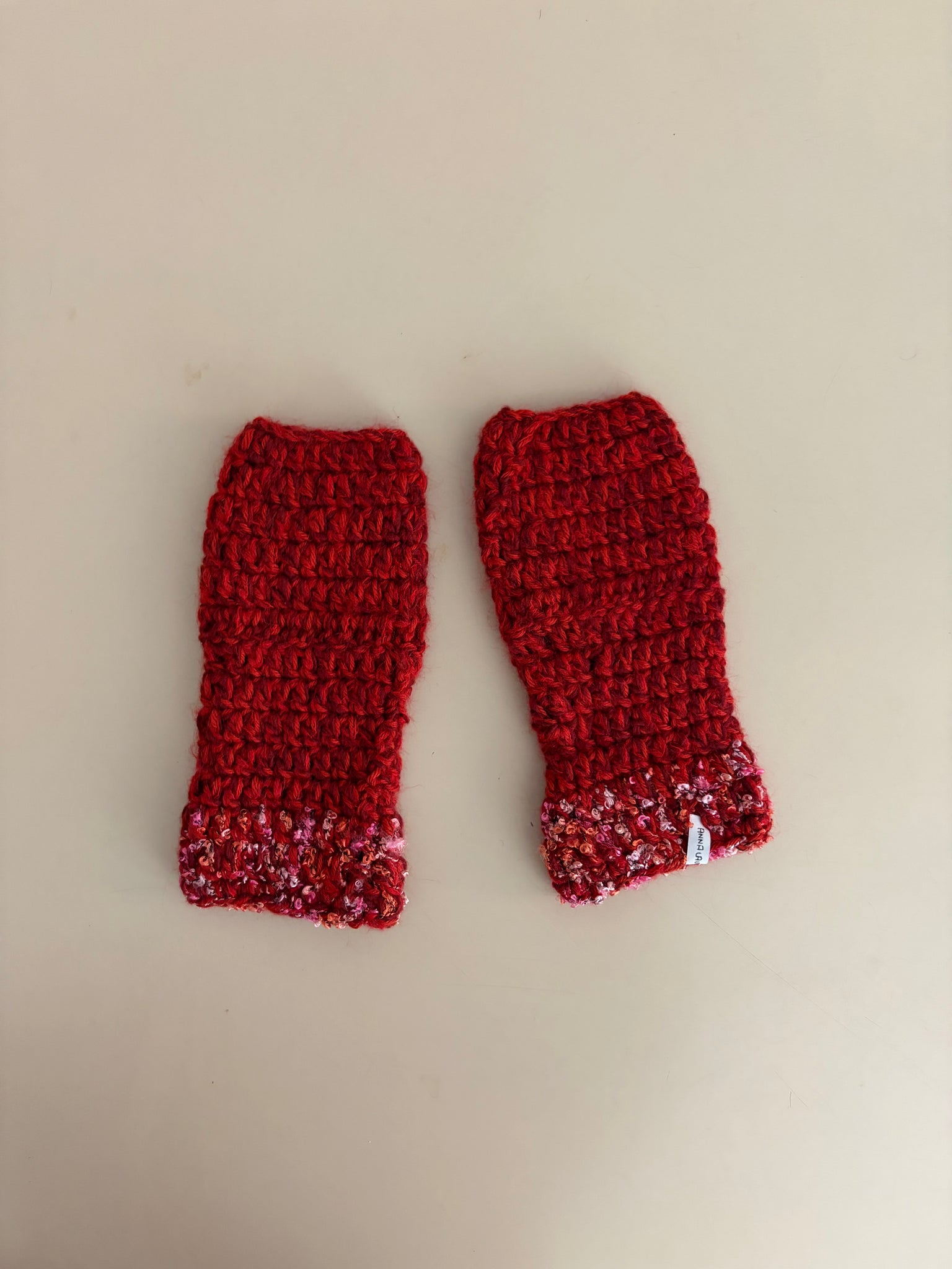 Manicotti fatti a mano in lane miste sui toni del rosso e vinaccia lavorate insieme per un effetto mélange e aggiunta di viscosa variopinta in rosa e arancio sul polsino.
