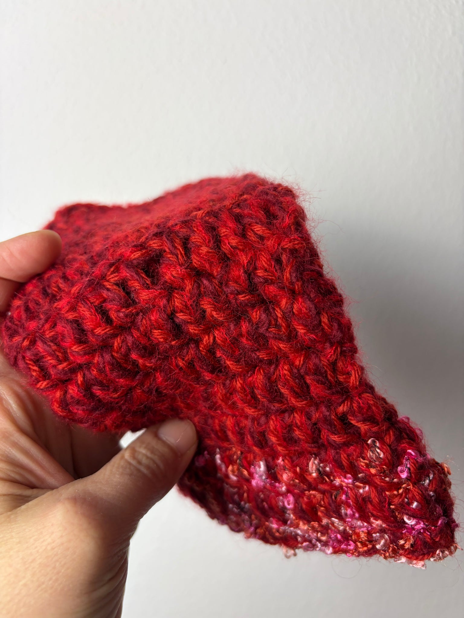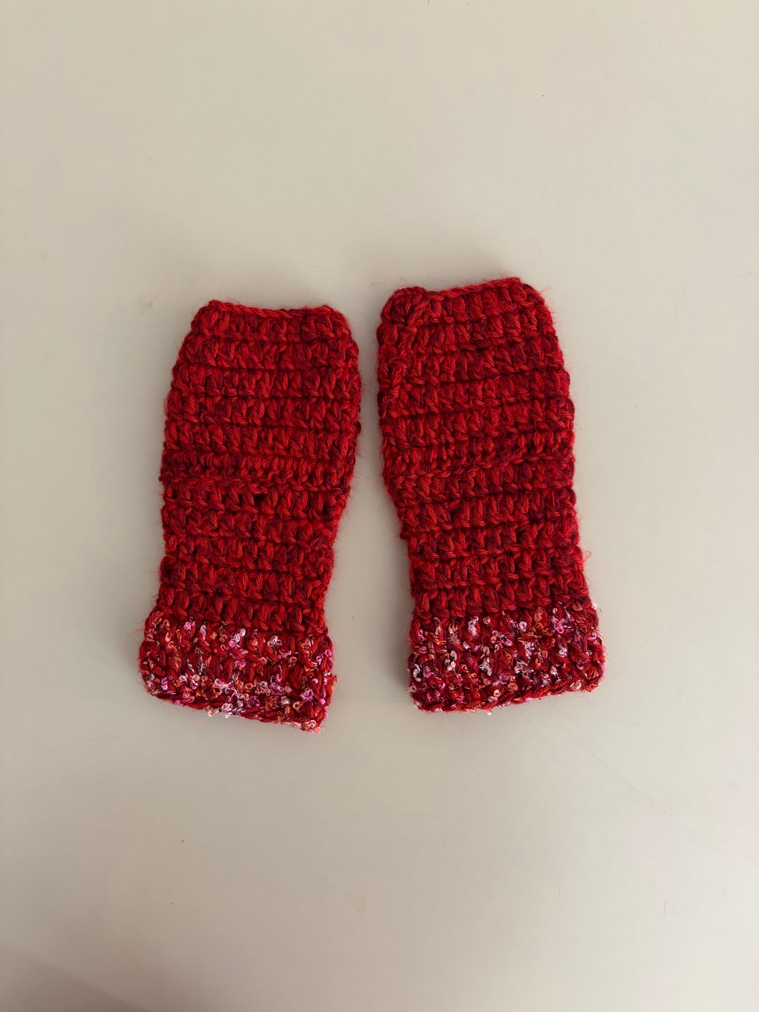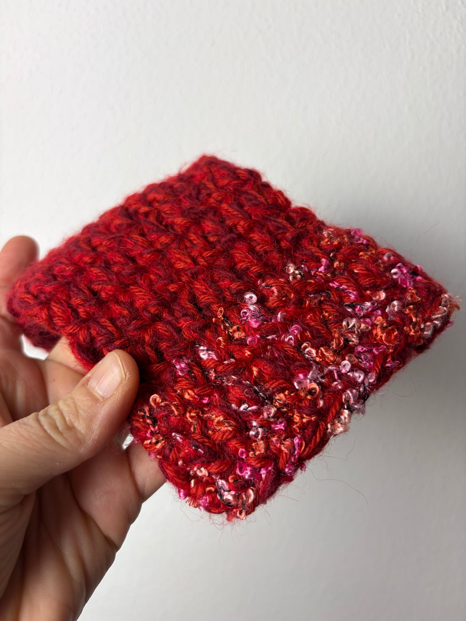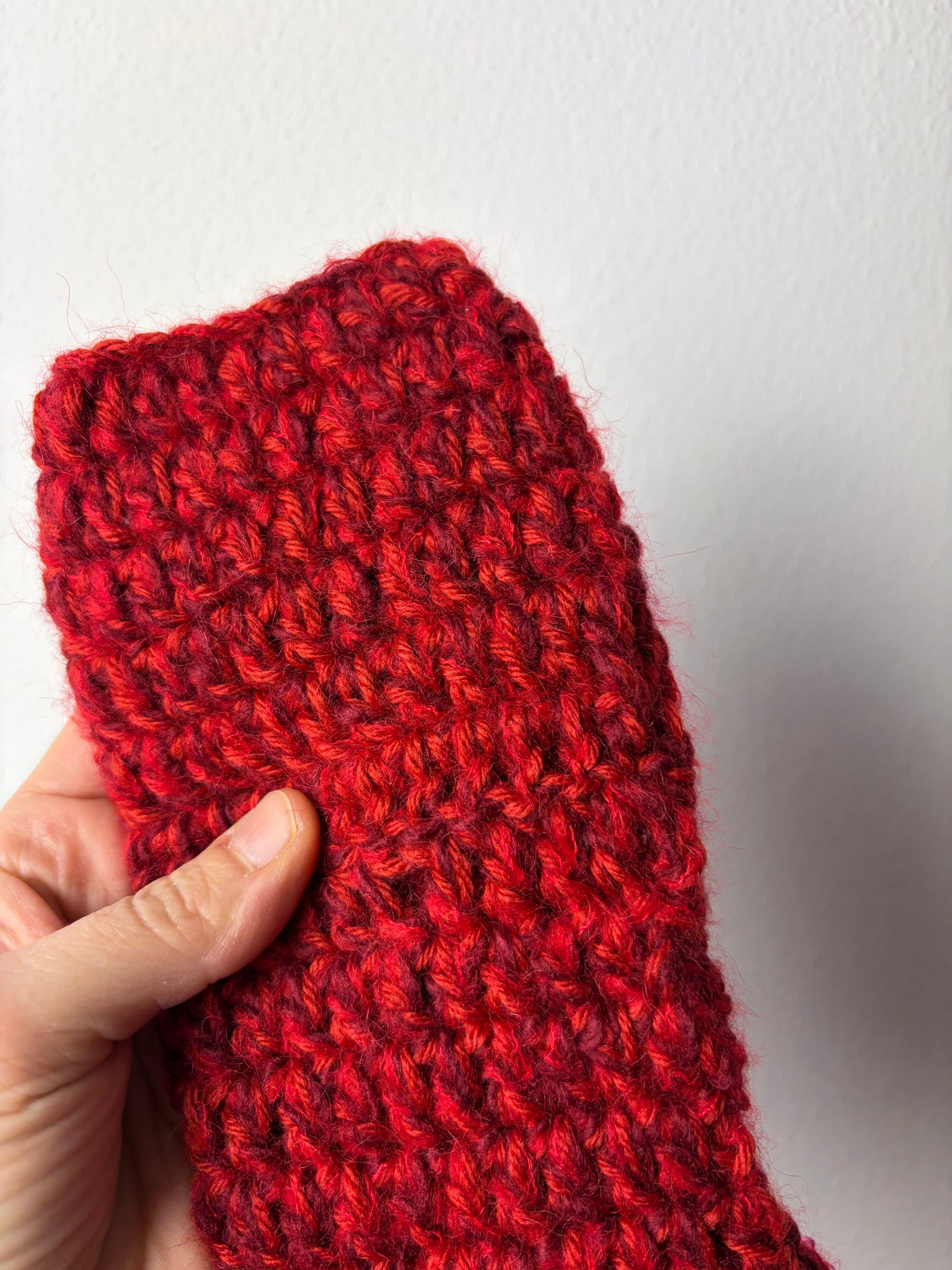 Manicotti fatti a mano in lane miste sui toni del rosso e vinaccia lavorate insieme per un effetto mélange e aggiunta di viscosa variopinta in rosa e arancio sul polsino.