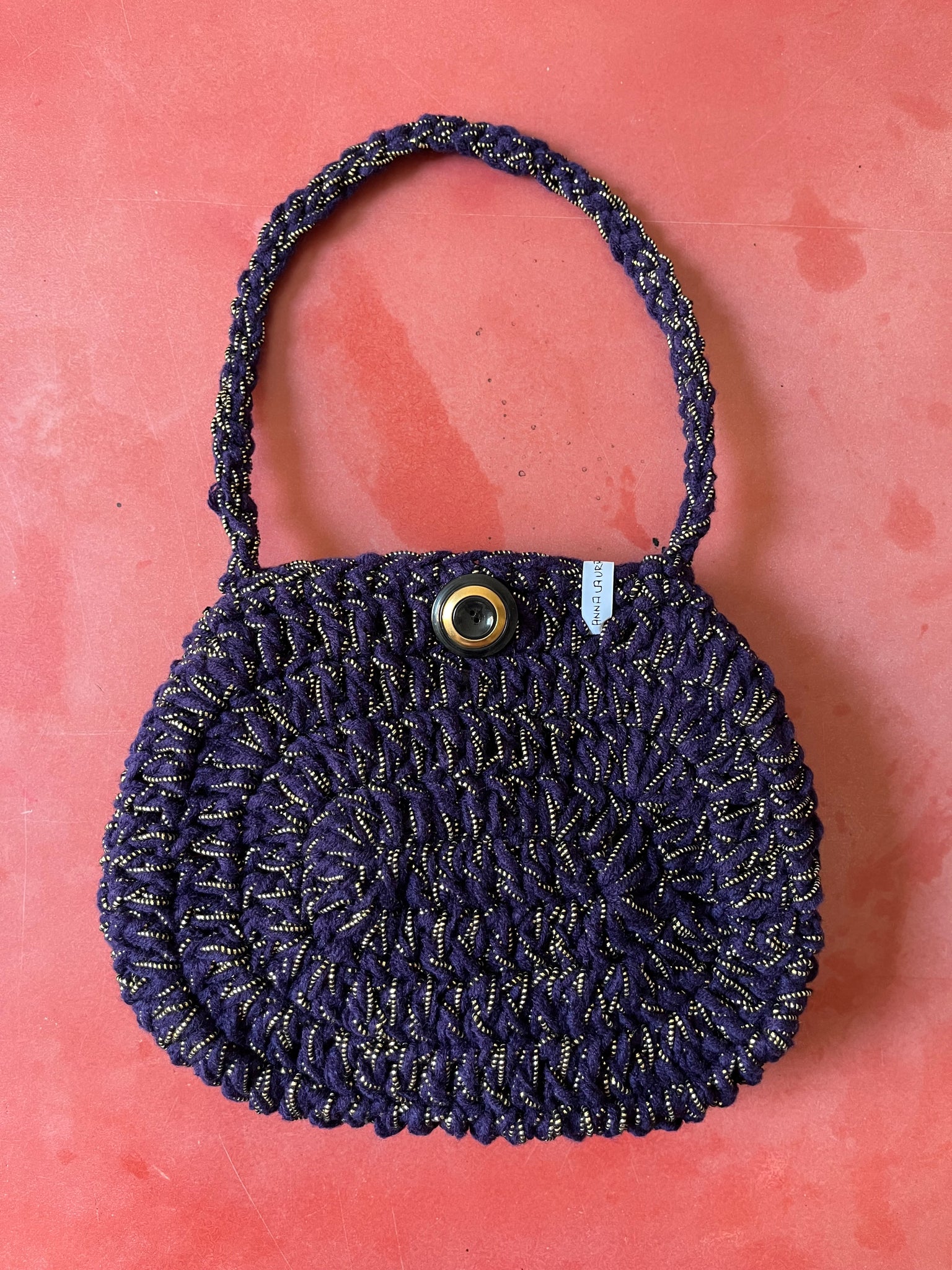 Borsa a pochette ovale fatta a mano a uncinetto in lana color melanzana e filato in cotone con lurex oro lavorati insieme per un effetto soffice e mélange. Chiusura con bottone e manico al gomito o a spalla tipo borsa baguette.