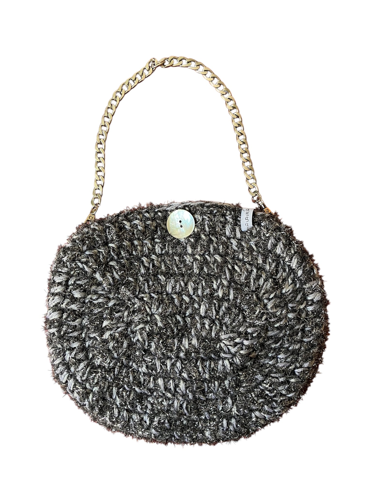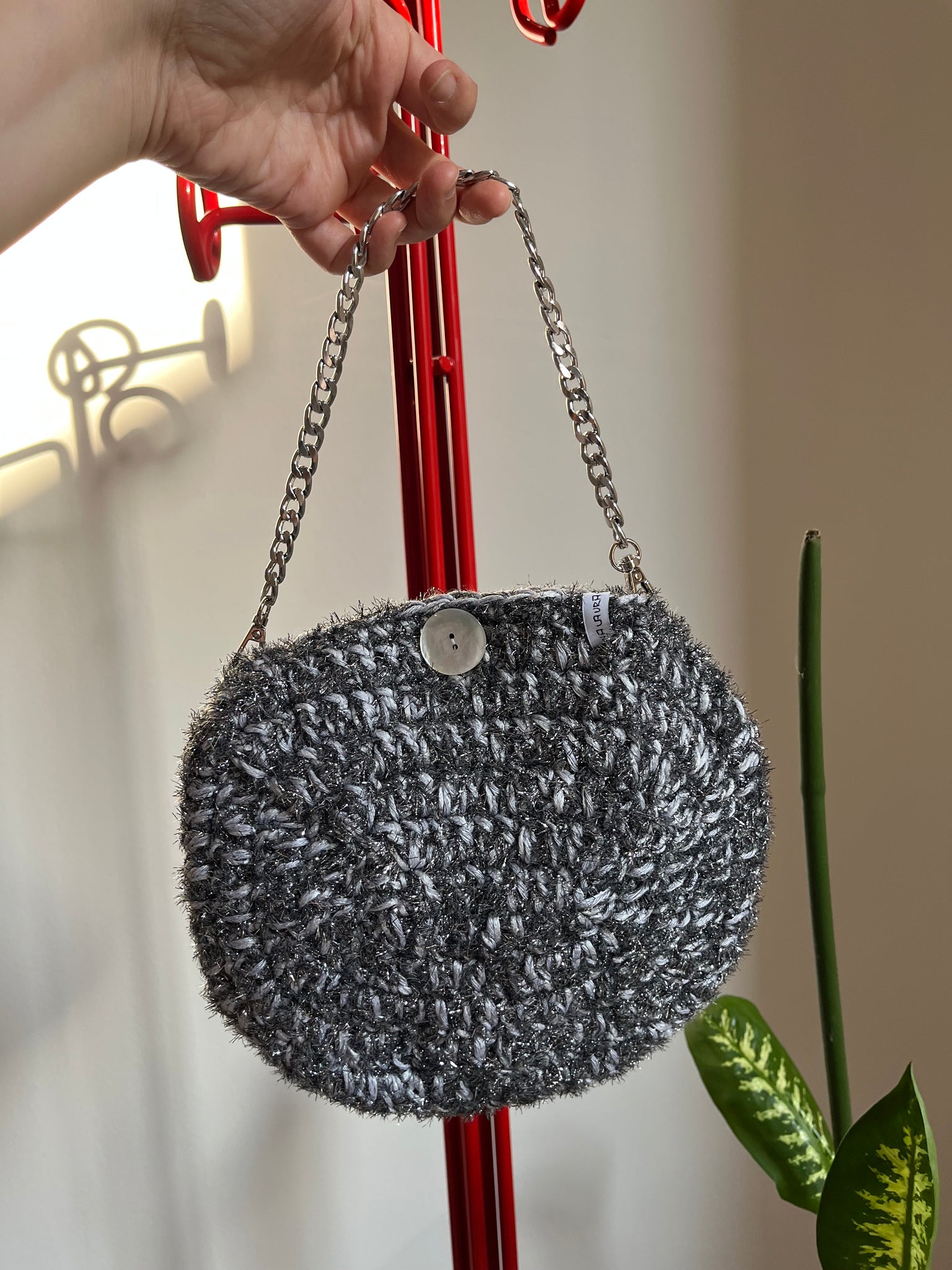 Borsa a pochette ovale fatta a mano a uncinetto in cotone color grigio chiaro e filato sintetico argento e grigio lavorati insieme per un effetto soffice e mélange. Chiusura con bottone e manico al gomito o a spalla tipo borsa baguette in lega color argento che può essere rimosso all’occorrenza a seconda degli usi.