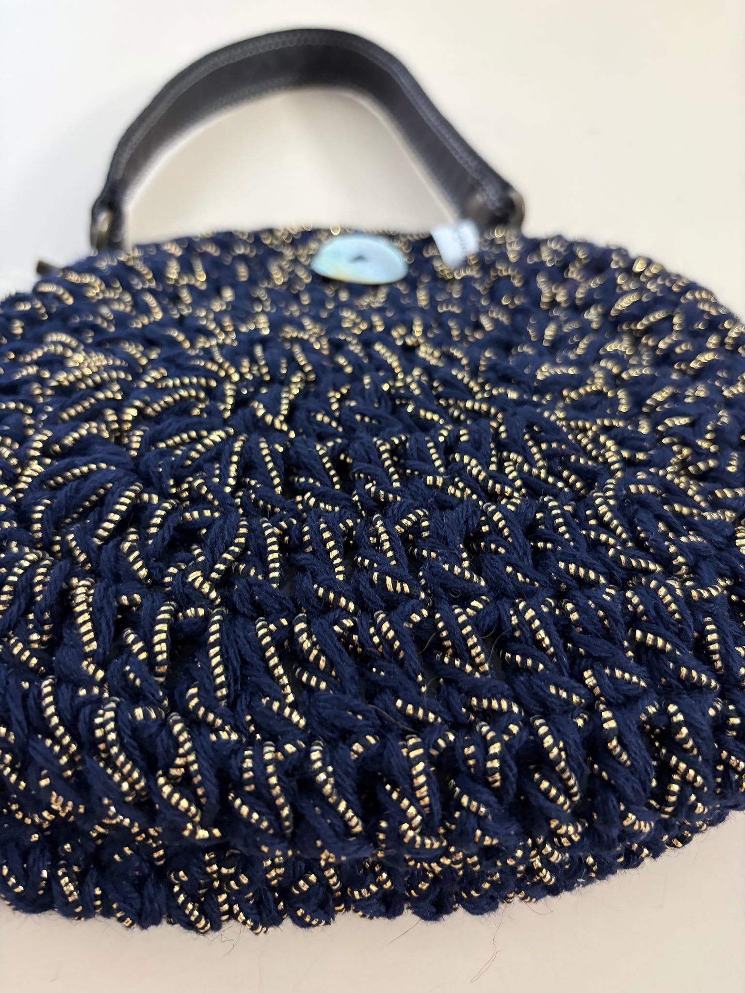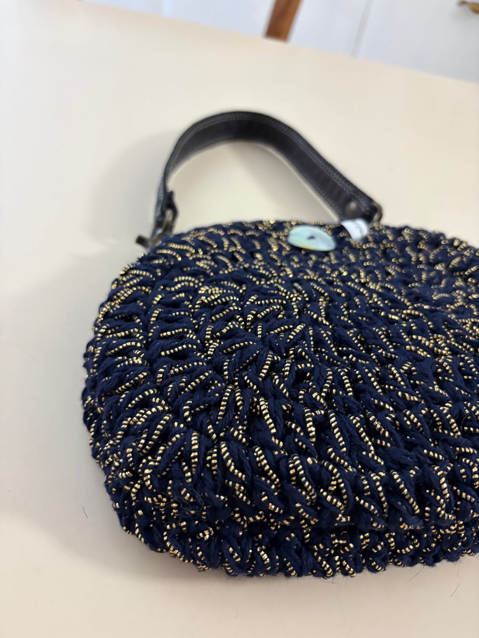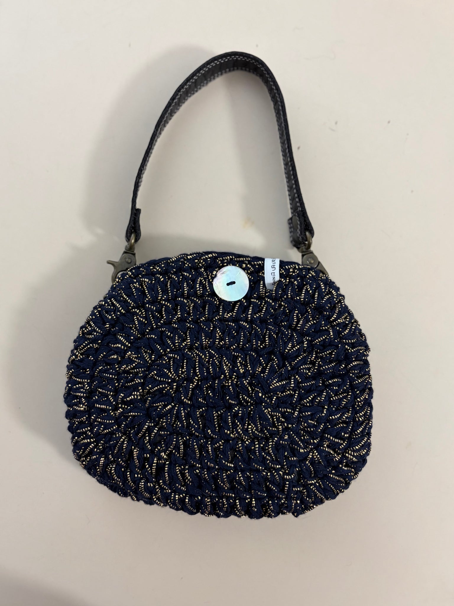 Borsa a pochette ovale fatta a mano a uncinetto in lana color viola scuro e filato in cotone con lurex oro lavorati insieme per un effetto soffice e mélange. Chiusura con bottone in madreperla e manico al gomito in pelle rimovibile all’occorrenza.
