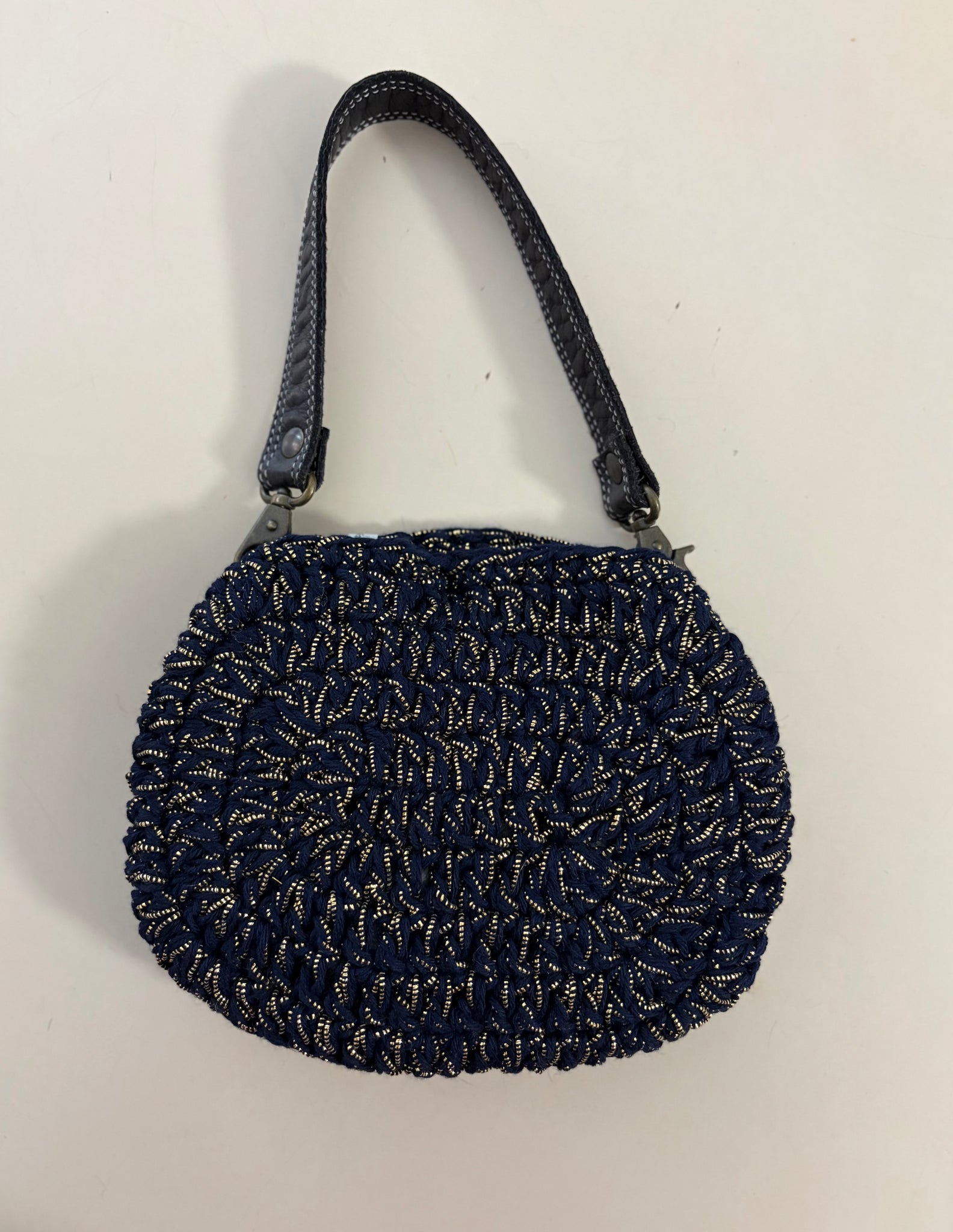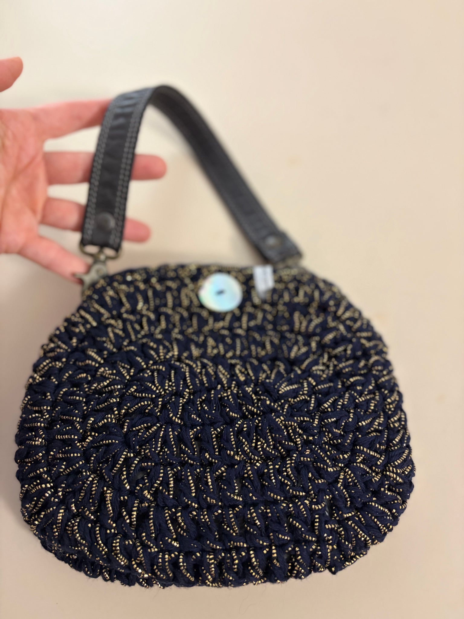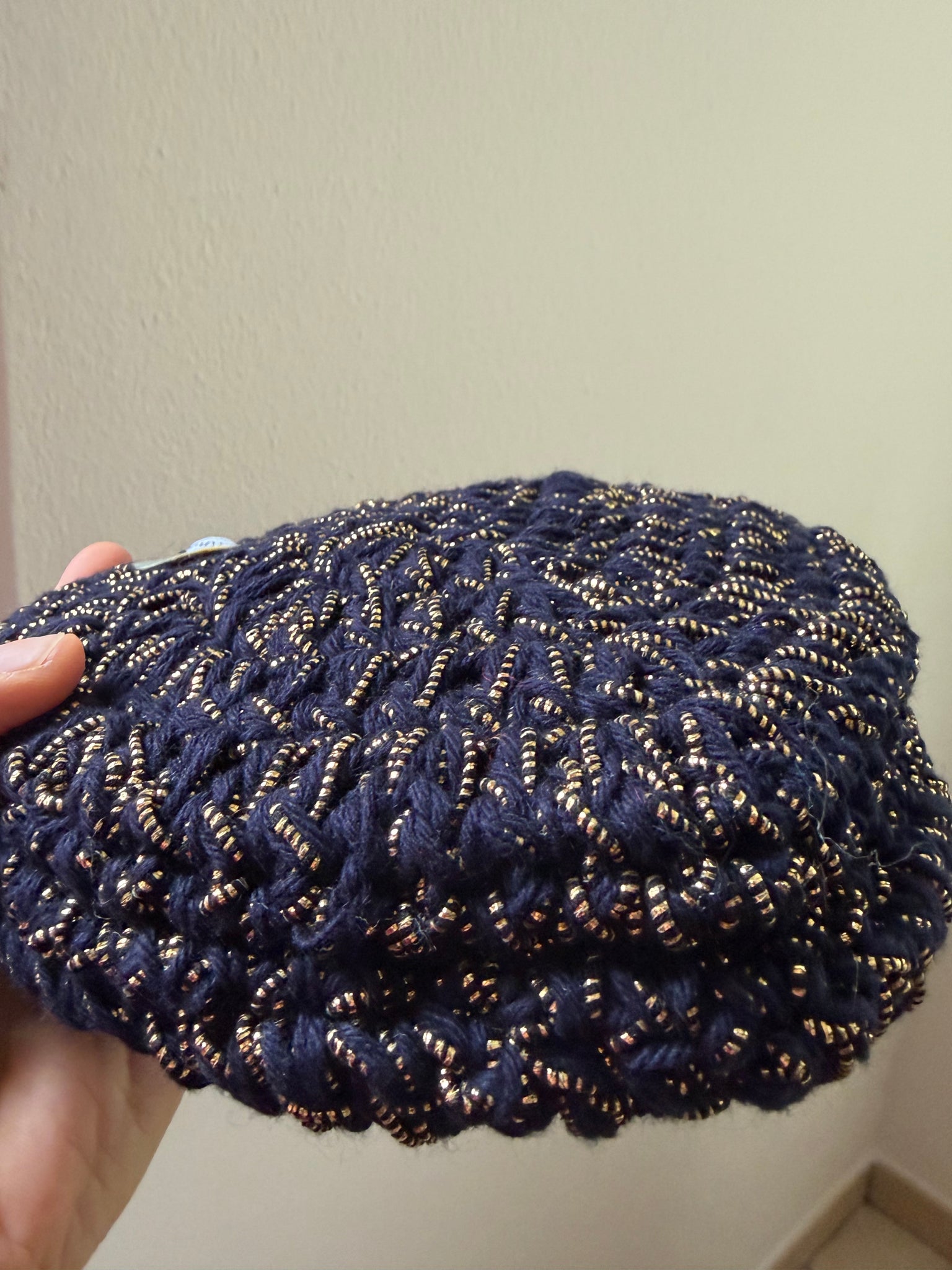 Borsa a pochette ovale fatta a mano a uncinetto in lana color viola scuro e filato in cotone con lurex oro lavorati insieme per un effetto soffice e mélange. Chiusura con bottone in madreperla e manico al gomito in pelle rimovibile all’occorrenza.