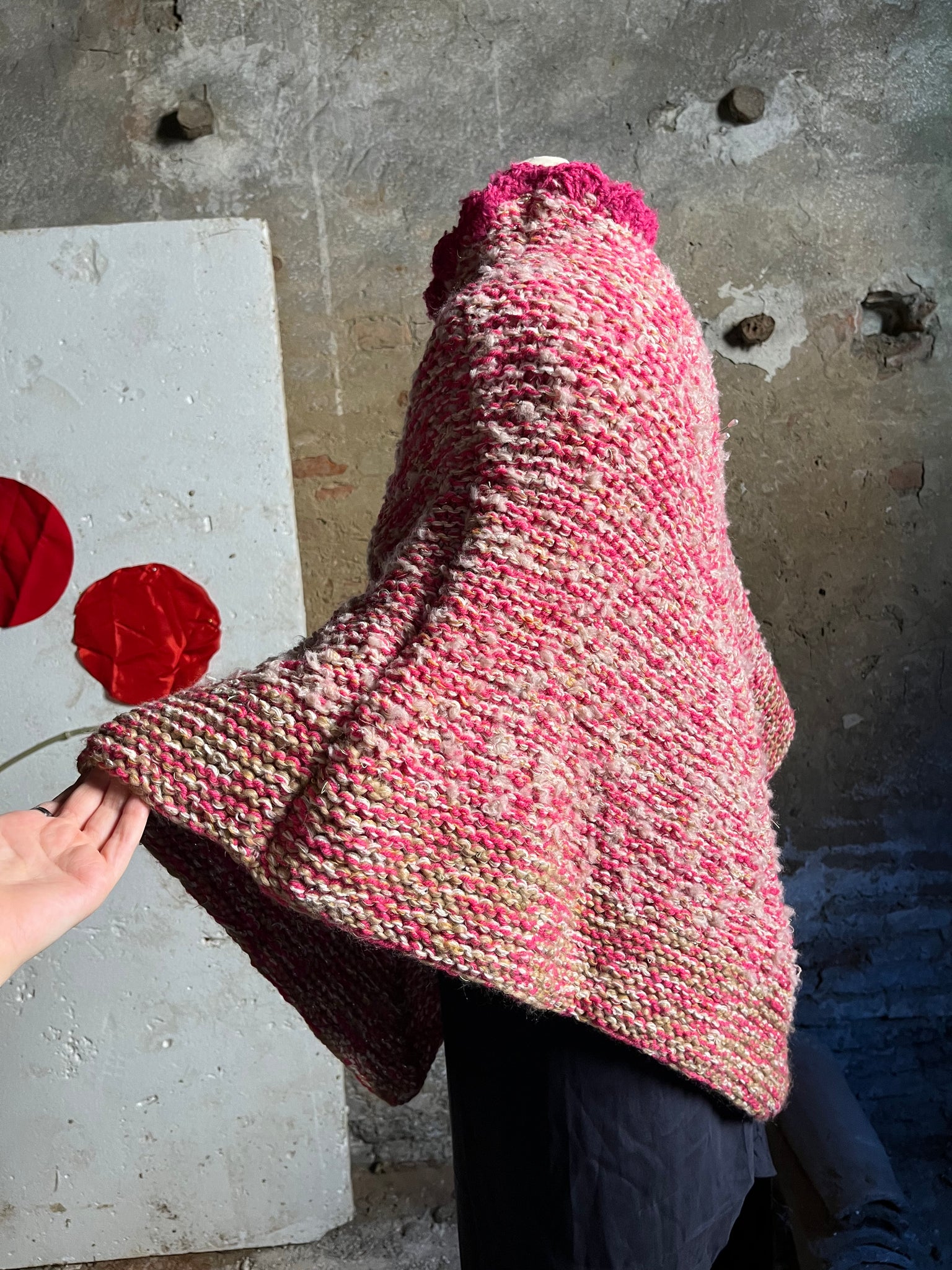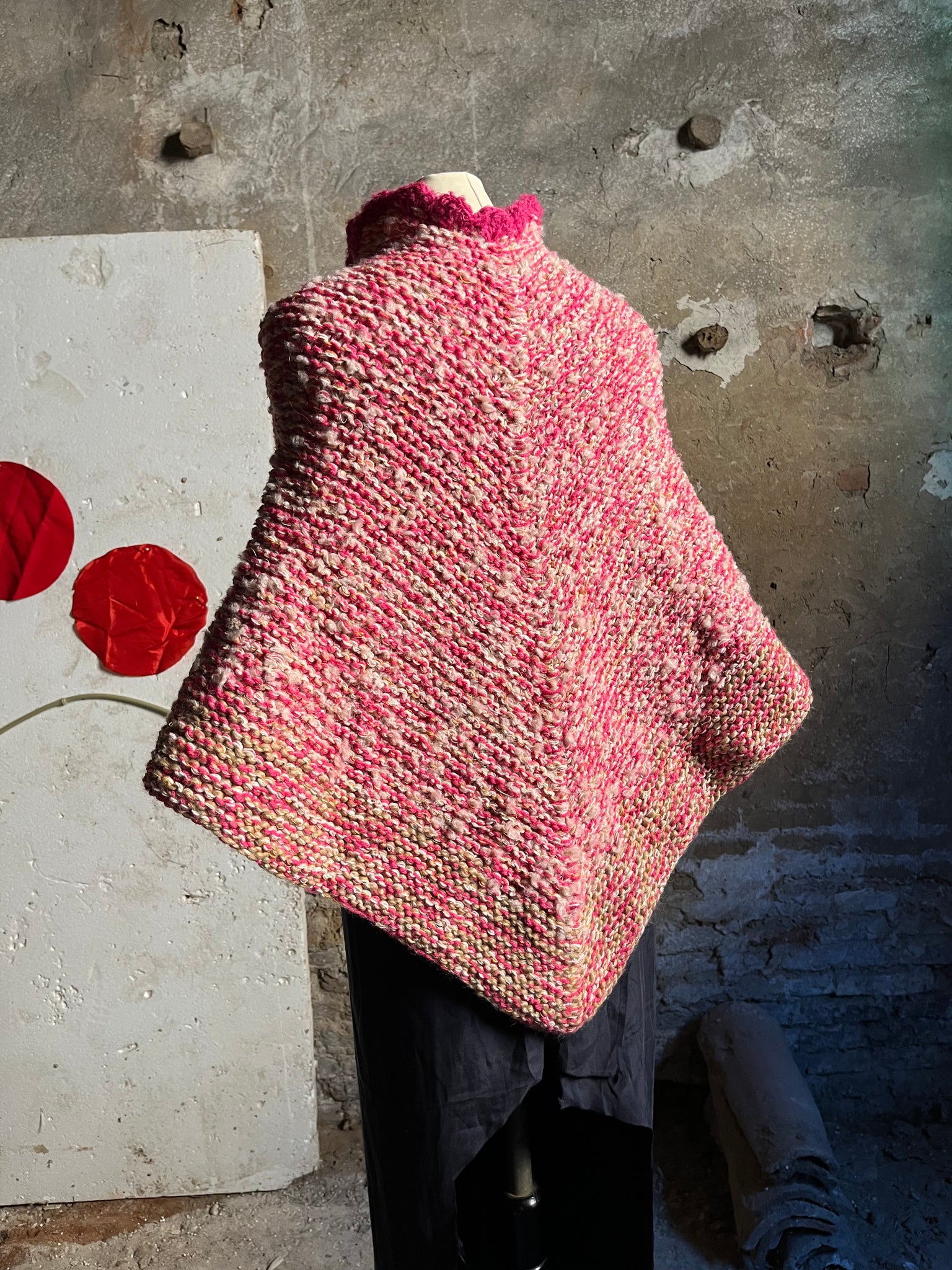 Poncho fatto a mano a ferri con lane miste nei toni beige, bianco, rosa chiaro e fuxia e un sottile filo in lurex argento brillante che dona luce al capo. Finitura a uncinetto sullo scollo.