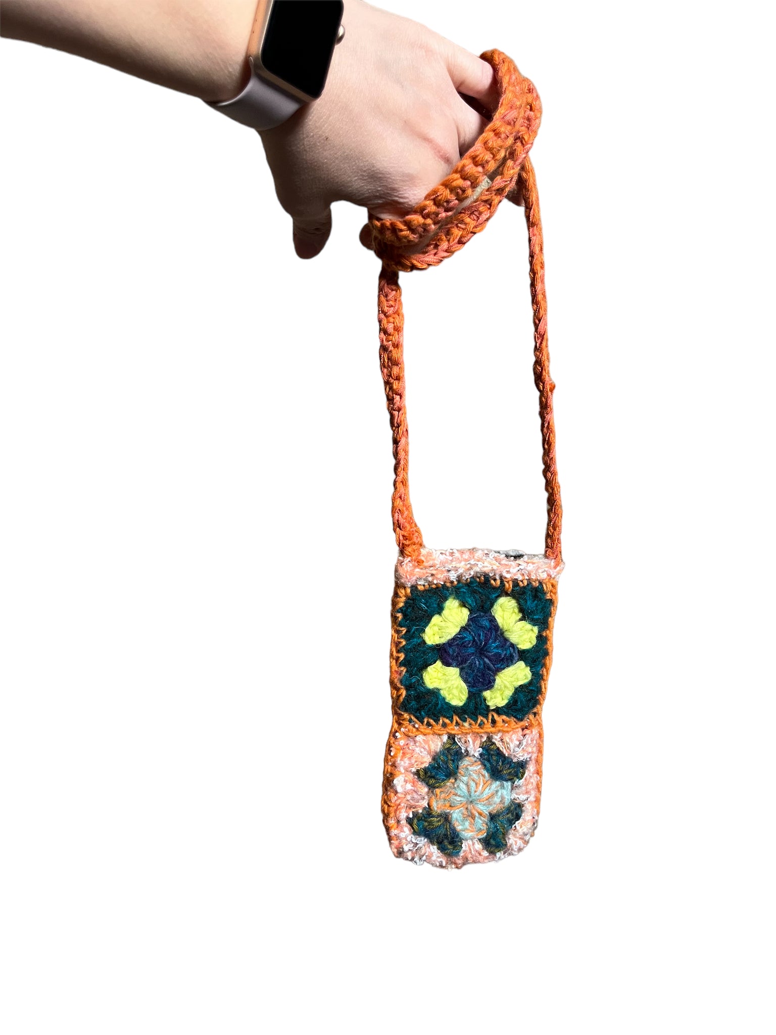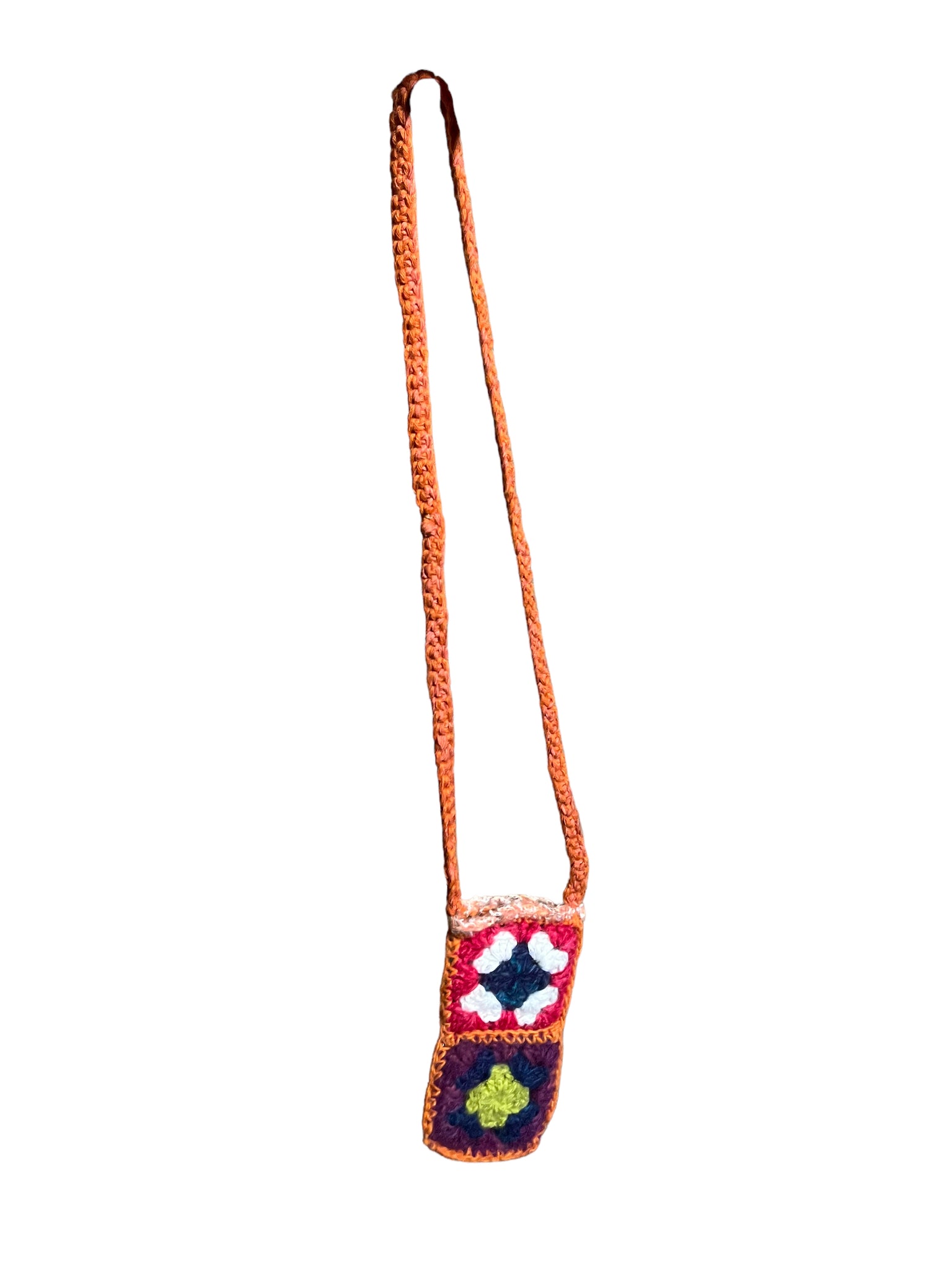 Porta cellulare in lana con tracolla. Fantasia floreale diversa sui due fronti.