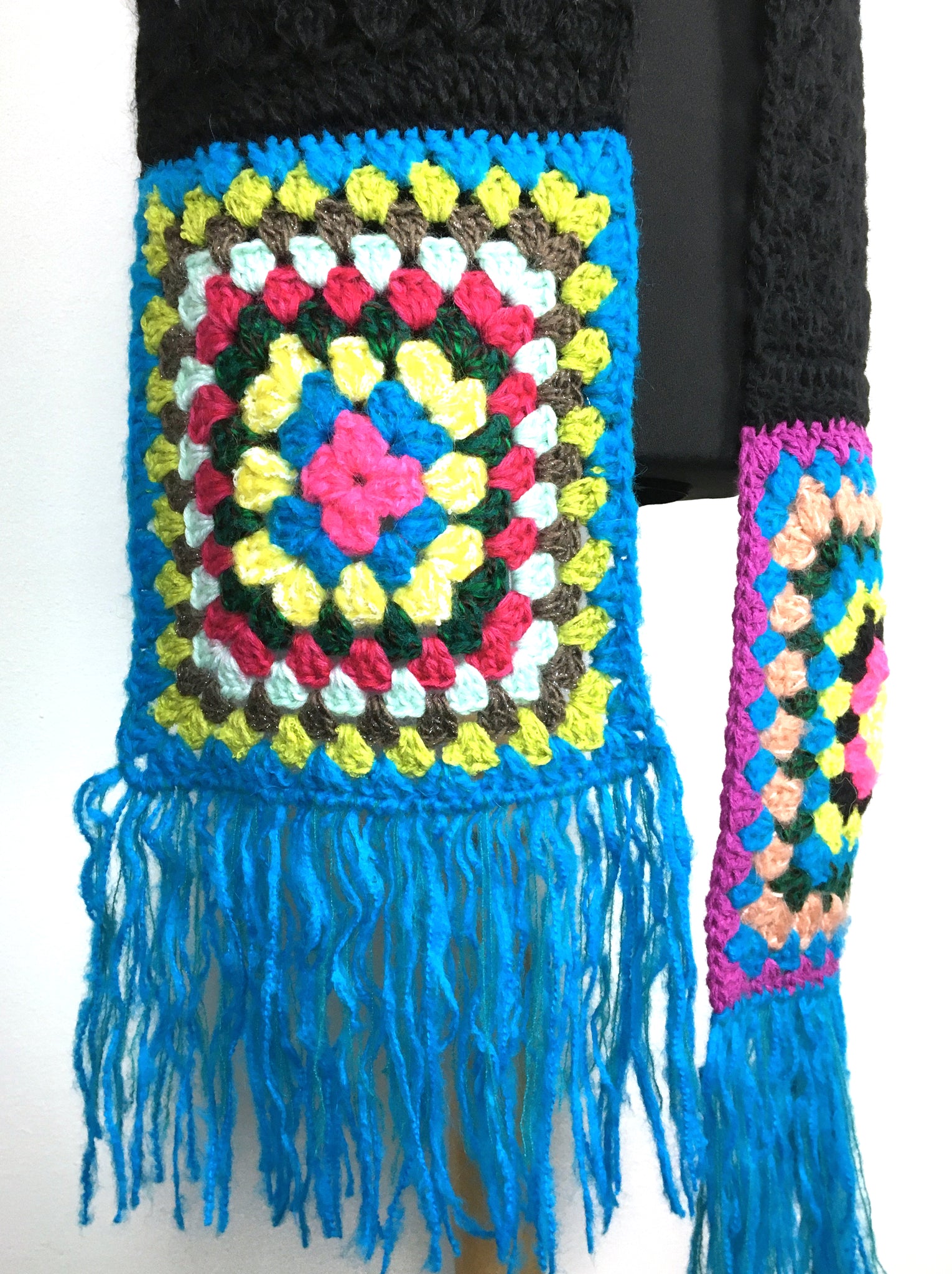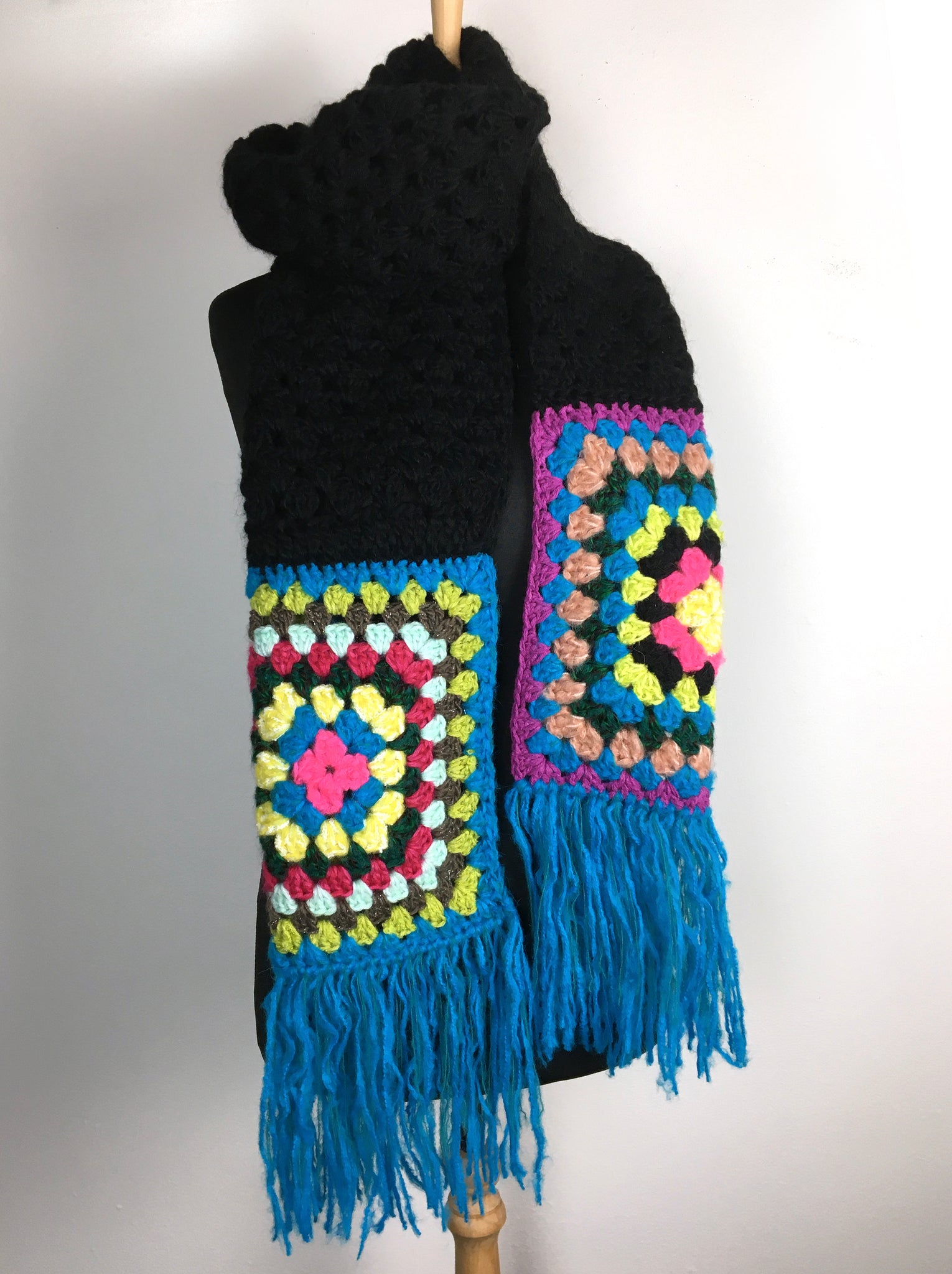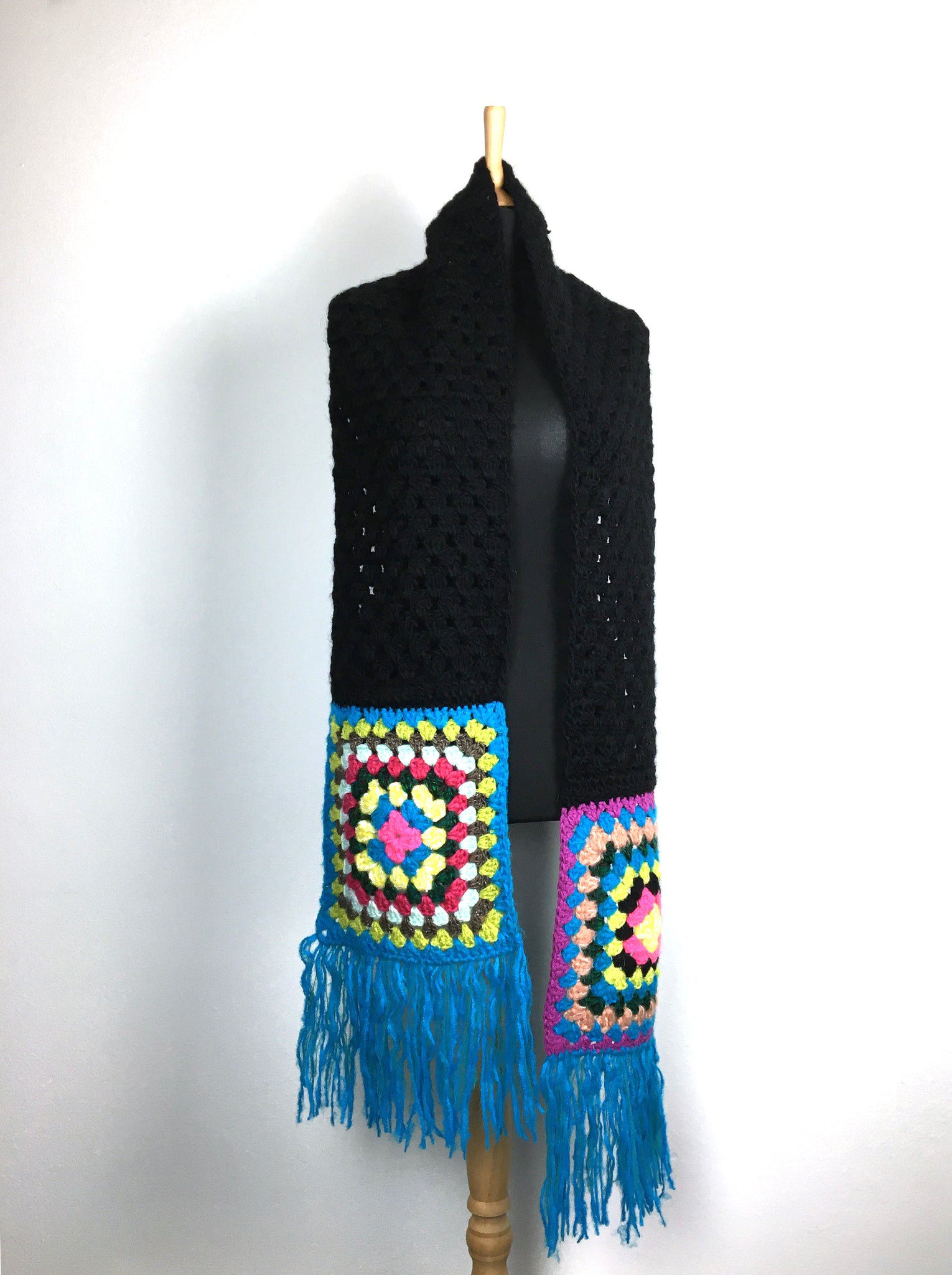 Sciarpa in lana fatta a mano a uncinetto. Parte centrale in lana morbida nera e quadrotti multicolor con frange alle estremità.