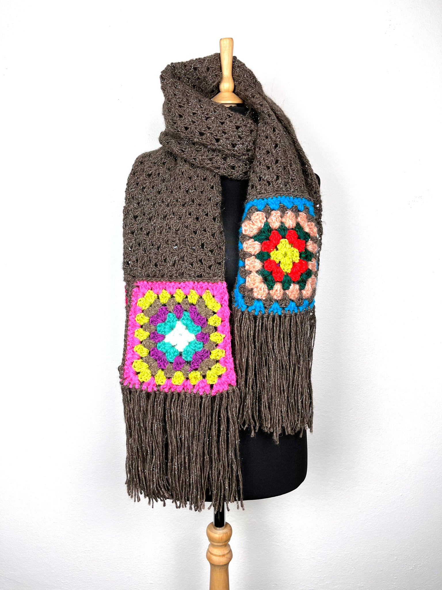 Handmade crochet wool scarf. Light brown wool with lurex in the body and colorful granny square at the ends.