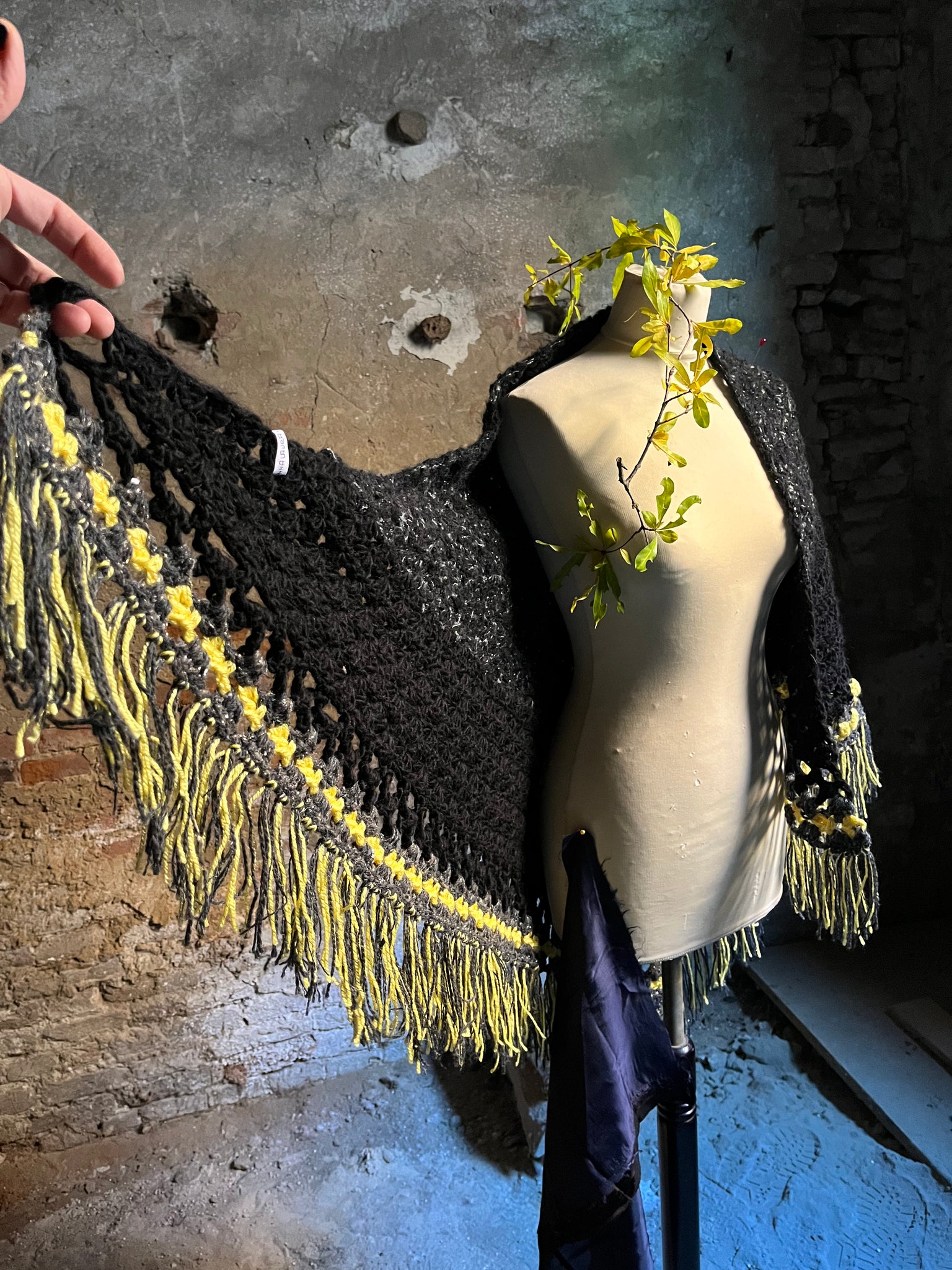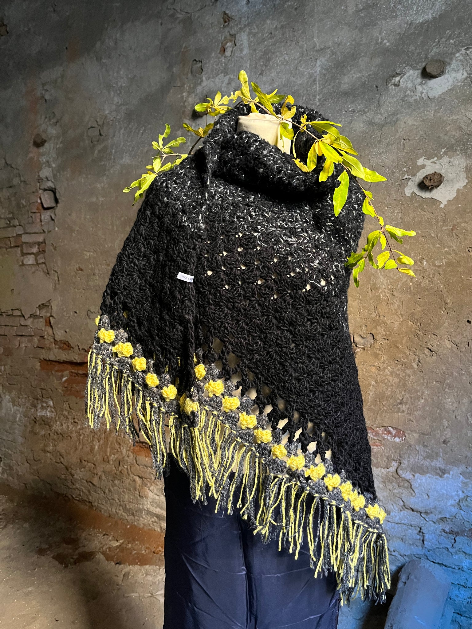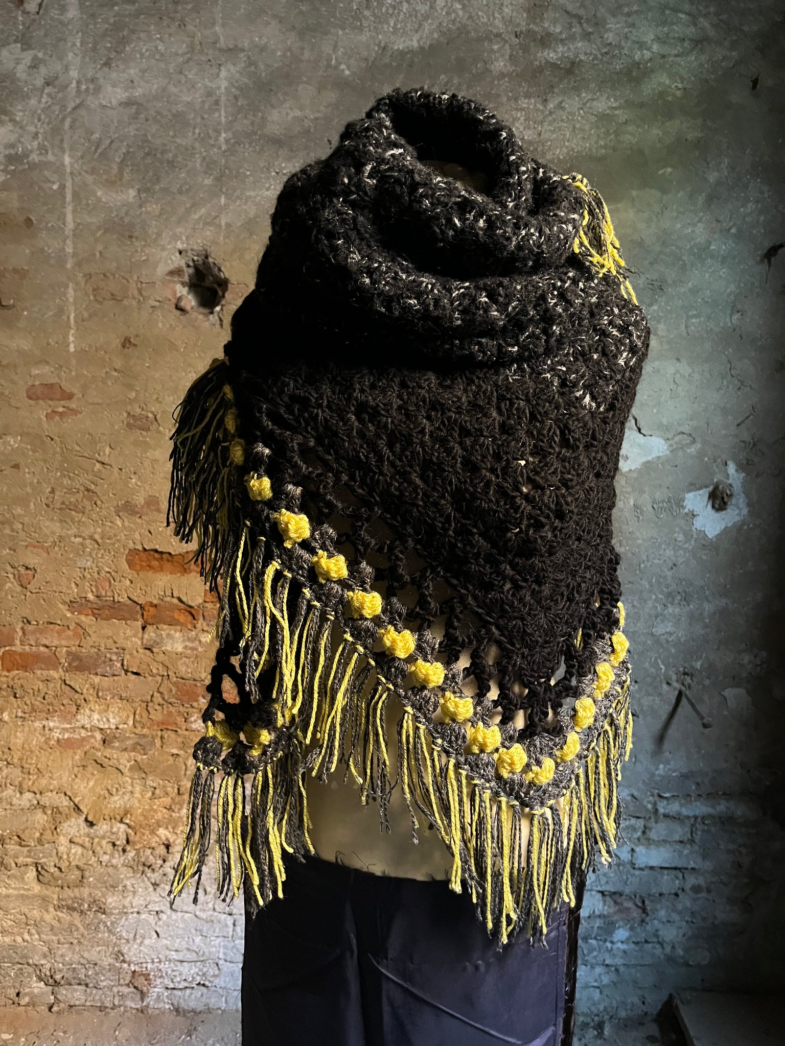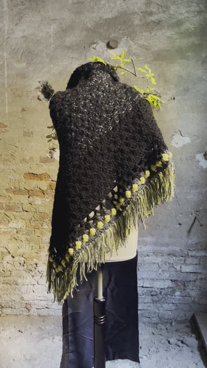 Scialle con frange fatto a mano a uncinetto in lana e lurex. Toni nero/grigio scuro e giallo per dettagli a contrasto.