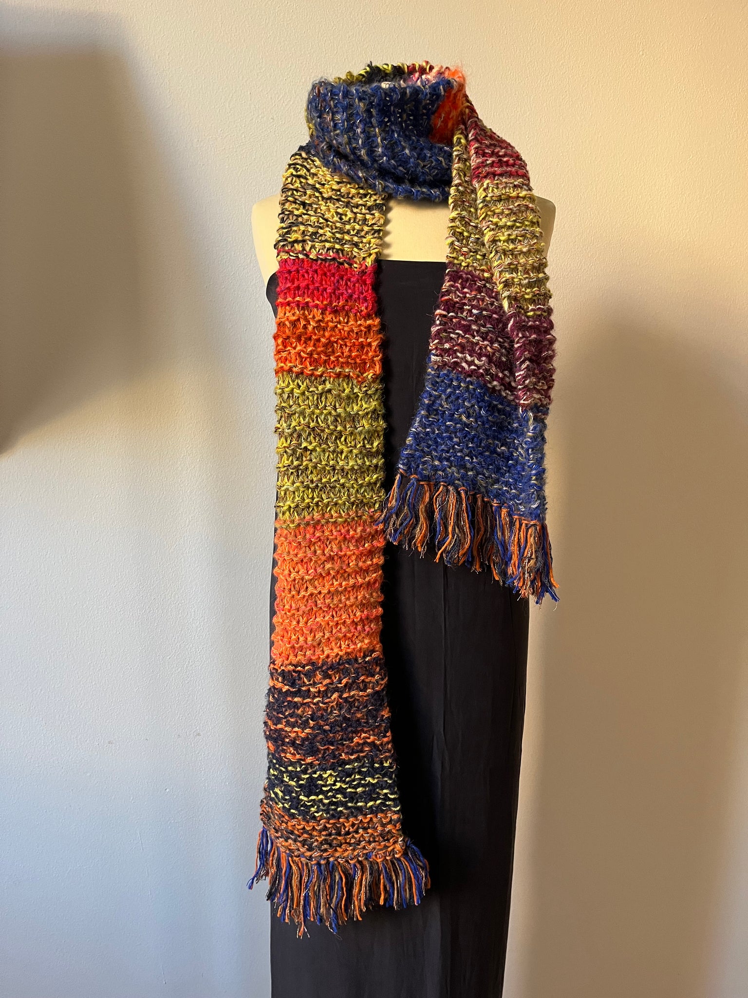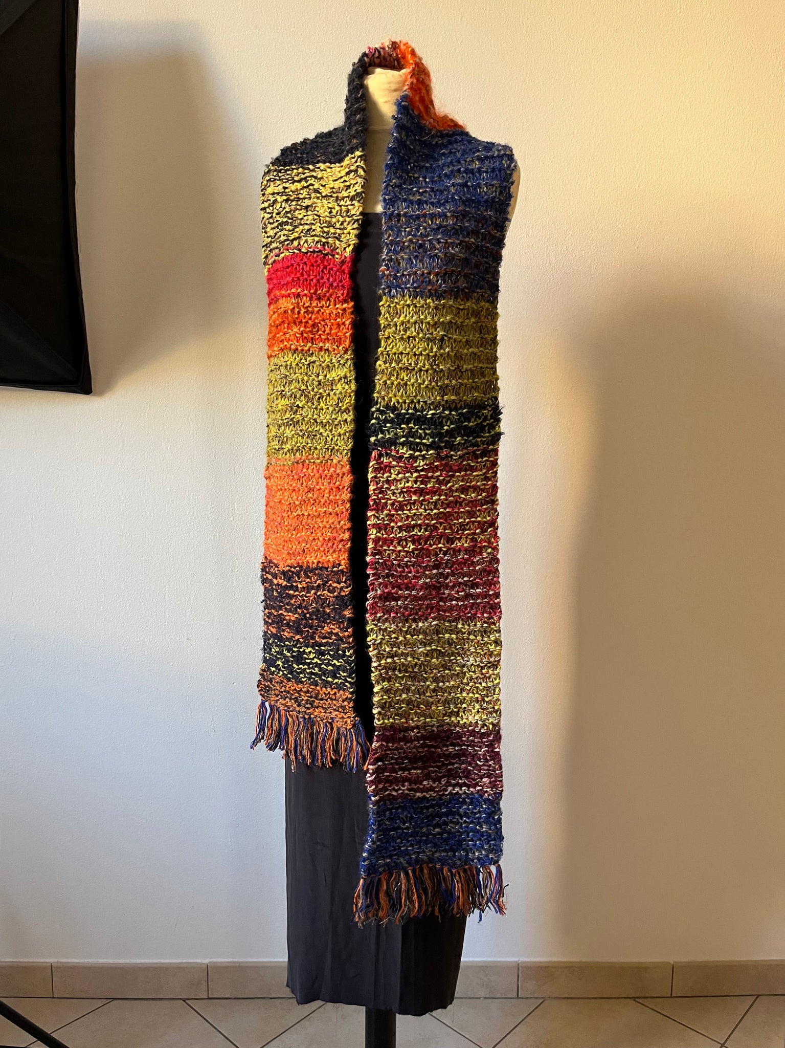 Sciarpa in lana multicolor con pizzico di lurex lavorata a ferri.