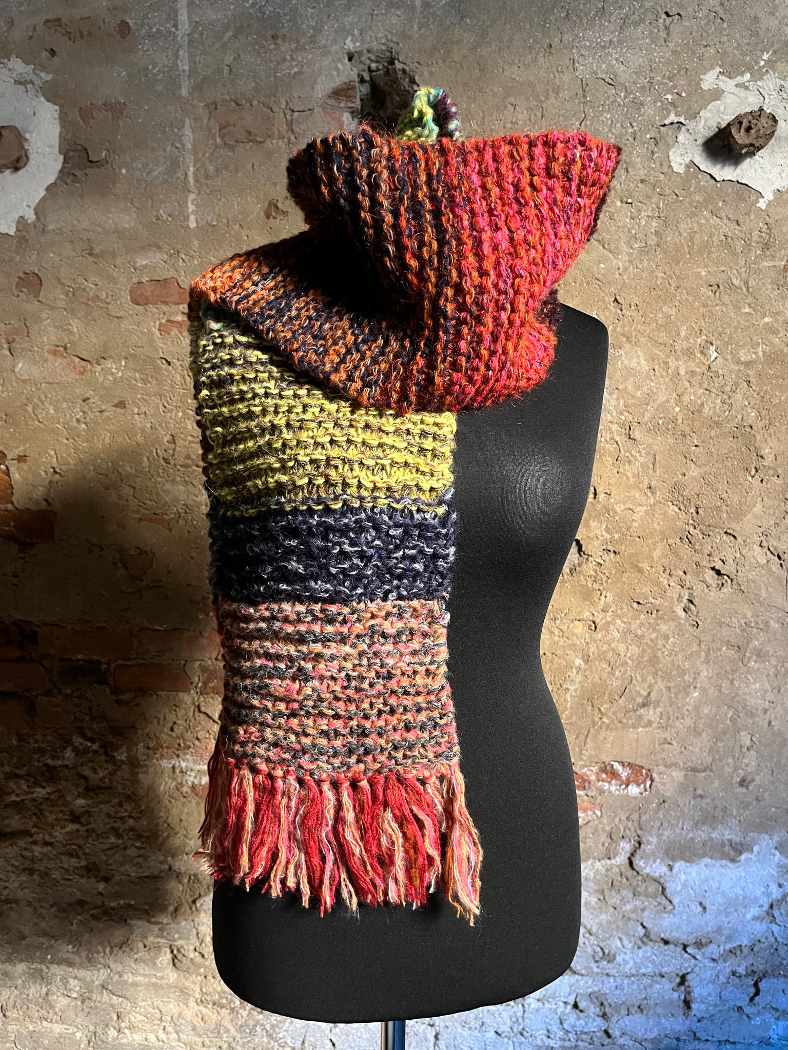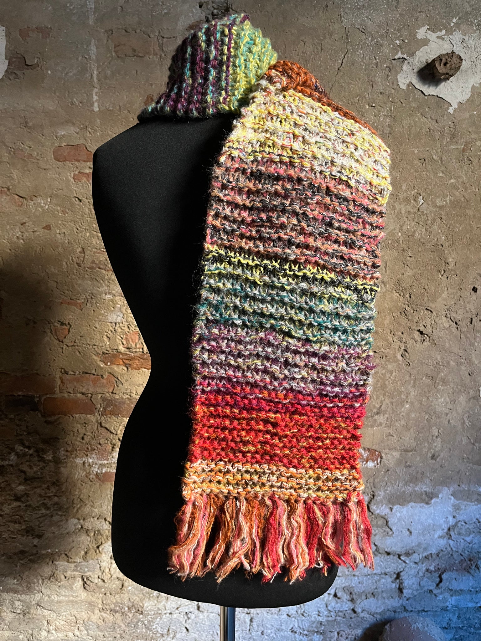Sciarpa in lana multicolor con pizzico di lurex lavorata a ferri.